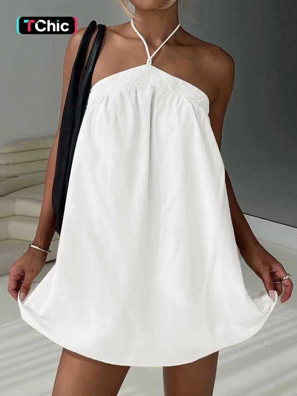 Women's Solid Color Halter Neck Tie Shoulder Cami Dress, Halter Strap Dress, Casual Sleeveless A Line Dress for Summer, Ladies Clothes for Beach Holiday