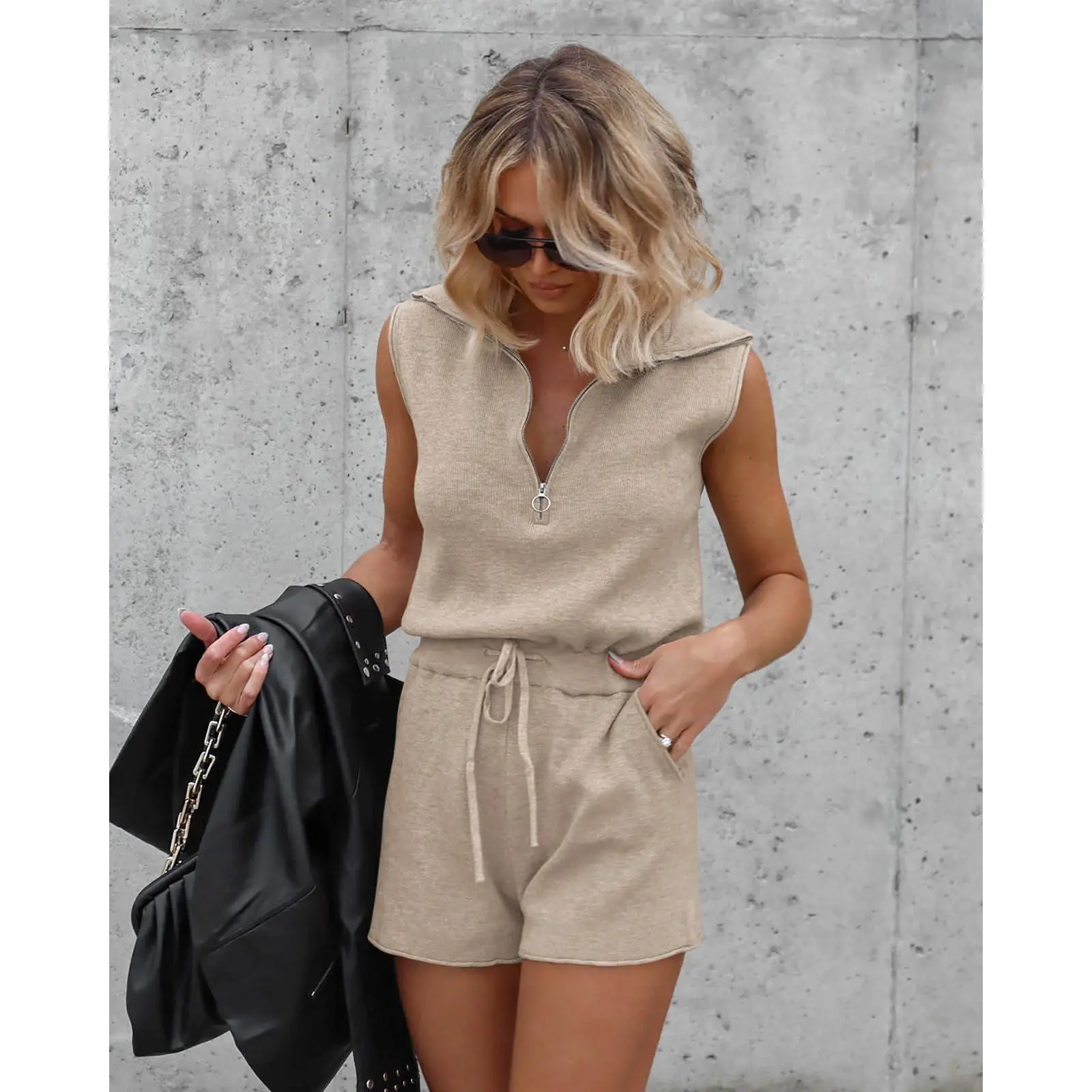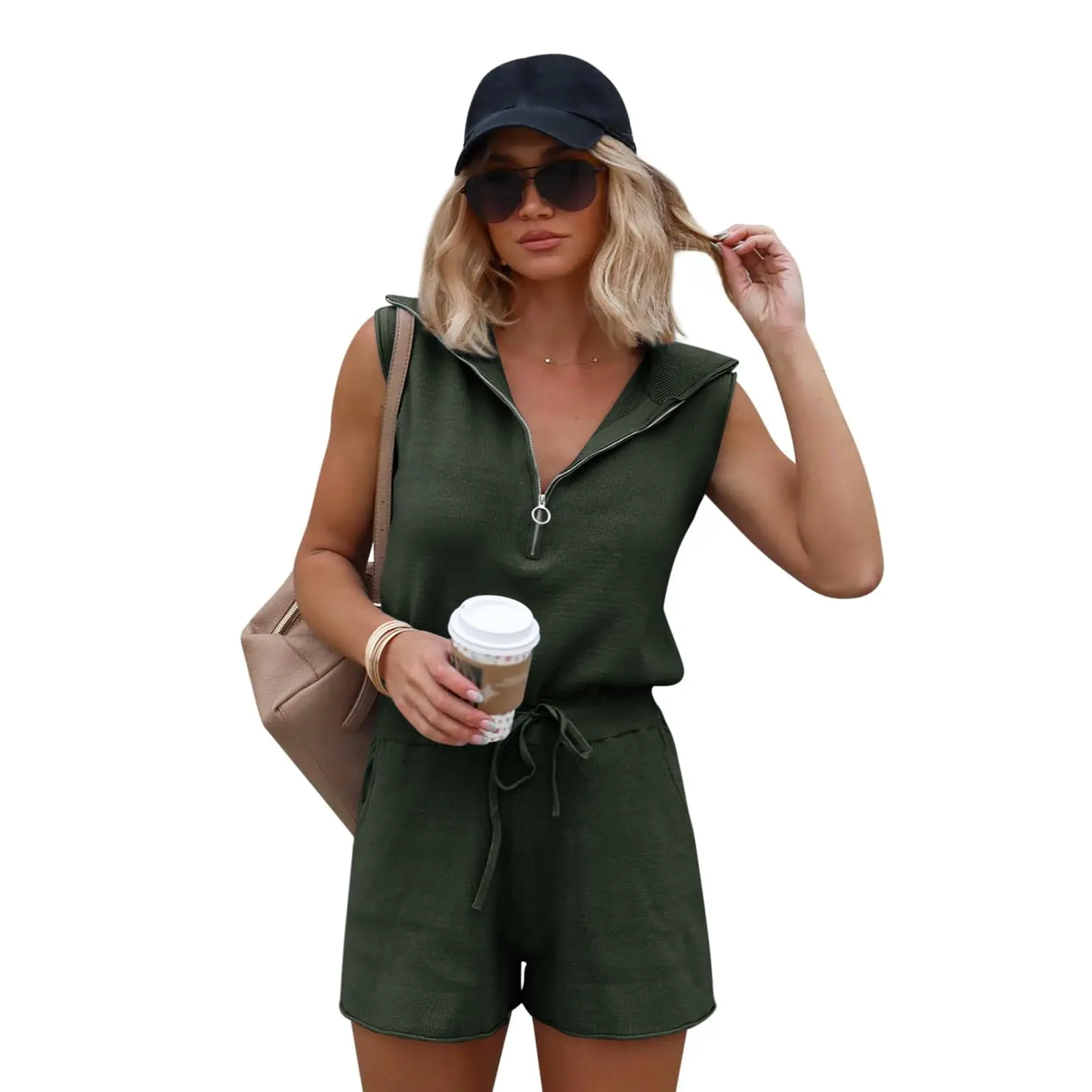 Care Instructions: Keep your half zip up short romper looking its best by hand washing in cold water and hanging it to dry. After washing, reshape the sleeveless jumpsuits and lay it flat to dry. Store the vacation outfits for women beach romper flat or folded to maintain its shape.