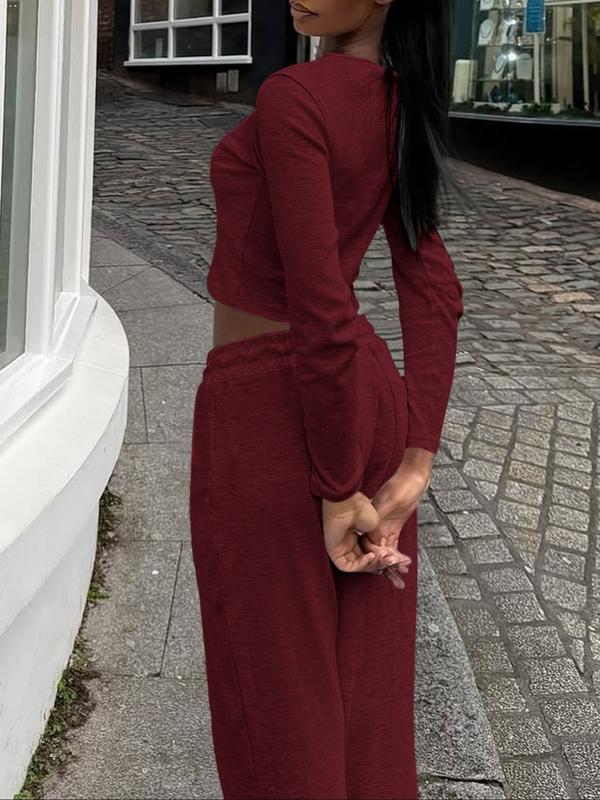 Women's Casual Slim Fit Long Sleeve Crop Top & Pants Set, Solid Color Two-Piece for Fall Season, Comfortable Fitted Clothing Ensemble