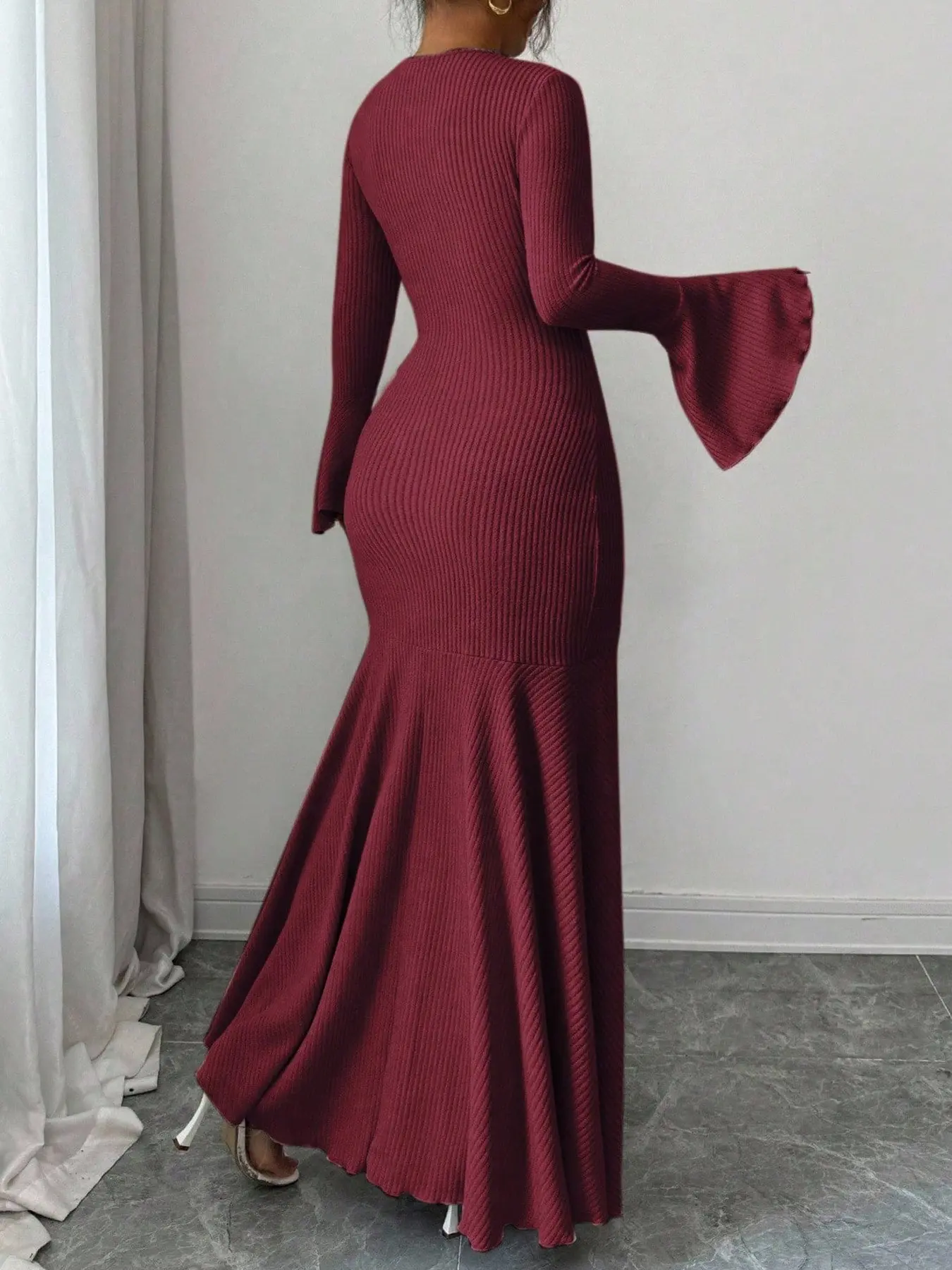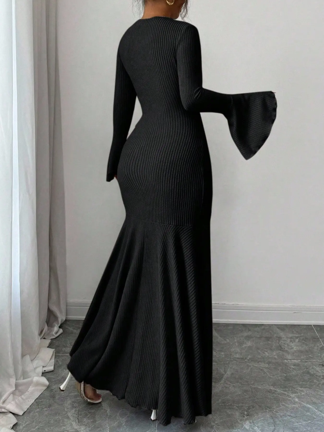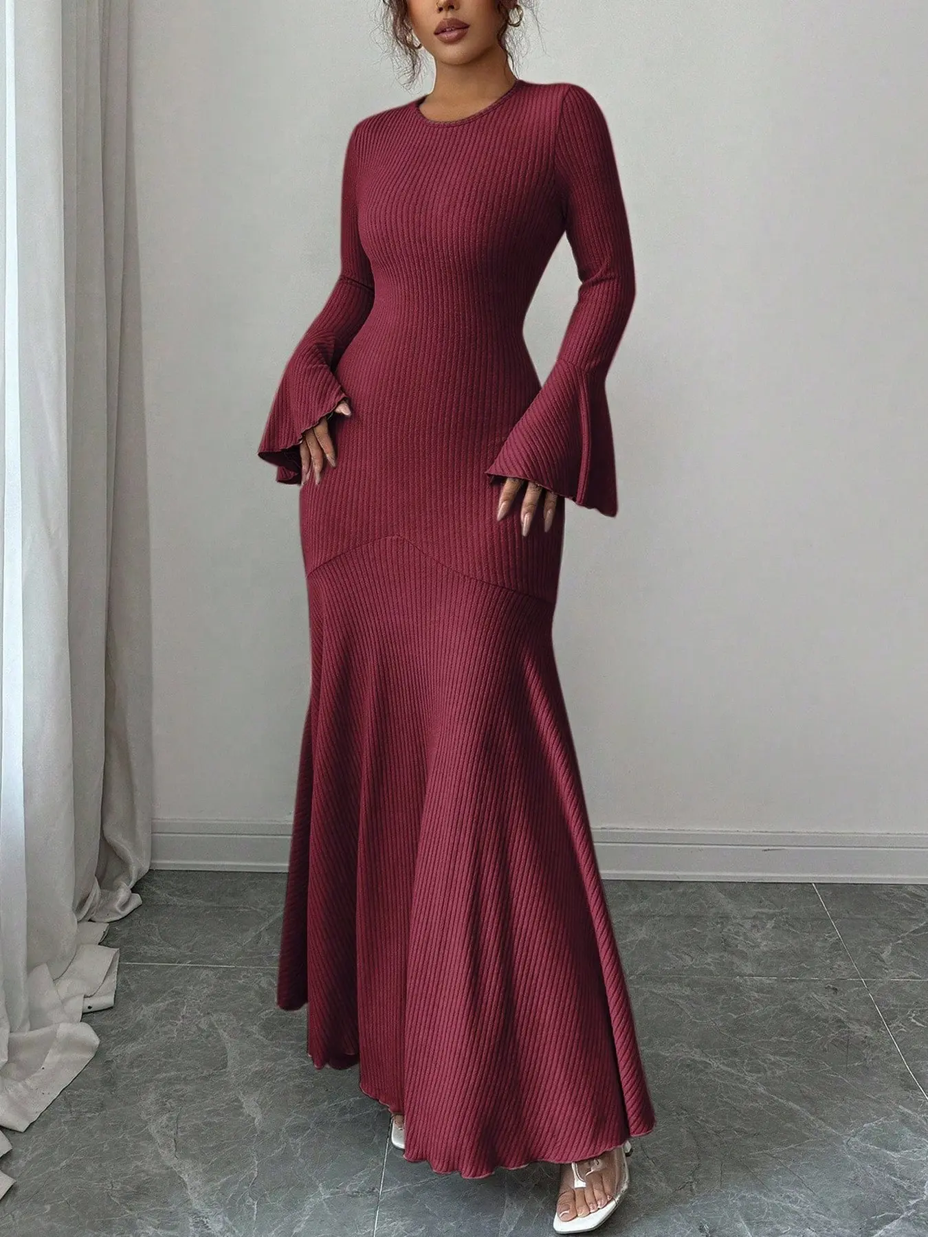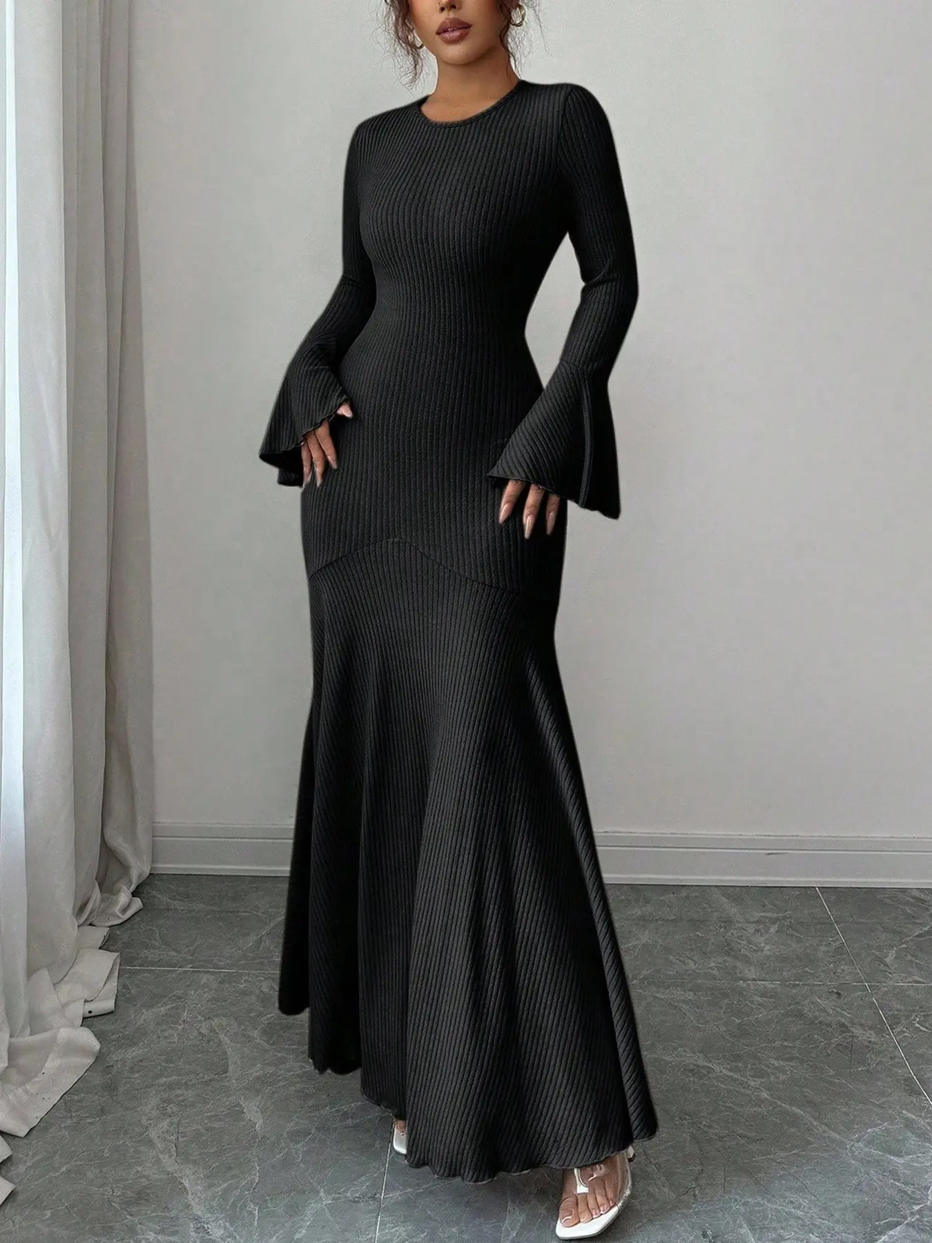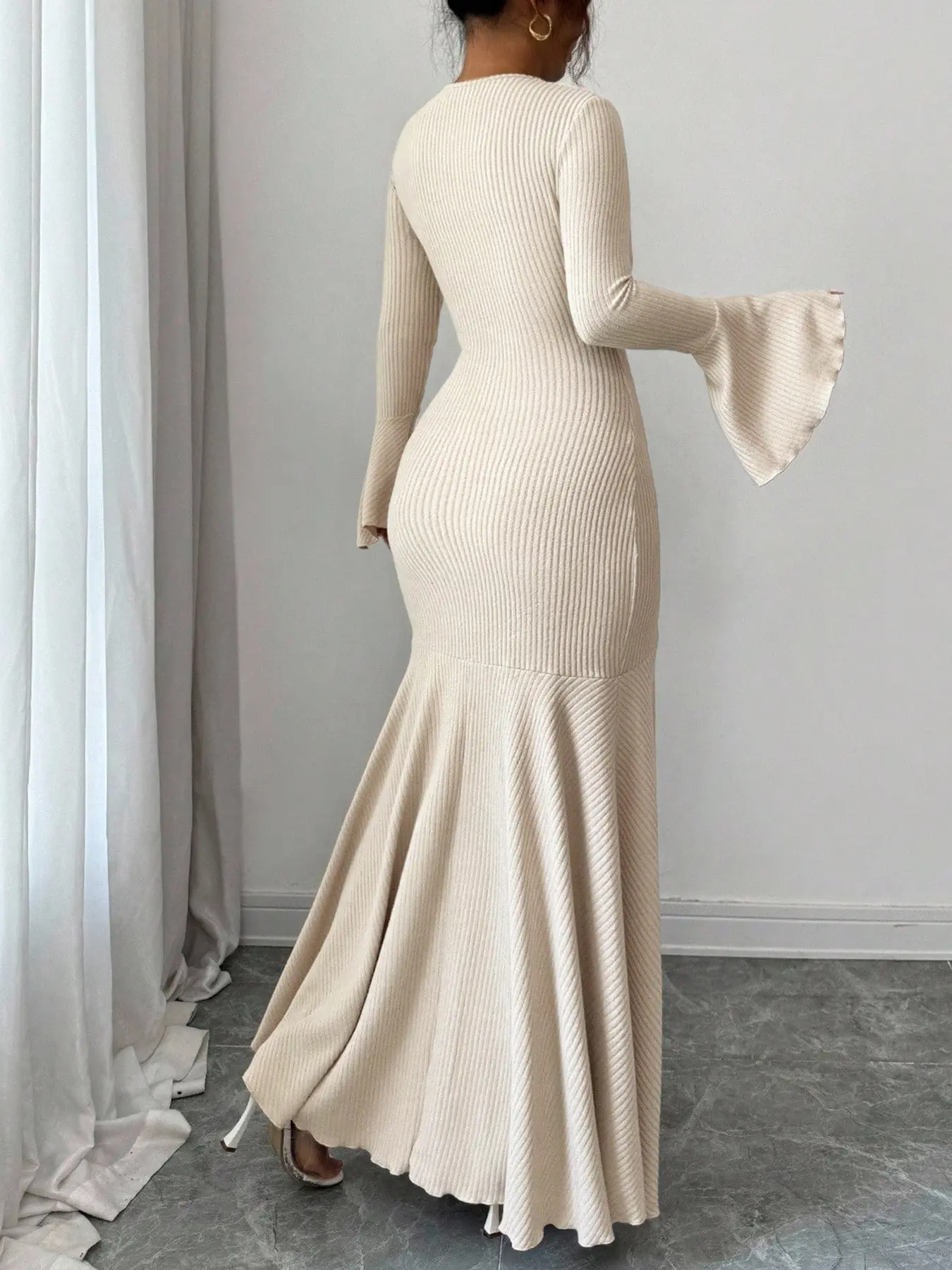 Beige Ribbed Knit Bishop-Sleeve Mermaid Maxi Dress? Luxe Romantic Chic Maxed#KnitFashion #EveningWear #GlamorousEnsemble #RomanticVibe