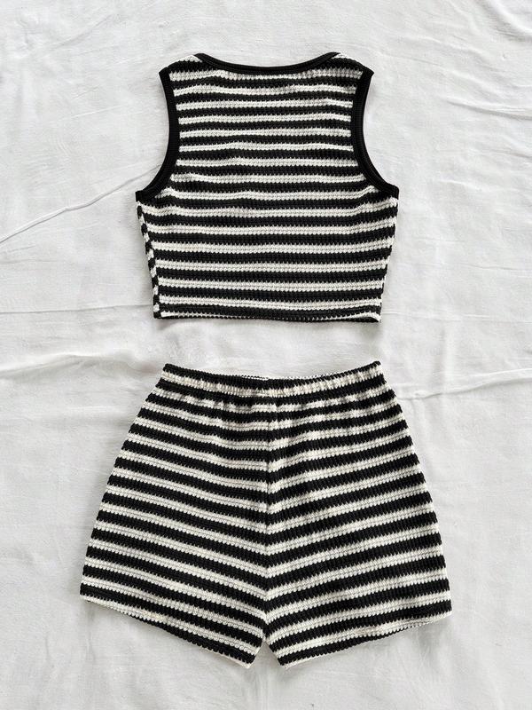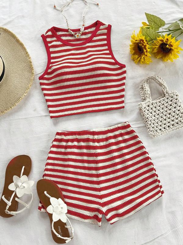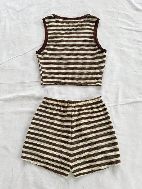 Women's Casual Knitted Striped Backless Short Sleeve Top with Elastic Waist Shorts, Perfect for Vacation Wear, 2 Piece Set