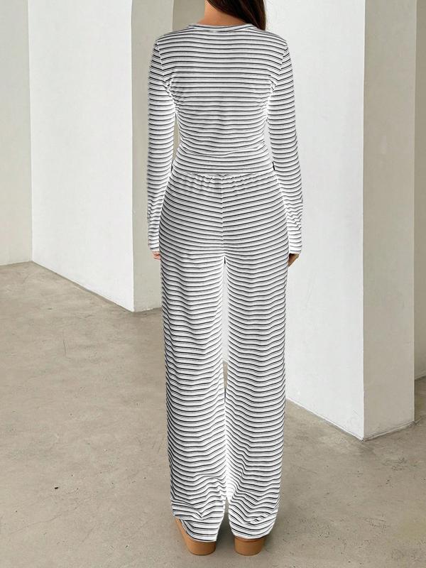 Women's Casual Striped Long Sleeve Top & Pants Set, Slim-Fit Comfortable for Daily Wear, Stylish Two-Piece Clothing Ensemble
