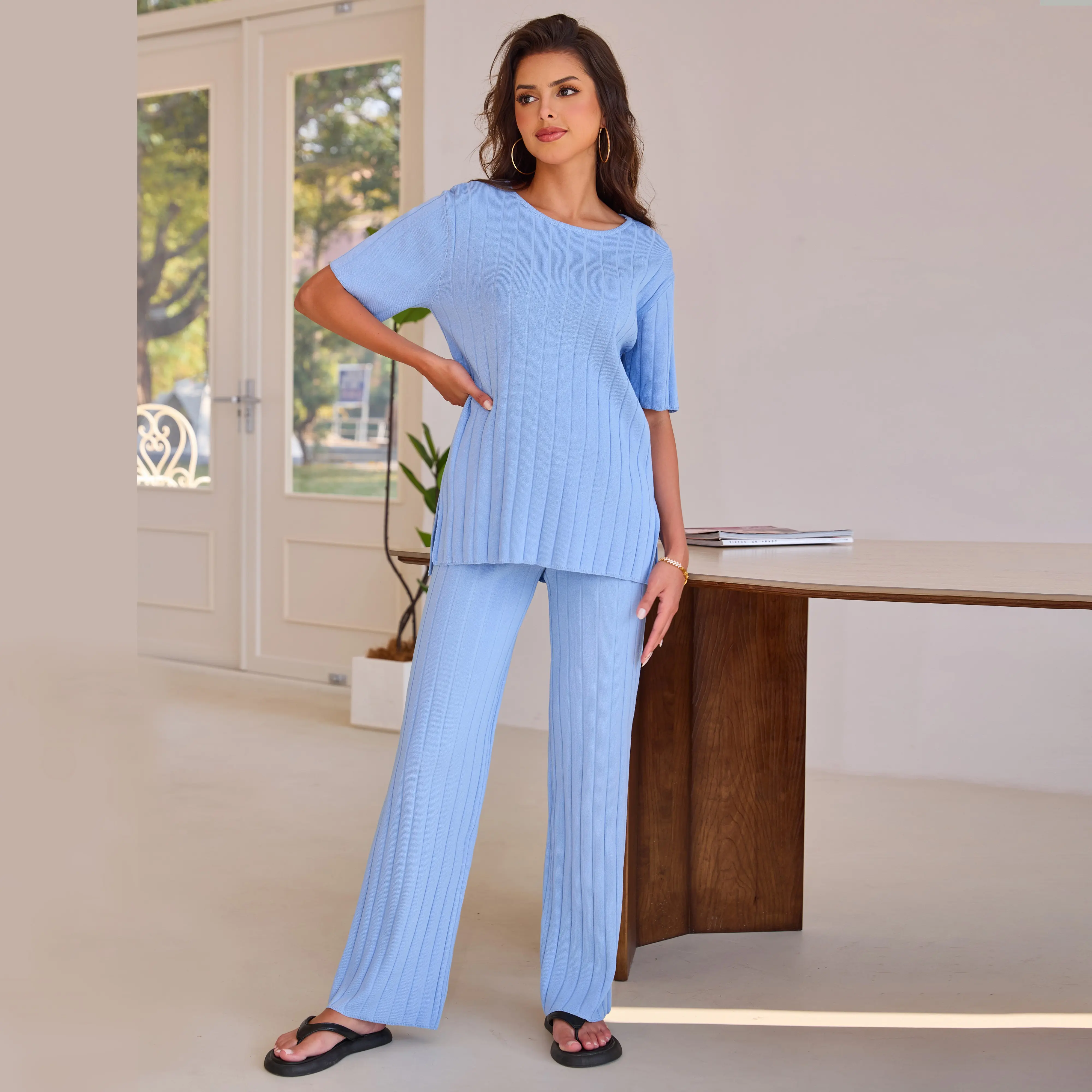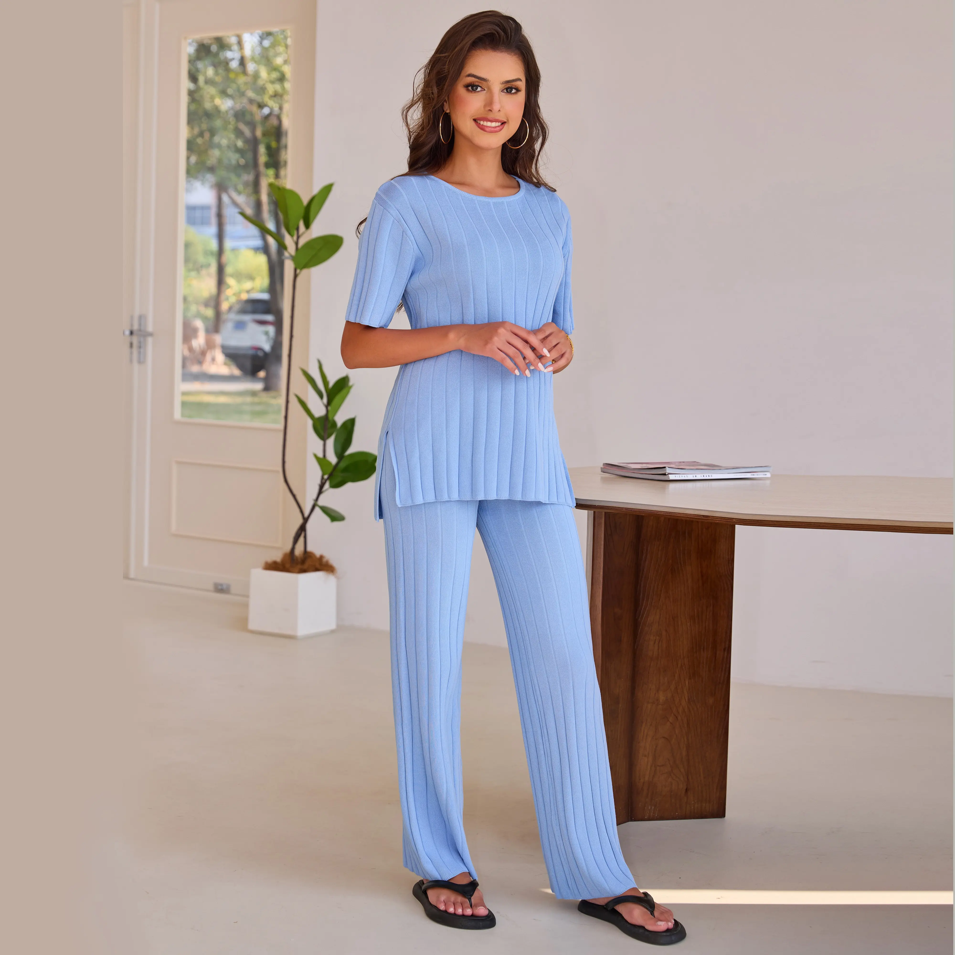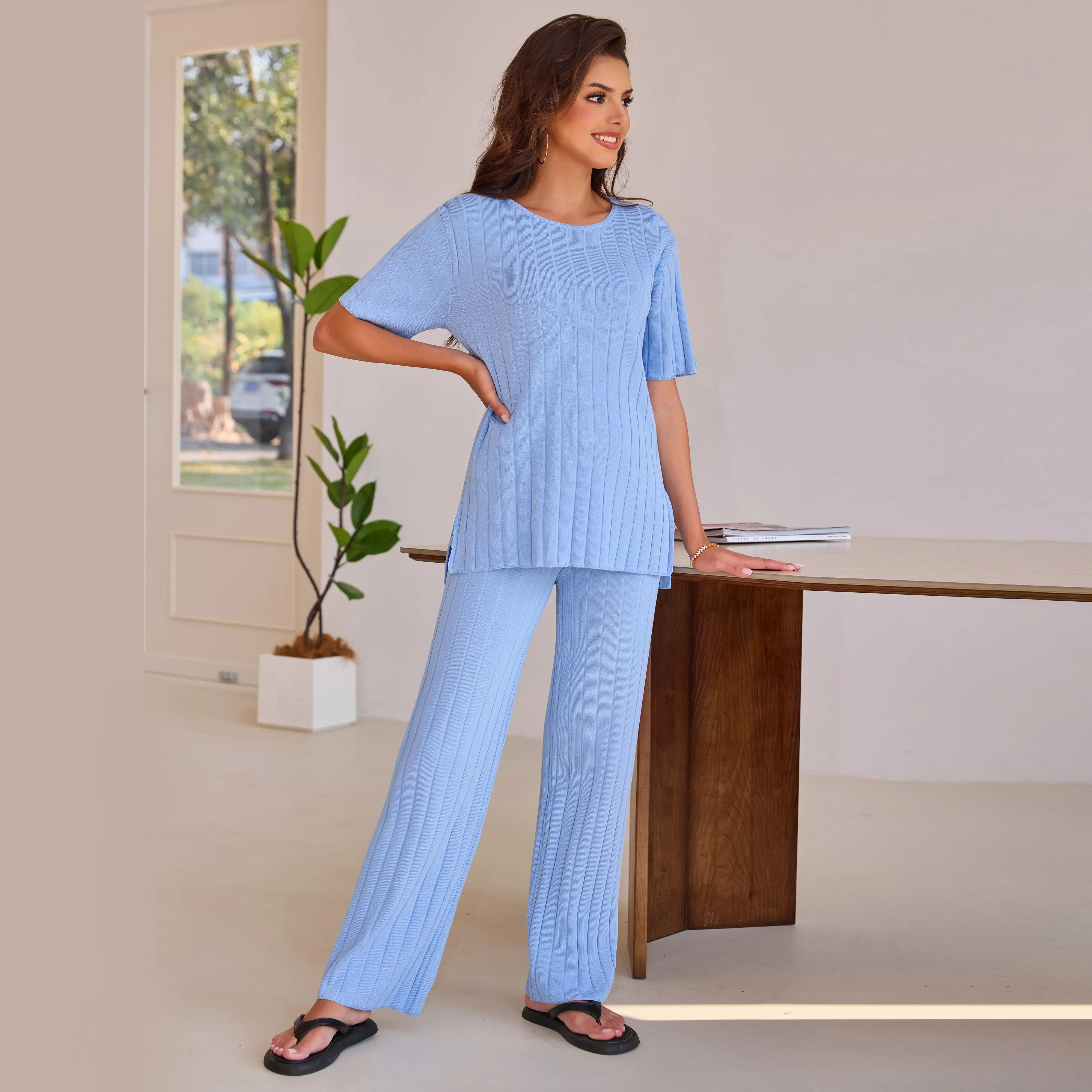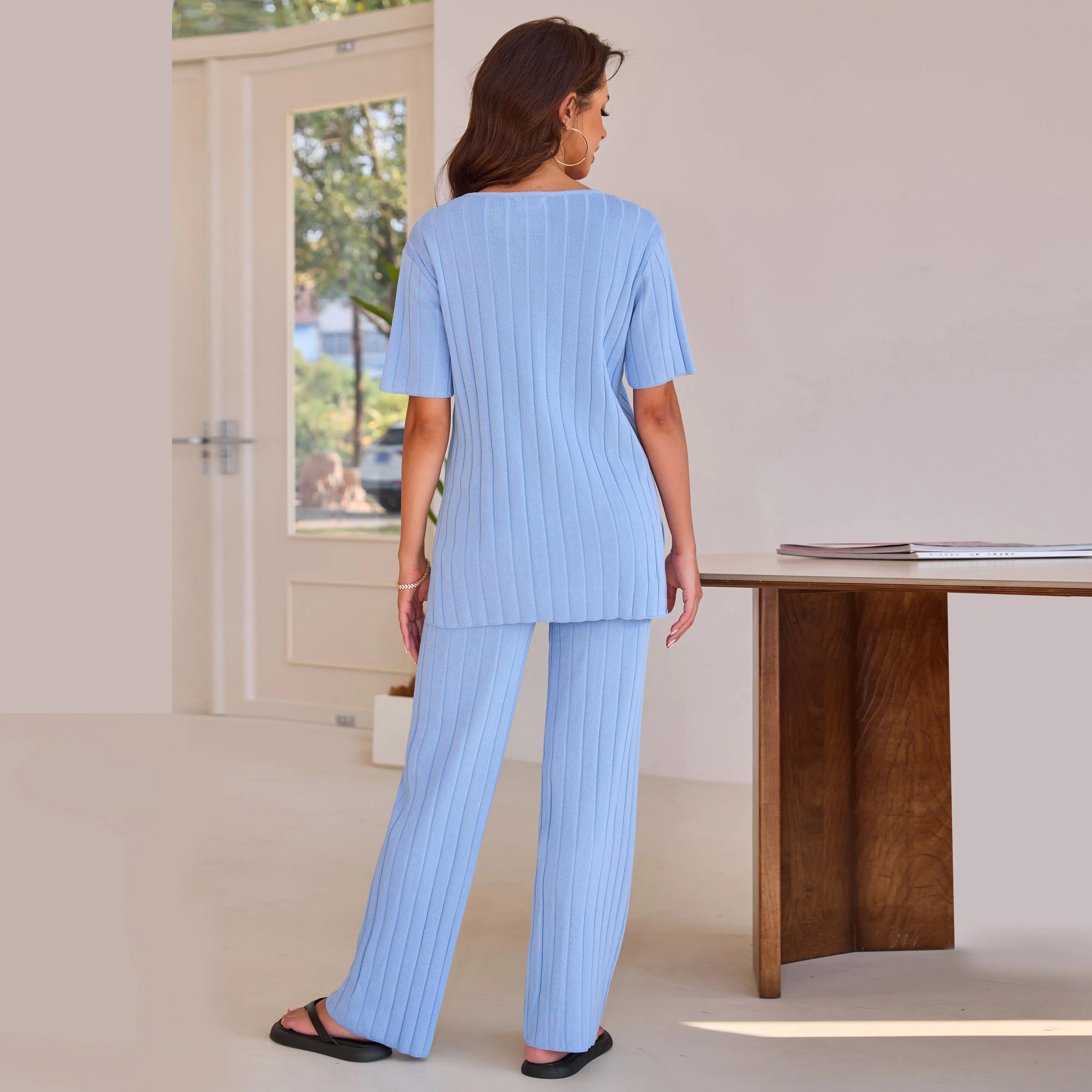 This Women's Black Ribbed Knit Sweater Set is the epitome of comfort and style. It features a short - sleeved top and matching wide - leg pants, both crafted with a ribbed knit texture that offers a flattering fit and a touch of elegance. The sleek black color makes it a versatile addition to your wardrobe, suitable for various occasions.