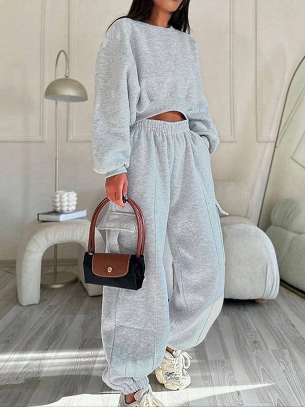 Women's Fashion Casual Two-Piece Set, Chic Round Neck Long Sleeve Sweatshirt & Elastic Waist Pants with Side Pockets, Spring & Fall