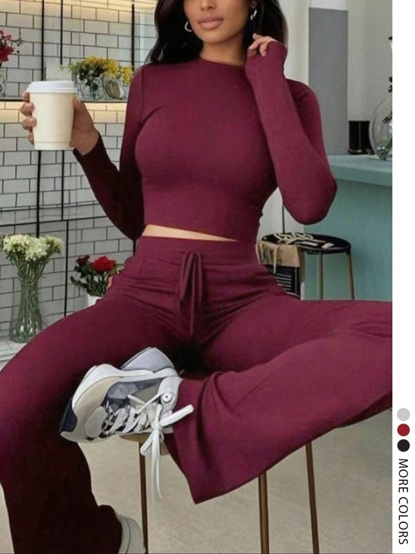 Women's Casual Solid Color Long Sleeve Round Neck Top & Drawstring Pants Set, Comfortable Fall Fashion, Daily Wear & Leisure