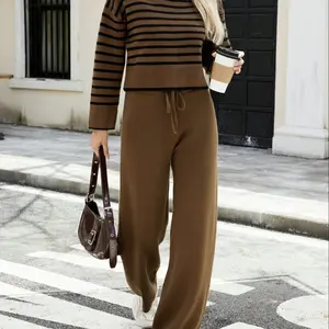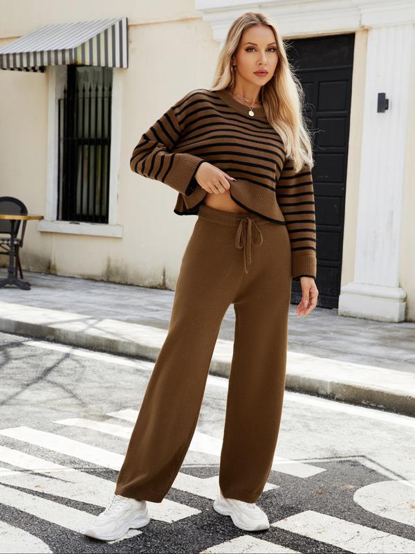 Women's Casual Two-Piece Set, Sporty Knit Sweater & Long Pants, Striped Random Design, Fall Winter Fashion, Comfortable #sweater #joggersets #sweatsuitset #womenssweatshirtset #activewearset #womenssweatpants #womenssweats #widelegjumpsuit #2piecesetoutfit #fallactivewear