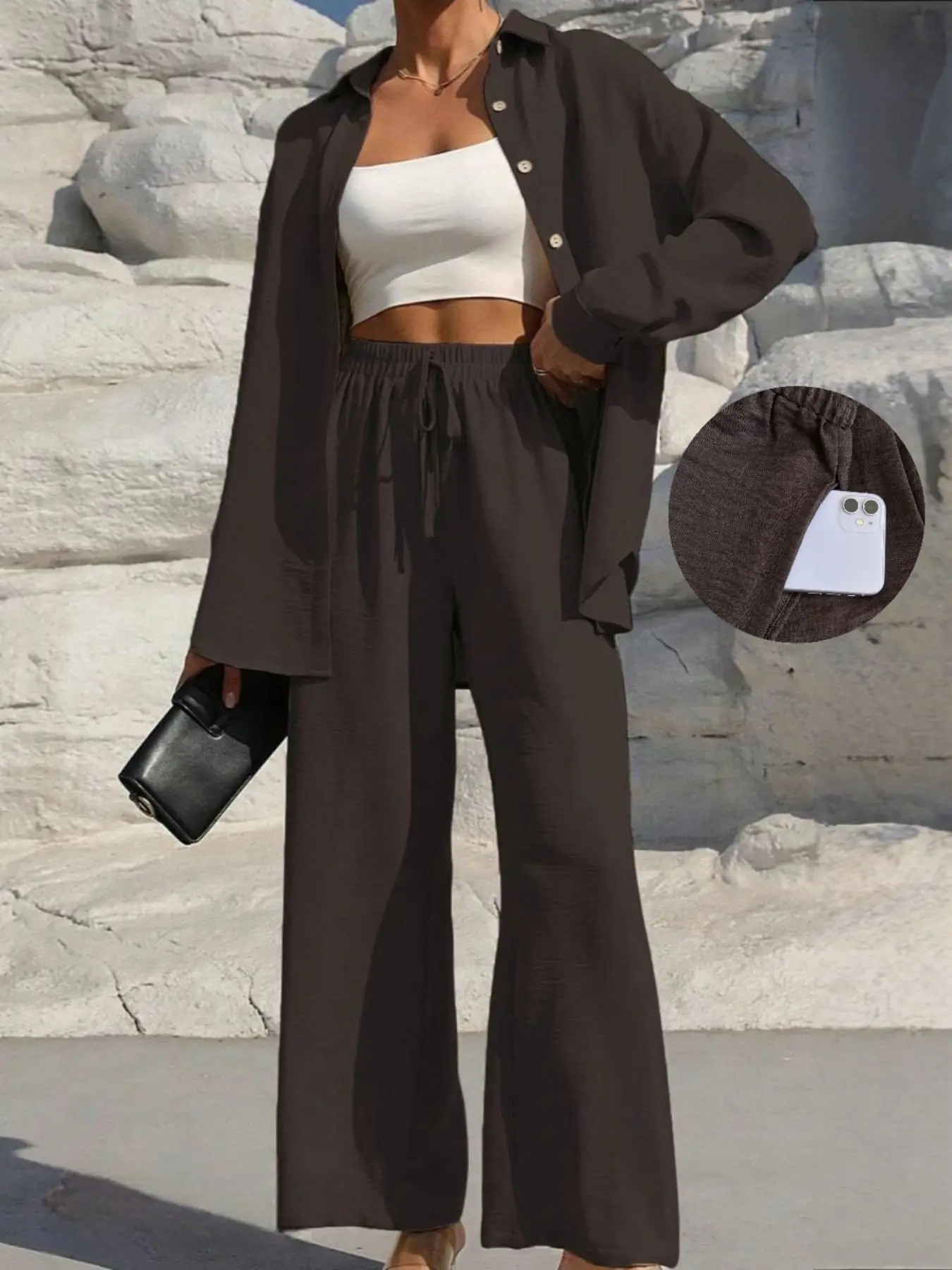 Lm131 Tie Front WideLeg Pants With Pockets & Women's Solid Button Front Shirt Two-piece Set,Casual Modest Outfit, Casual Fashion Set