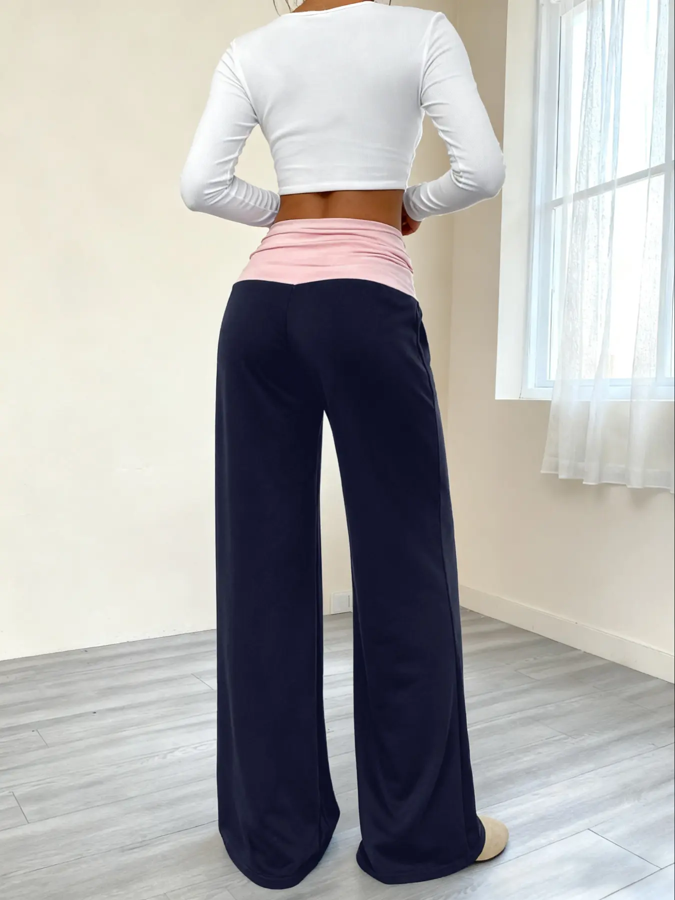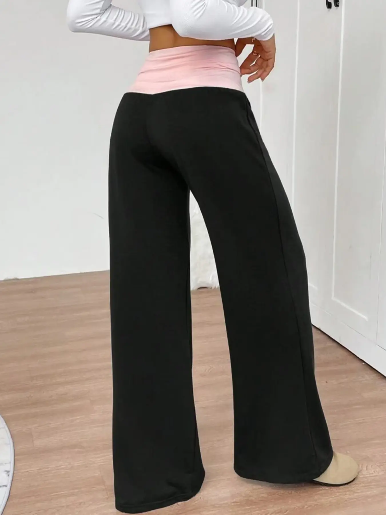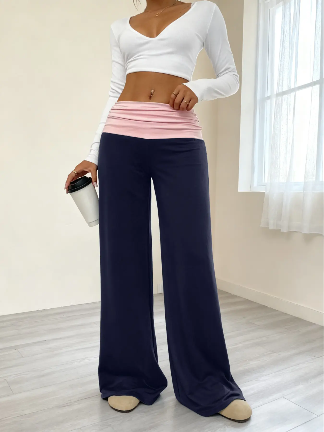 【Contrasting Flap】: The unique contrast flap at the waist gives this piece an eye-catching twist on classic wide-leg pants.