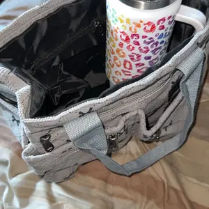 Exactly as pictured. Soft and feels sturdy. My 40oz fits. I love it. Sorry if you tried to get this one and it was gone. IT WAS ME! 🫢 Bonus: Purell 2 FL OZ for scale on the side zipper pockets. Will not fit a laptop comfortably, but does hold it.