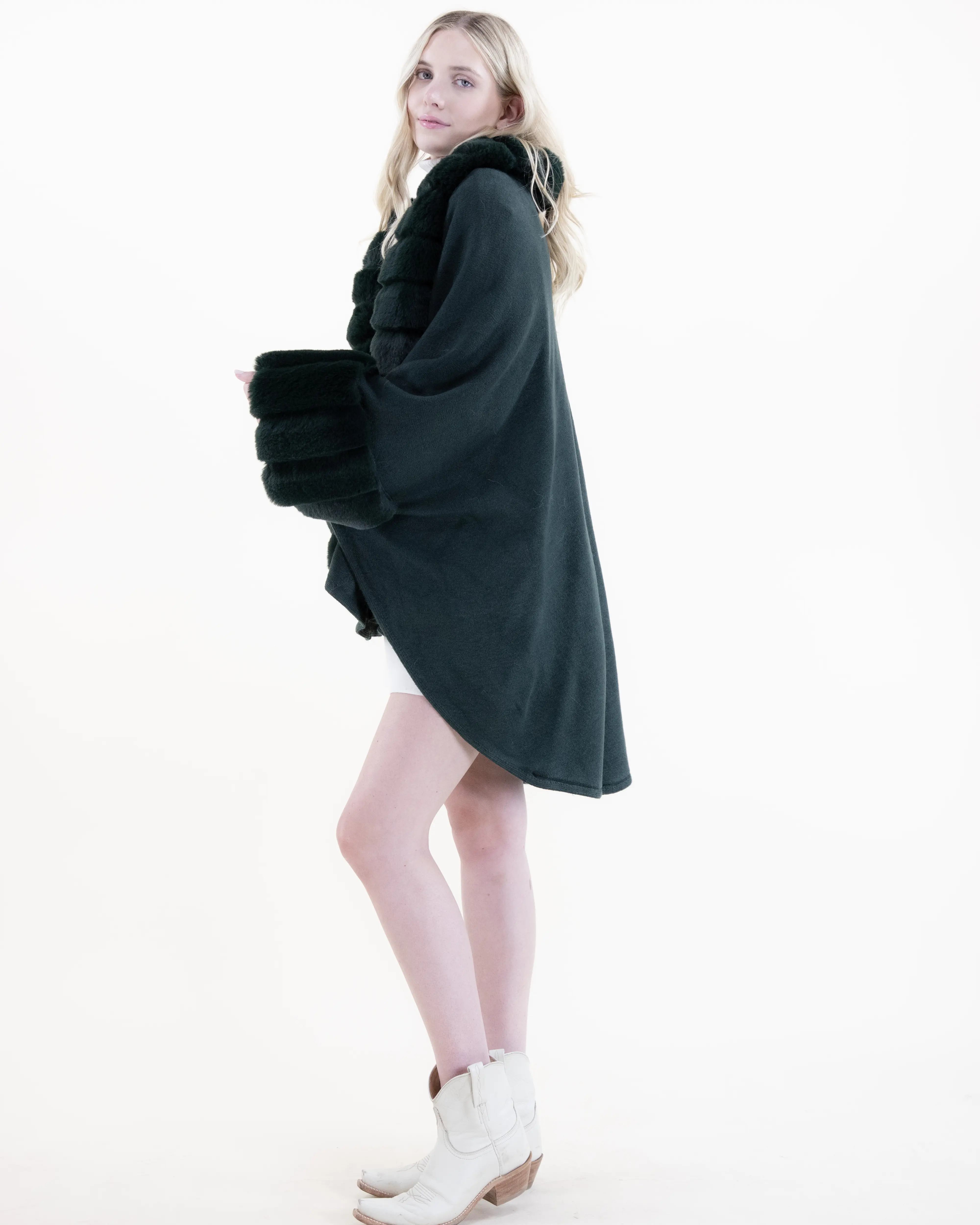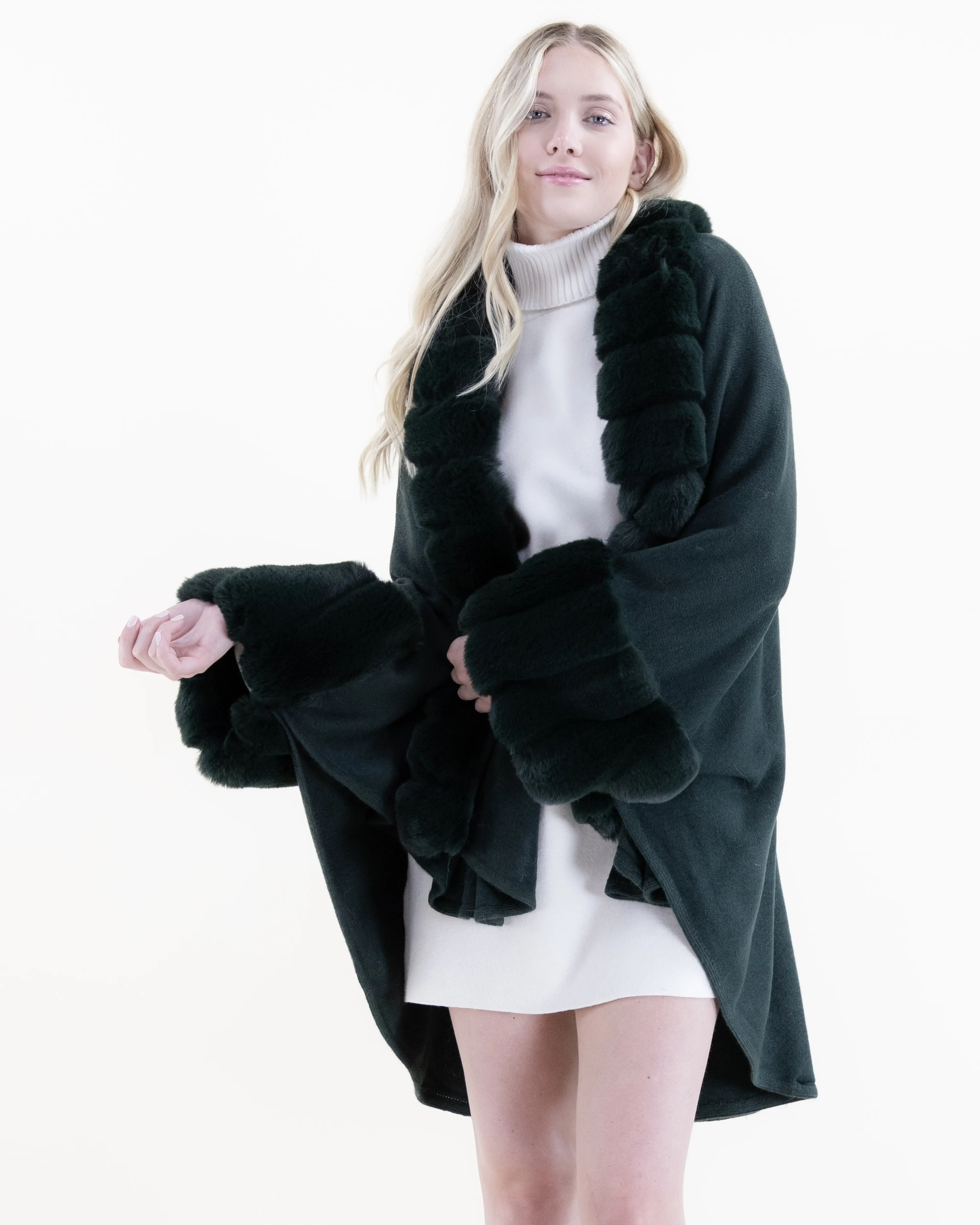 This dark green faux fur wrap is absolutely stunning. The color is rich and elegant, adding a sophisticated touch to any outfit, whether worn over eveningwear or styled casually for a chic layered look. The faux fur is incredibly soft and plush, giving the feel of luxury without the weight.