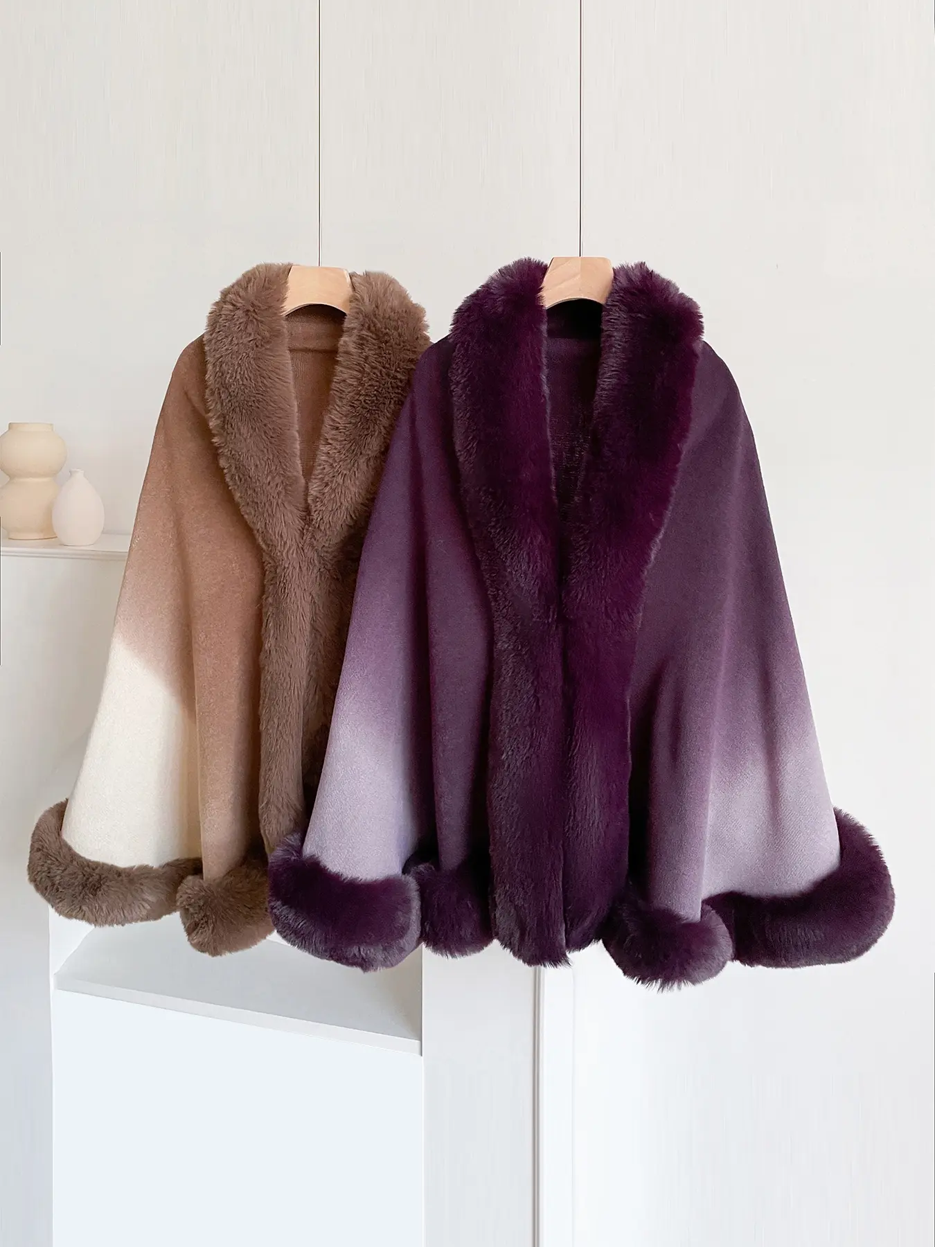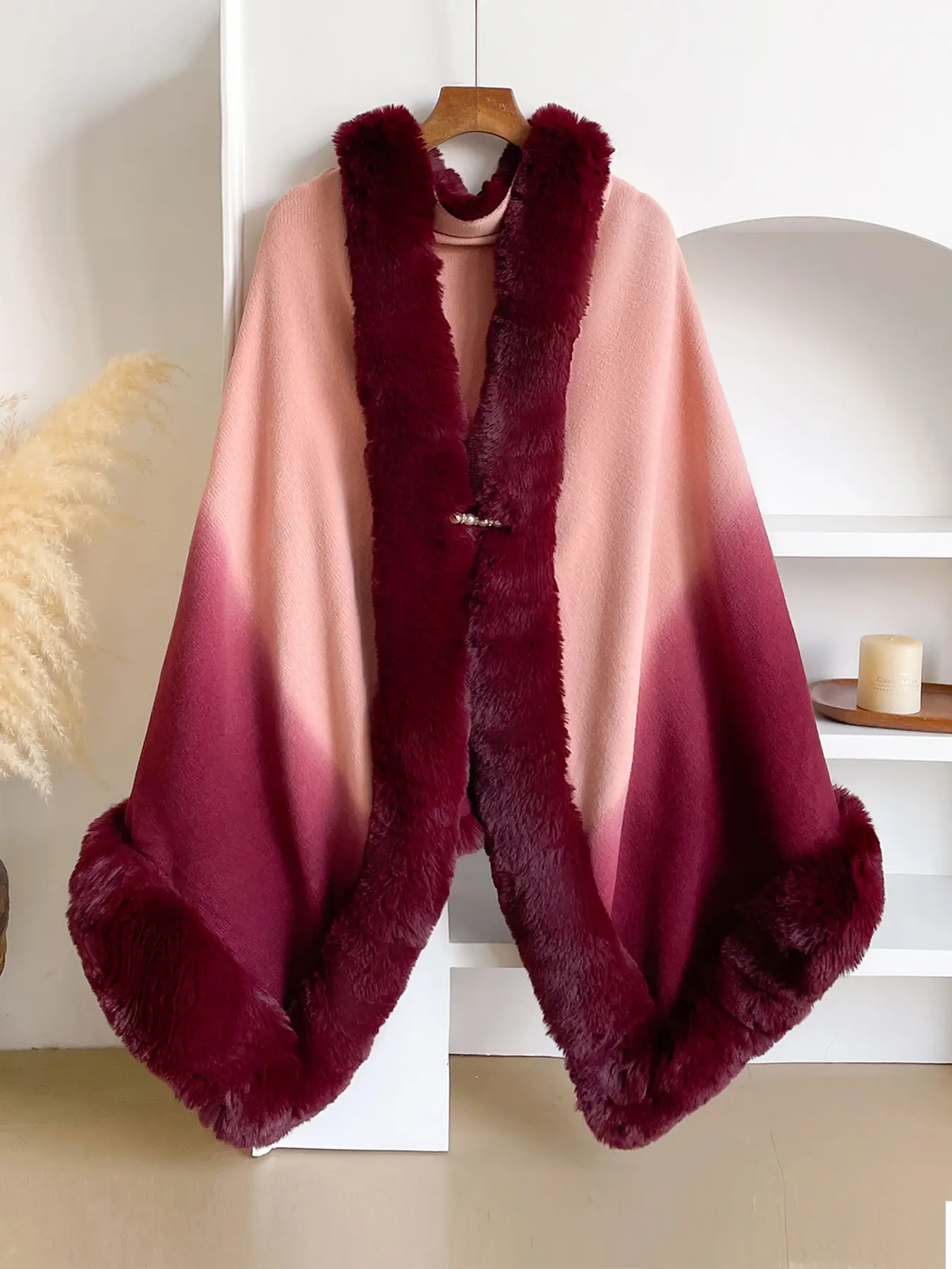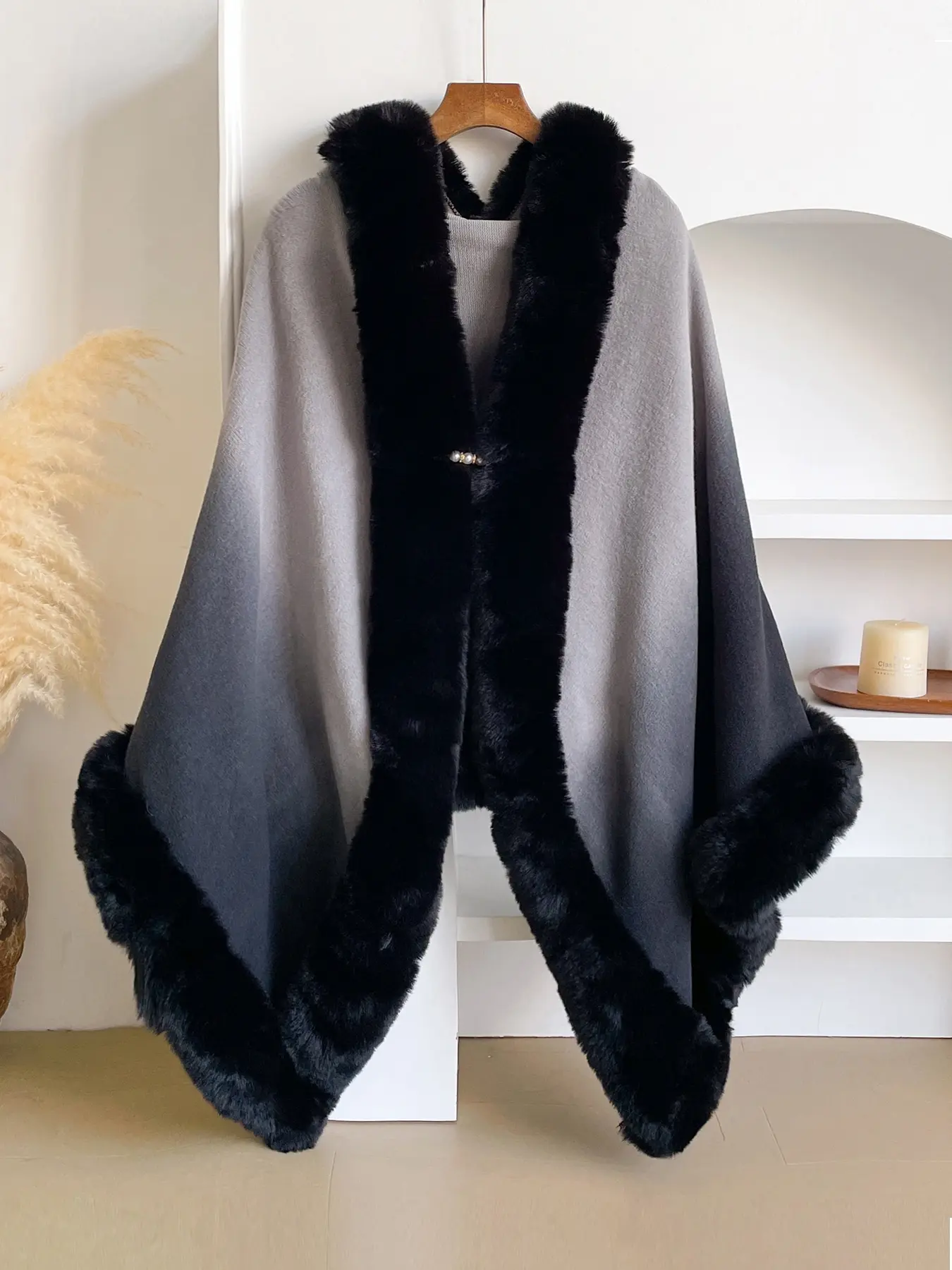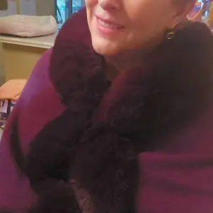 I thought it would’ve been a little darker as far as not the fur but the other part but it’s still a nice hombre color. It’s cute on me. It has a little latch to keep it closed. A nice little shawl throw to wear.