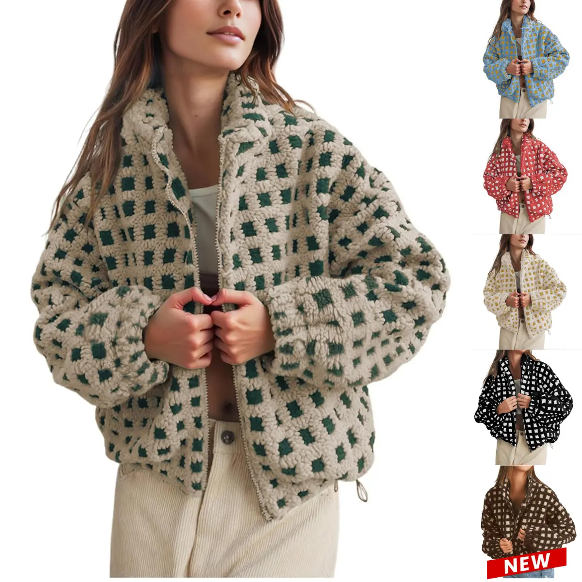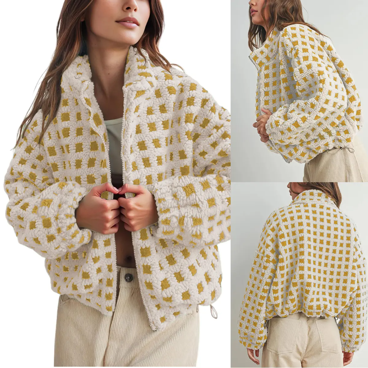 Features: The women's casual fleece coat features with long sleeve, zip front closure, elastic drawstring hem design, baggy and cozy fit; Its trendy checkered pattern makes it a fashionable choice for everyday wear or special occasions