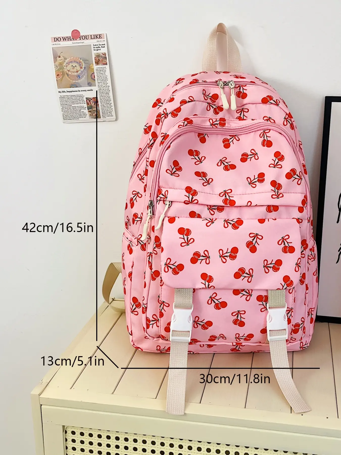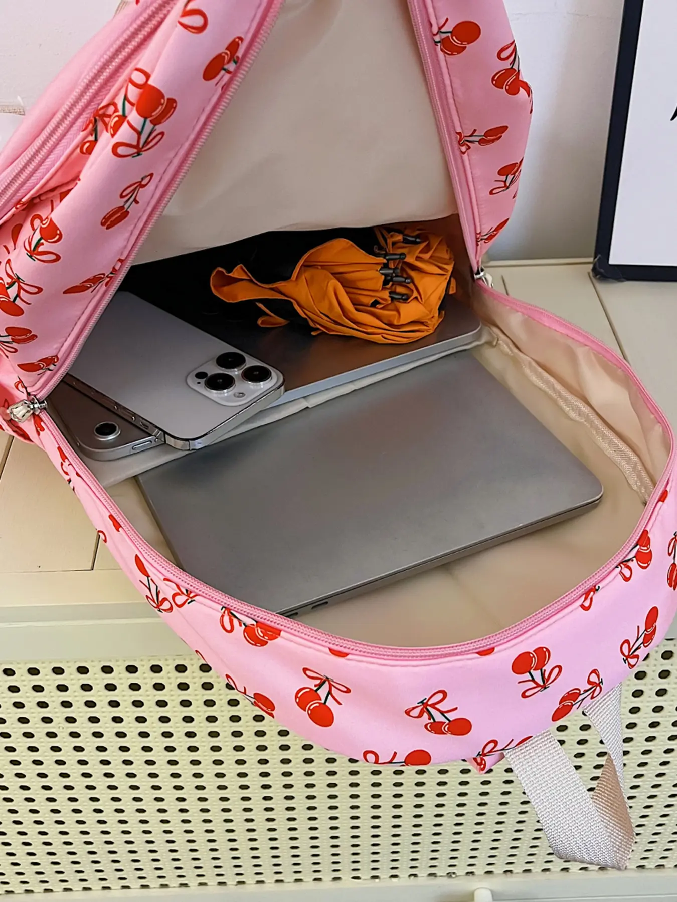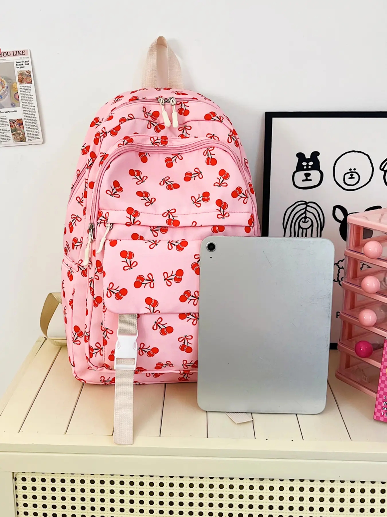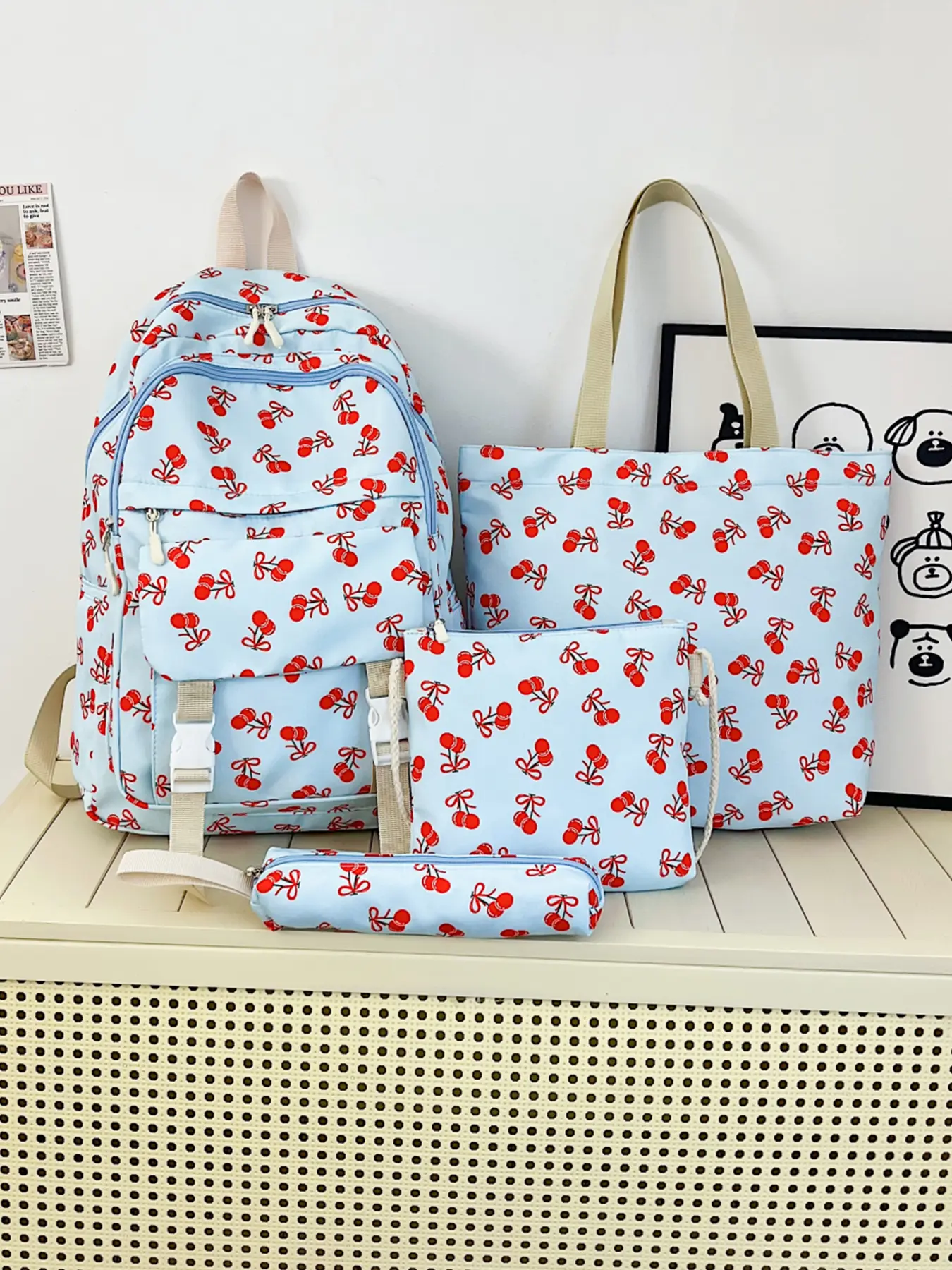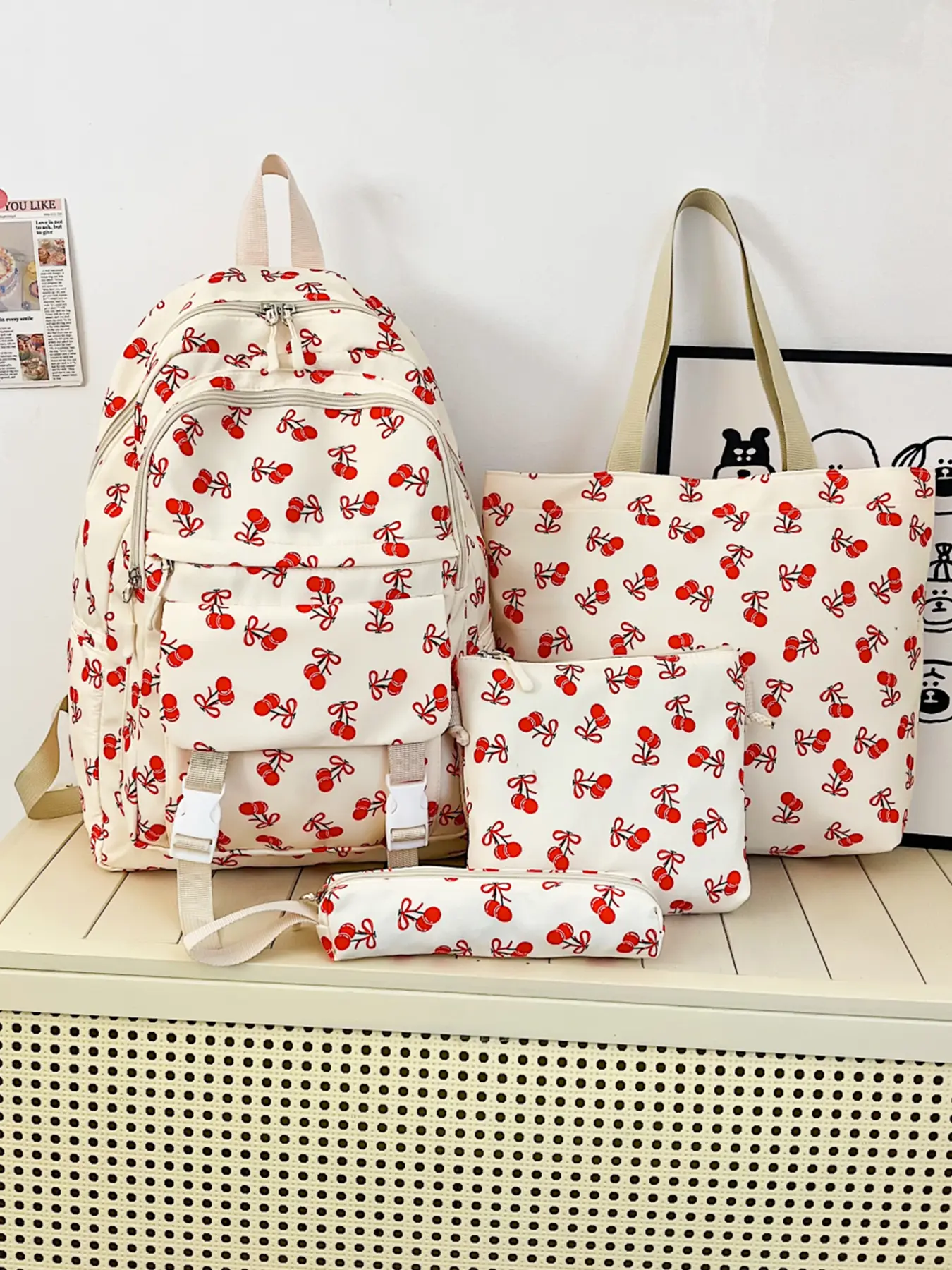 4pc women's backpack solid color backpack cherry print fashionable and versatile casual trend suitable for students to go to school, campus, travel, shopping, multi-purpose women's backpack Stylish Casual Daypack