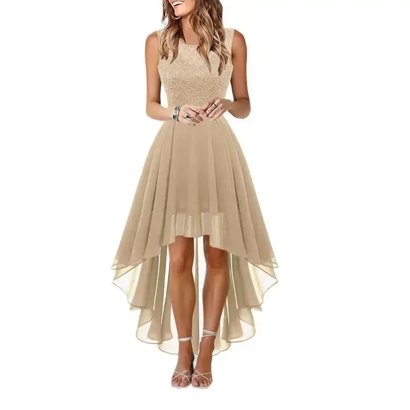 This women's dress is made of high-quality chiffon fabric, which is soft and breathable, bringing you first-class comfort.This lovely solid color dress is made of comfortable and stretchy fabric, and the lining color is consistent with the outer fabric.The classic retro lace style makes this semi-formal dress suitable for cocktail dresses, graduation dresses, mother of the bride dresses, beach dresses, teen prom dresses, casual dresses, and various parties./Wedding Guest Dress - This is a charming mid-length dress, perfect for weddings, and the romantic and gorgeous appearance is heart-warming.This high-low lace dress comes with a ribbon, lace top, sleeveless design, sexy deep V back, matched with simple colors, perfectly highlighting your perfect figure./Cocktail Dress Fashion Details - This party dress has a certain elasticity, comfortable to wear, and elegant and flowing.The high waist design cleverly covers the abdominal line.The irregular skirt with a short front and long back makes it look more slender visually, while creating a looming visual effect.The slim fit fits the body perfectly, outlining a sexy and charming silhouette.Classic floral lace adds a touch of elegance to this flowing holiday dress./Ball gown for most occasions - make an impression in any occasion with this chiffon dress.Whether you are attending a wedding party or going on vacation, this elegant cocktail dress is not to be missed.This women's dress will perfectly meet all your fashion needs and you can pair it with whatever you like!Here are some fashion tips: accessories, jackets, coats, high heels, sandals, flats and other fashionable items are available./Multiple color options: white dress/dark rose bridesmaid dresses/lavender dress/women's evening black cocktail dress/light blue wedding dress/champagne dress/purple dress/green semi-formal dress/navy blue ball gown/red Christmas dress.