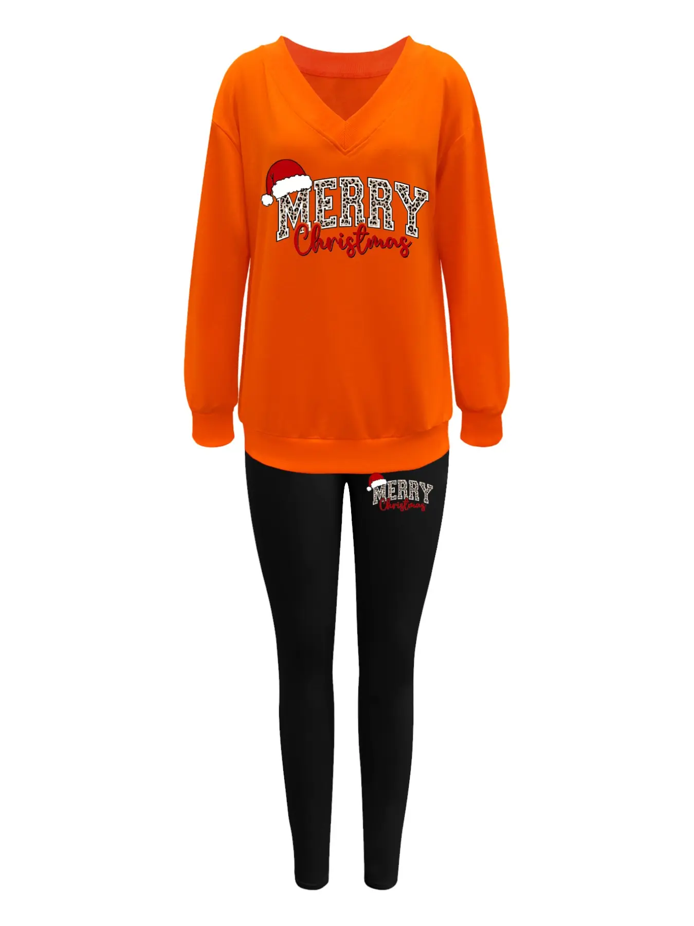 Women's Christmas Print V-Neck Long Sleeve Hoodie Set, Fitted Skinny Pants, Casual Fall & Winter, Multi Color Options, Matching Clothing Set