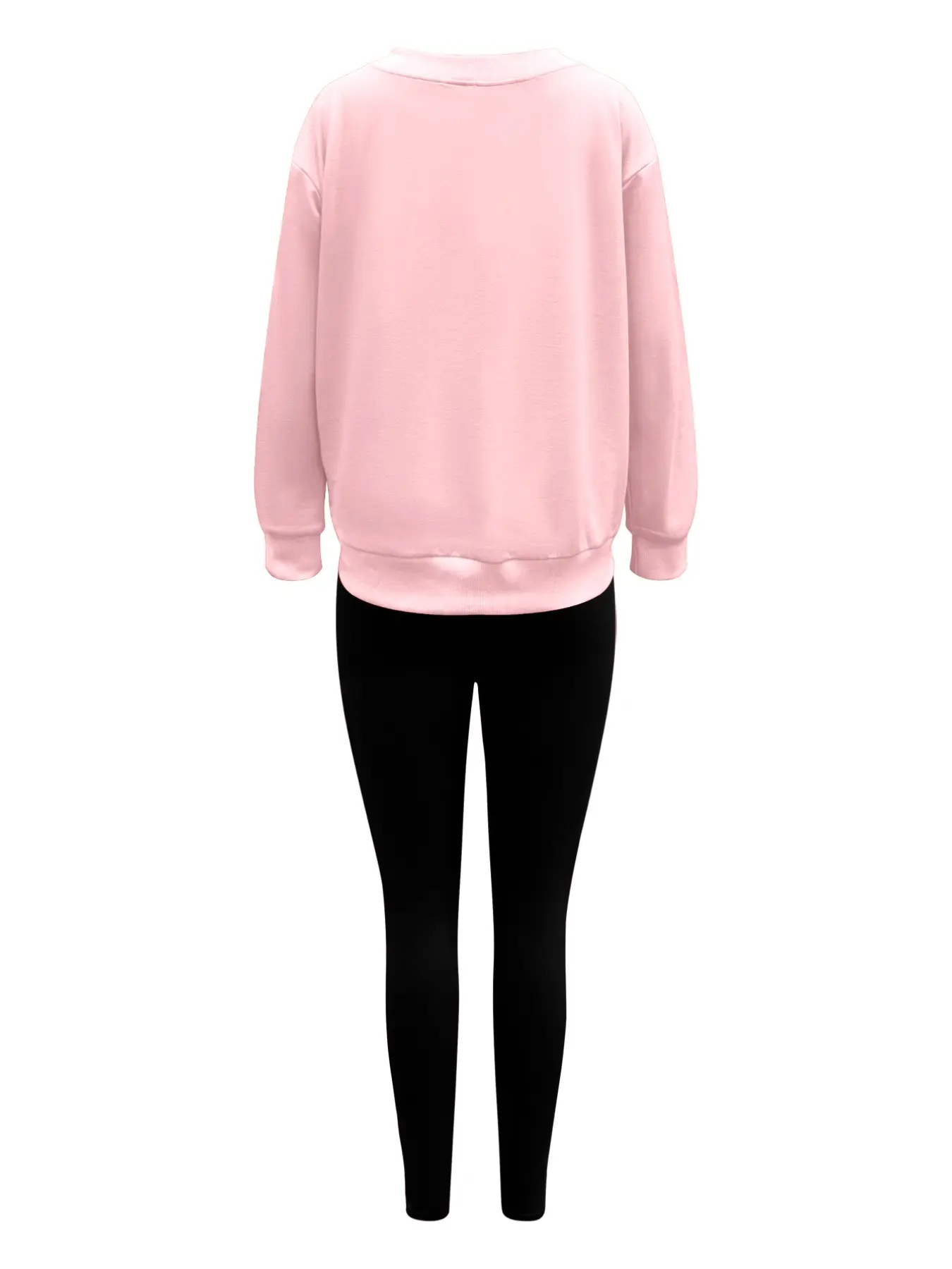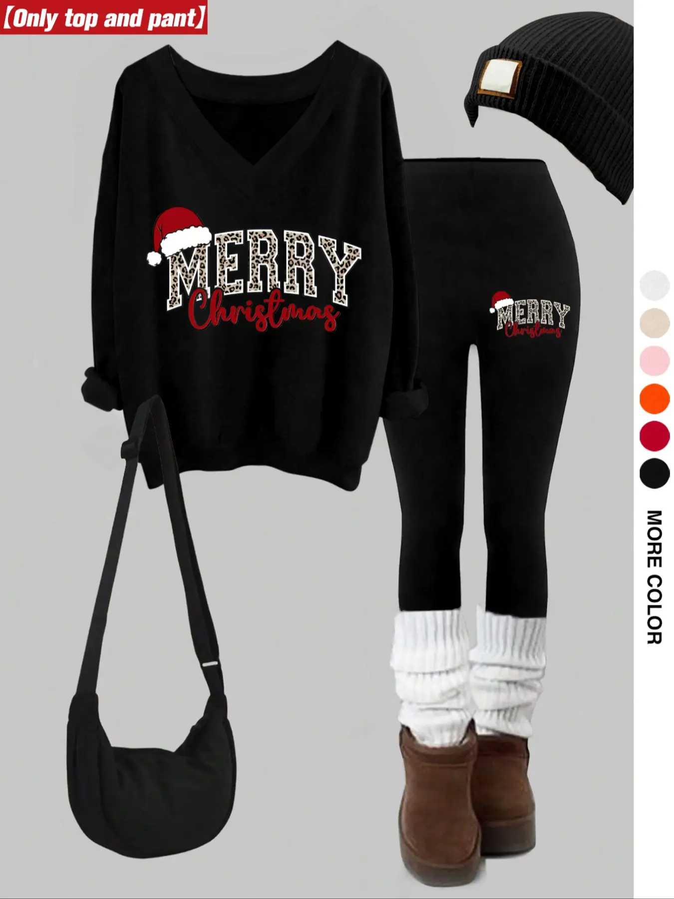 5. Women's Christmas Print V-Neck Long Sleeve Hoodie Set, Fitted Skinny Pants, Casual Fall & Winter, Multi Color Options, Matching Clothing Set