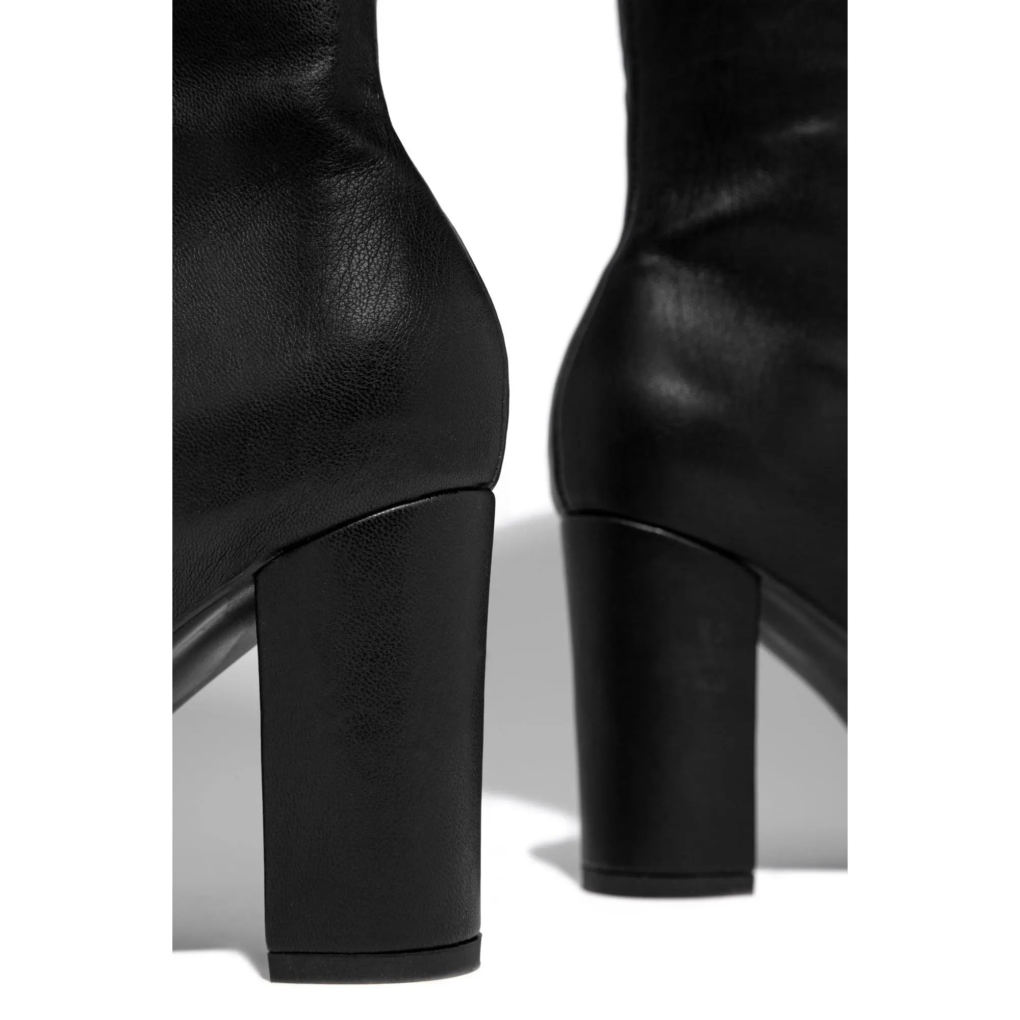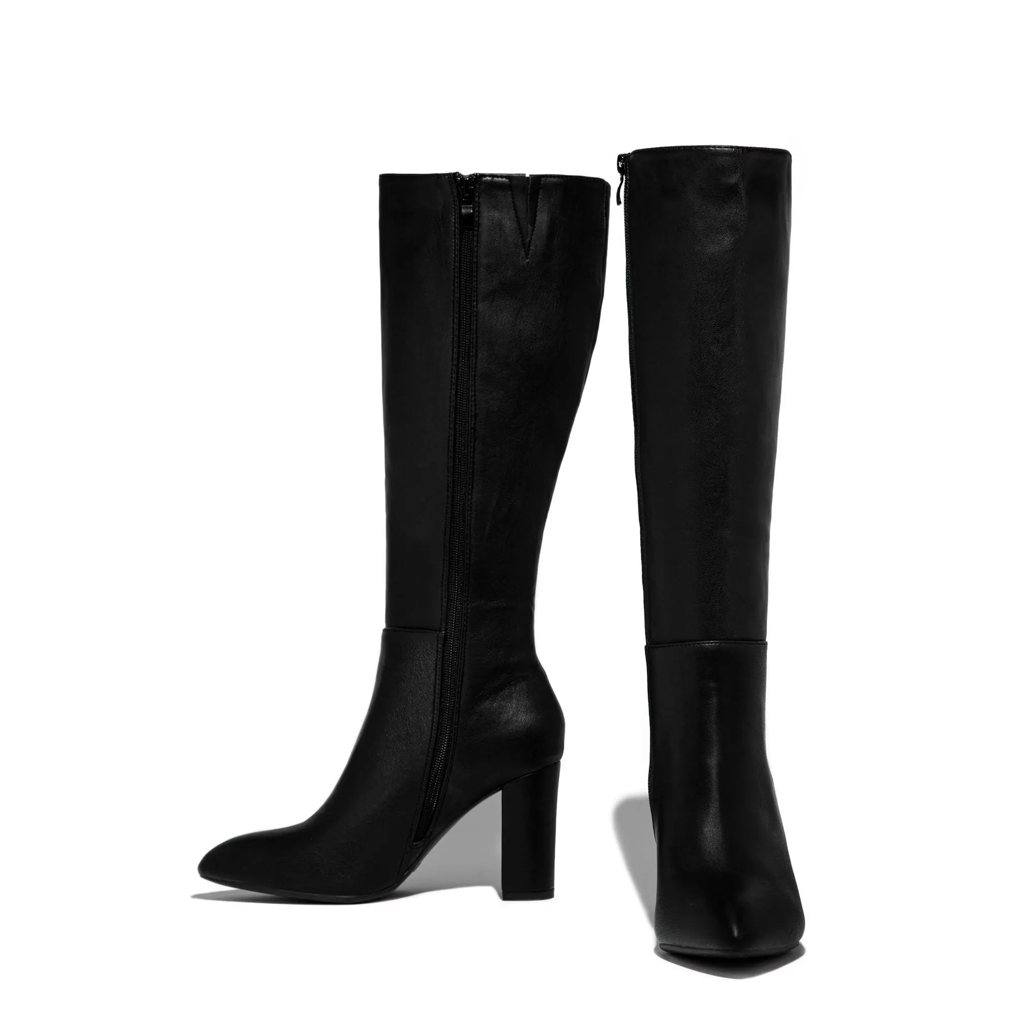 Shape and size: These boots feature a sharp pointed toe and a calf-high silhouette that creates a long, lean line. They generally run true to size, but the shaft is structured, so consider your calf measurements for the best fit. Wearability: Comfortable all say wear. Perfect heel height. Color: Quality black PU leather looks high end.