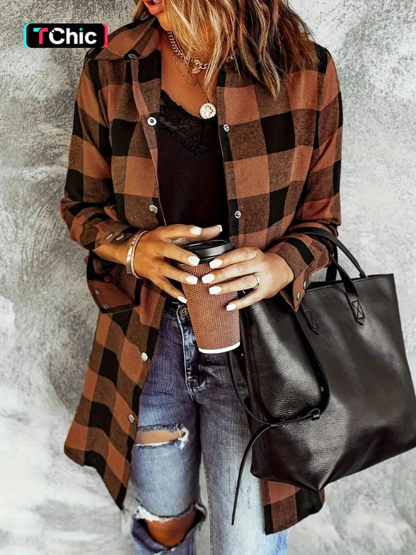 Women's Plaid Shirt Jacket, Long Sleeve Button Front Blouse, Casual Fashion for All Seasons, Ladies' Stylish Outerwear