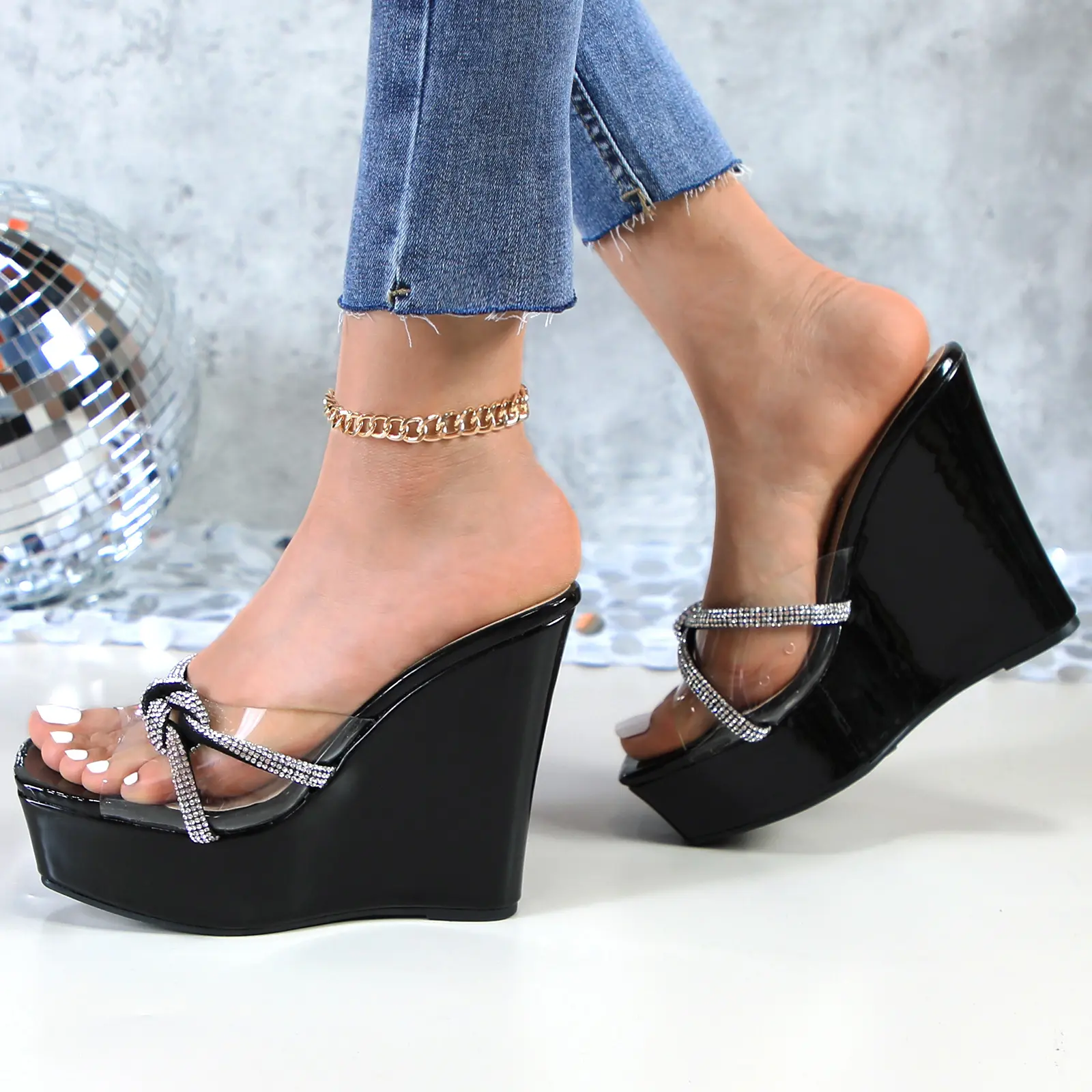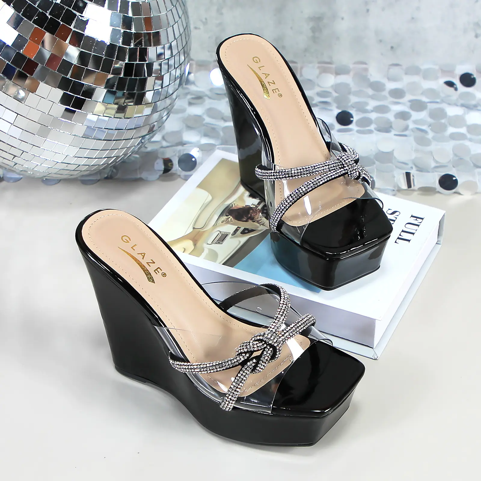 Women's Clear Transparent Wedge Platform Sandals with Sparkling Glitter Rhinestone Knot 5.12-inch High Heels Mules Elegant Comfort Breathable Slide Square Open Toe Slip-on Girl Summer Dressy Casual Shoes for Wedding Party Bridal DB