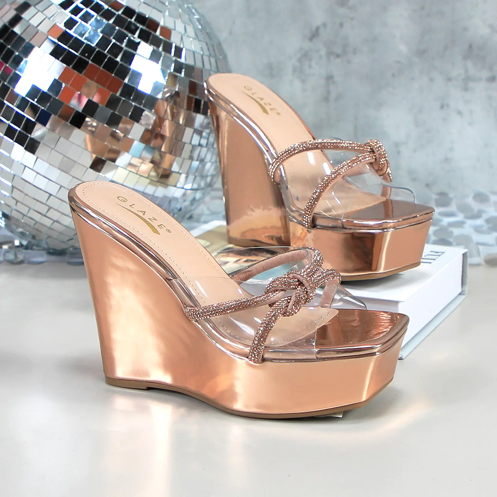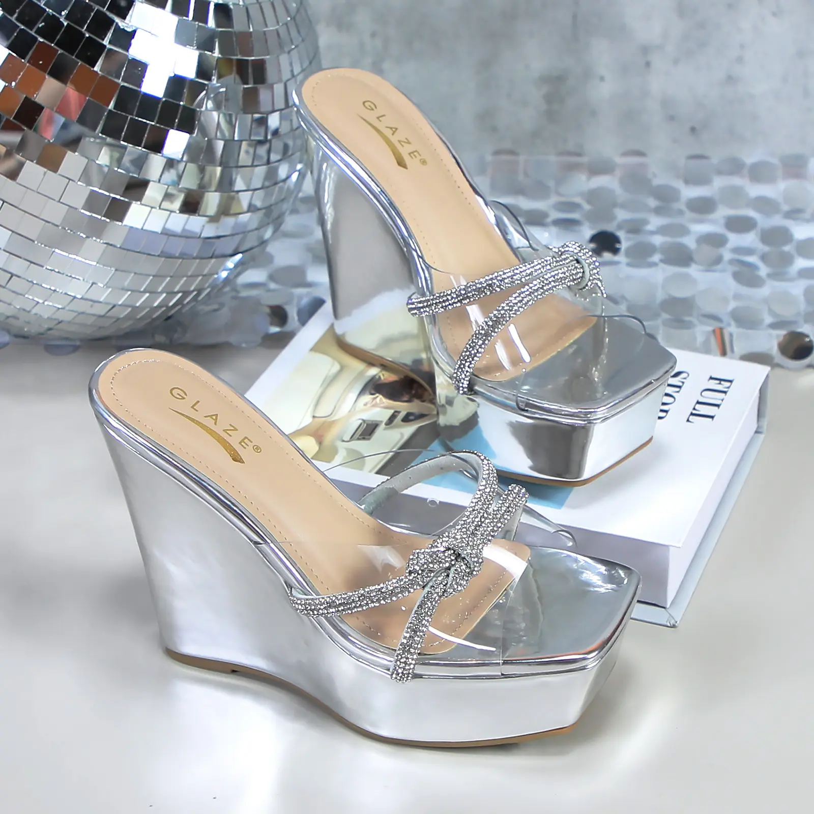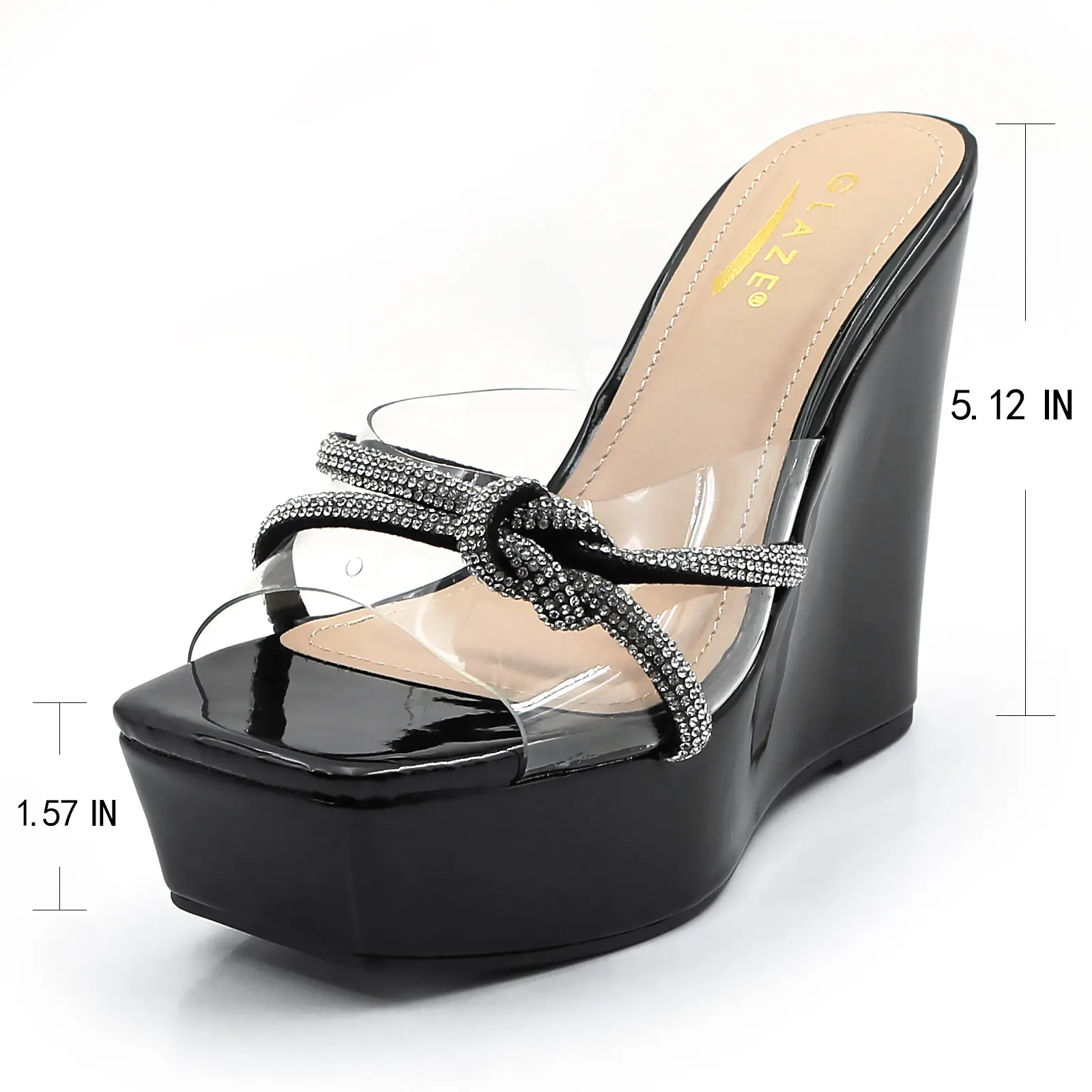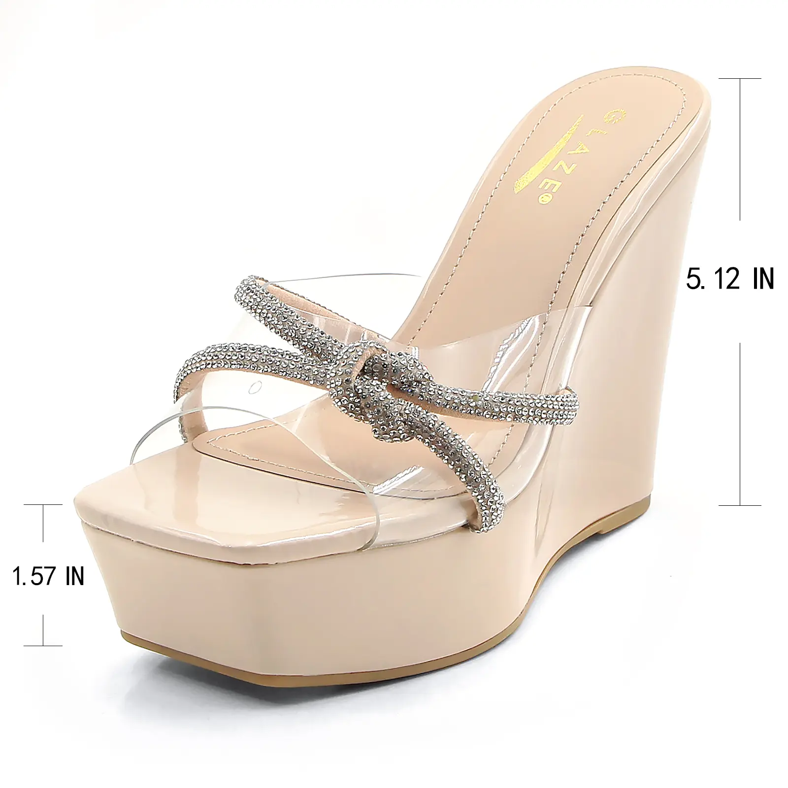 ·Fashion Design: These women's wedge platform sandals feature a clear transparent strap with sparkly glitter rhinestone knot and square open toe design ,making these sandals fashion and eye catching. Perfect for weddings, parties, and daily wear. The wedge platform adds a stylish lift. Heel Height approx 5.12-inch,platform approx 1.57-inch.