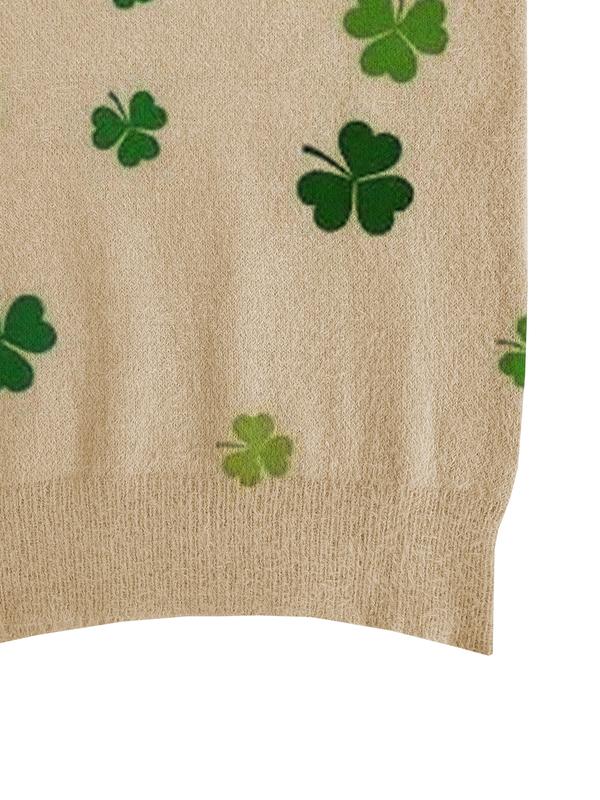 Women's Clover Print Small Collar Sweater, Casual Sleeveless Knitwear for Autumn Winter, Comfortable Versatile Top for All Seasons