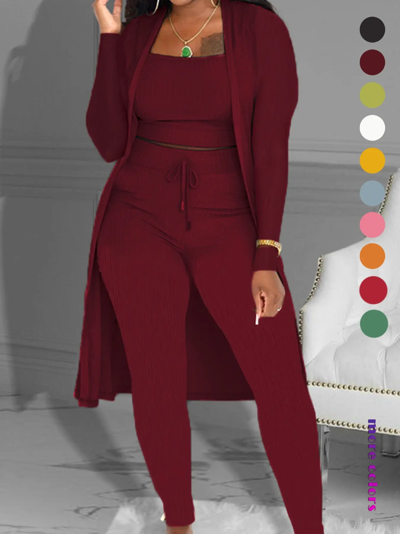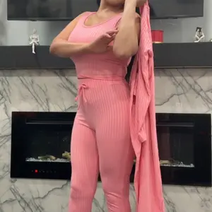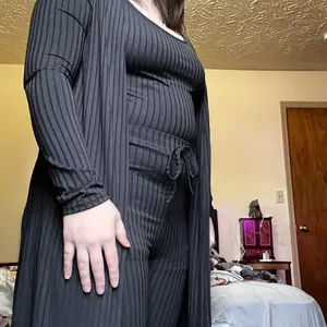 This outfit fit so nicely! Perfect. I'm 5'8" 180lbs and I got the large which is my usual size in burgundy. The pants were long enough. The tank top was the perfect crop and met right at the top of the pants. The sleeves on the cardigan went all the way to my wrists. The material feels so nice and comfortable with good stretch and not too thin or see through. I dressed it up with heels and wore it to a show at a theater. Can be dressed up or down.