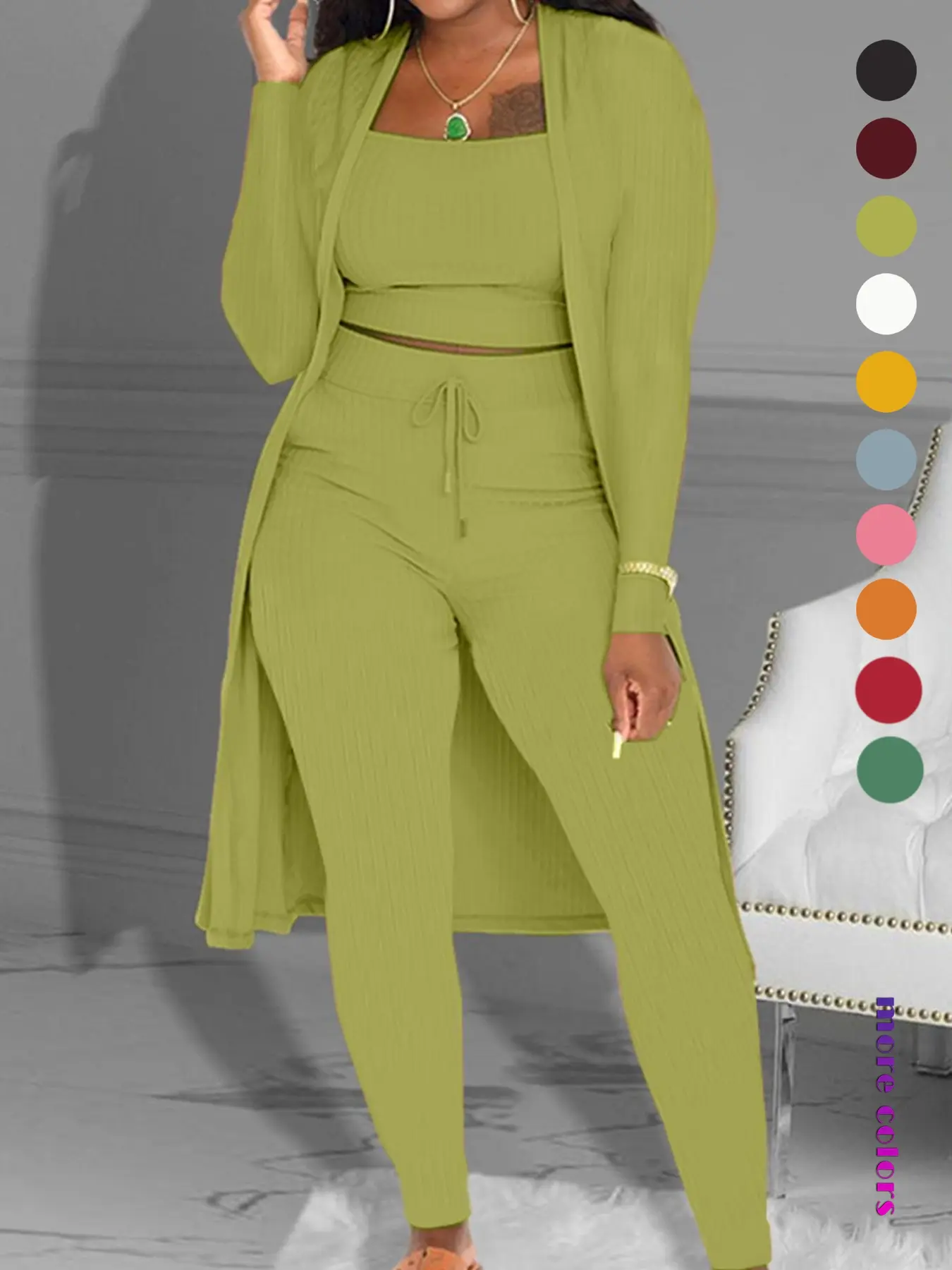 I absolutely love this three-piece outfit. It is comfy. It is stretchy and I love the color!
