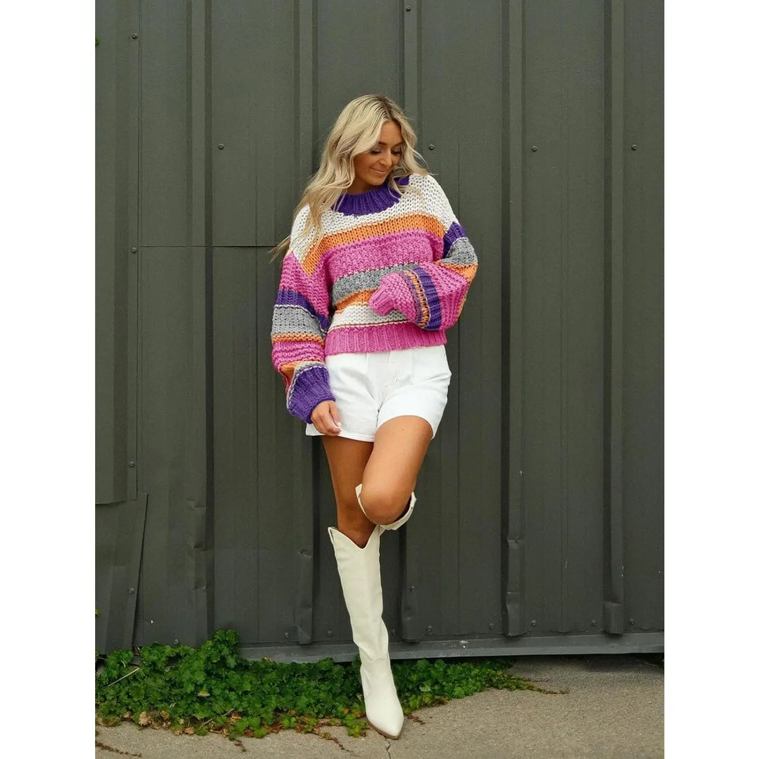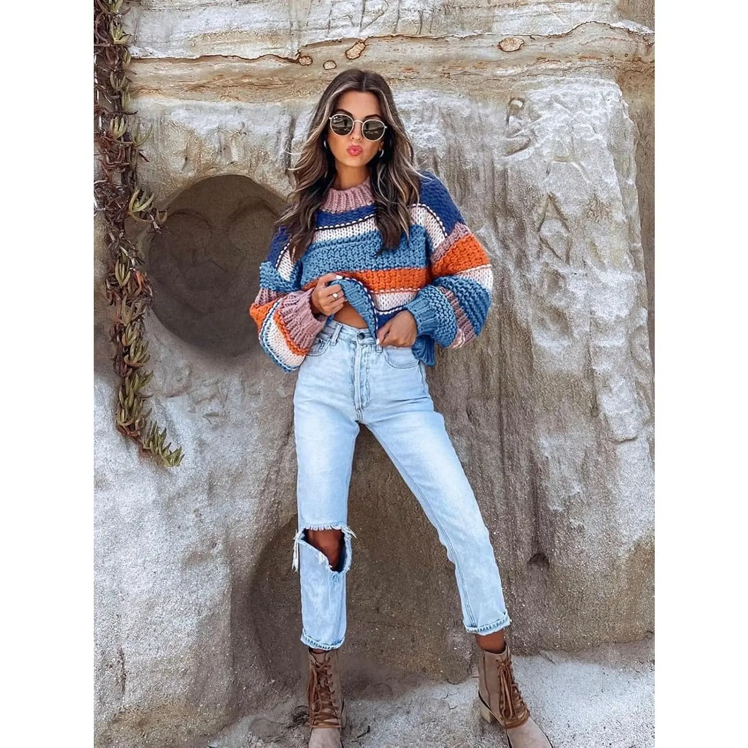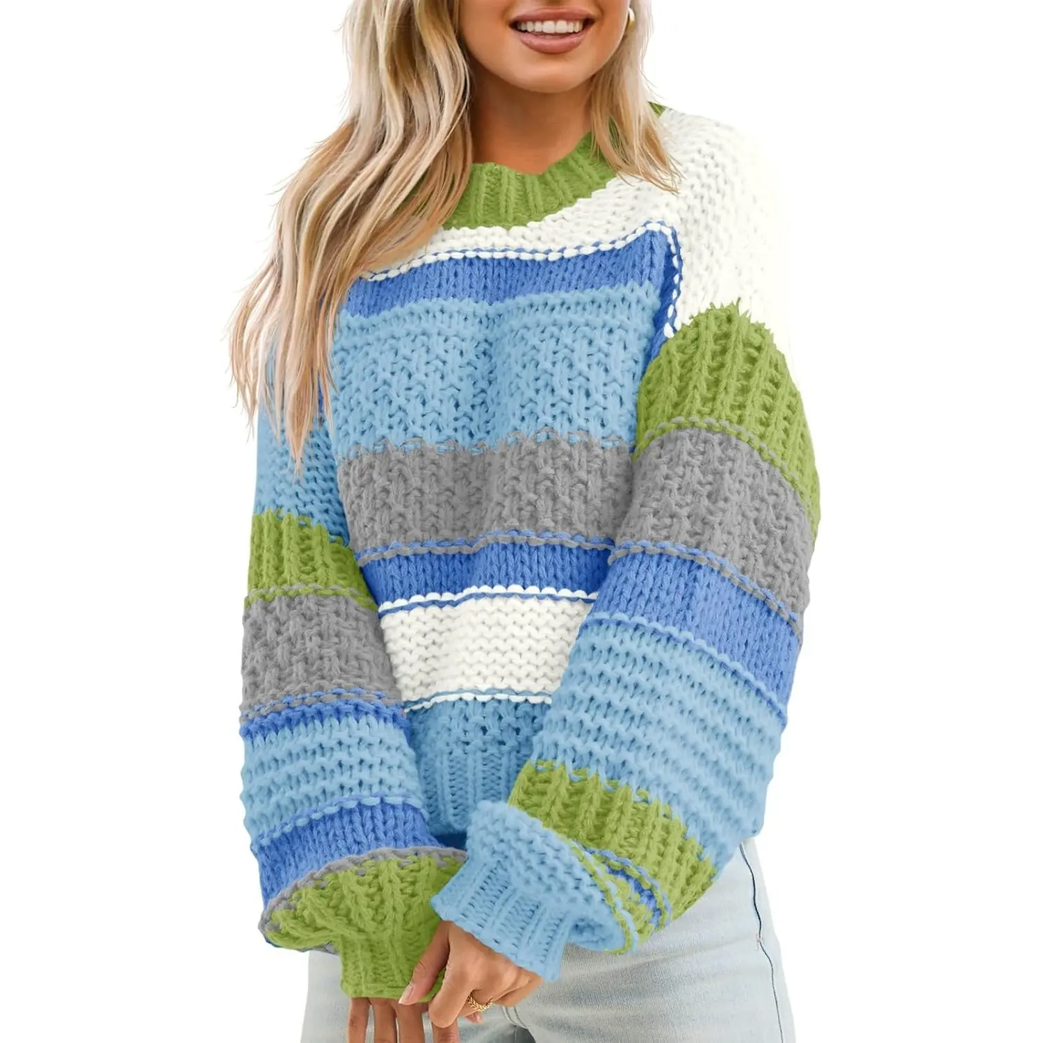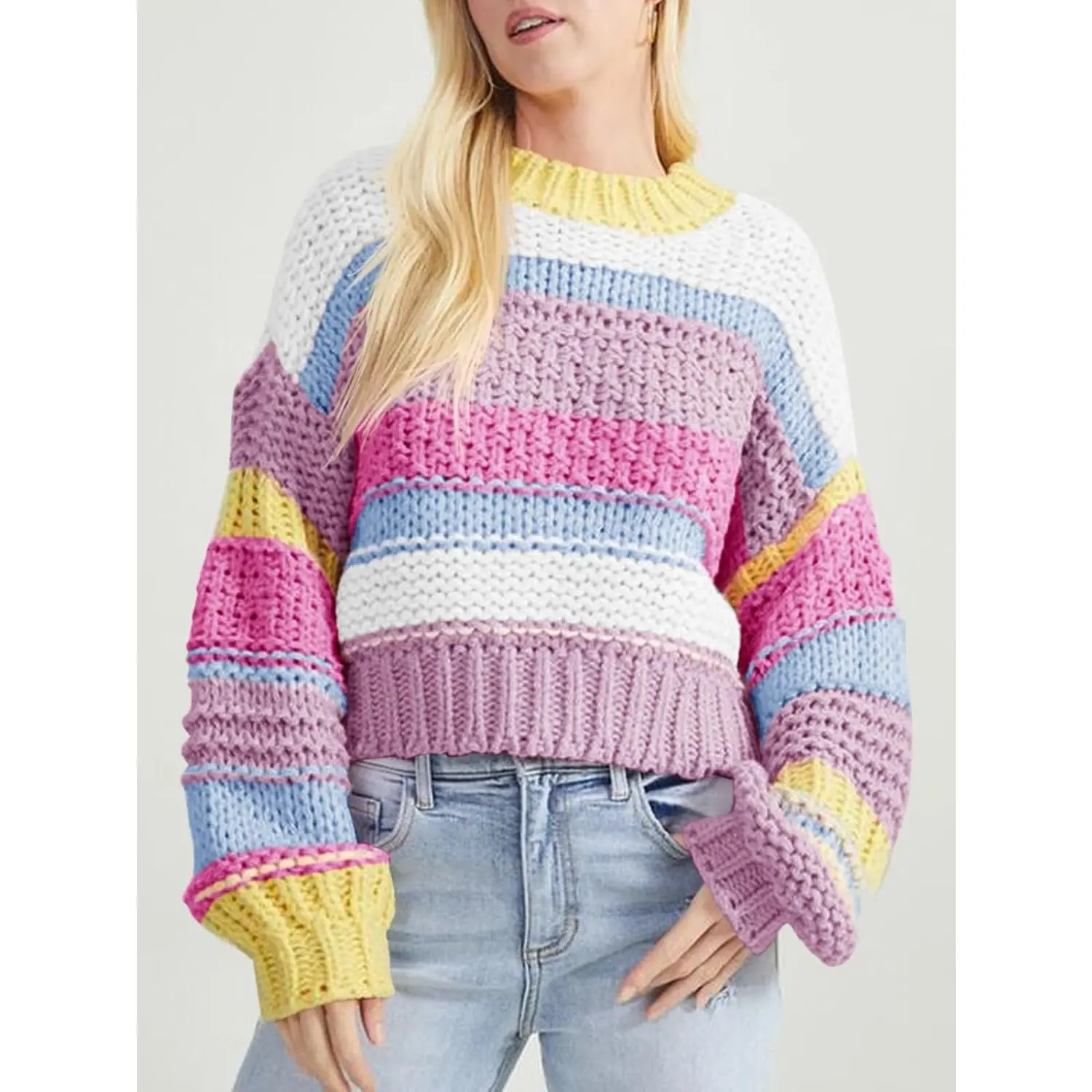 ·Feature: Womens striped sweater features long sleeve, color block stripes, casual loose fit, crew neck, cropped length, drop shoulder, chunky knit, oversized colorful sweater, fall sweaters for women.