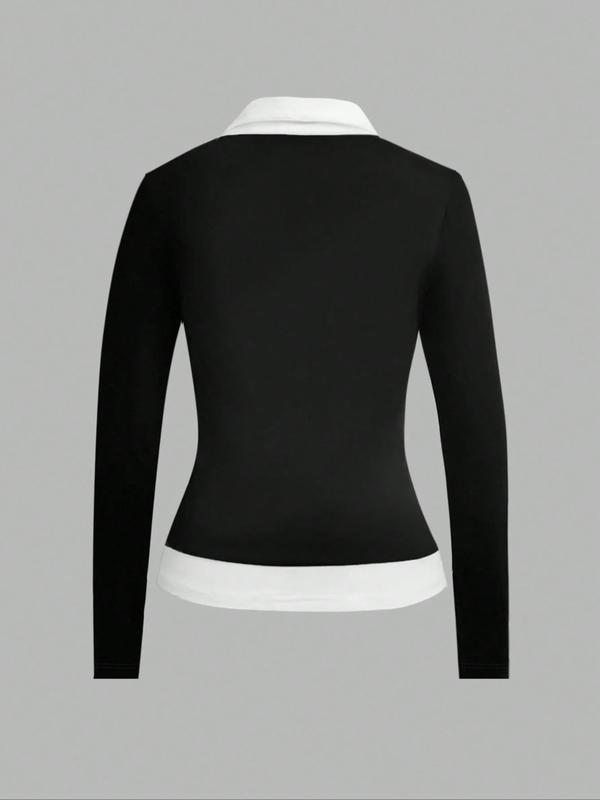 Colorblock faux two-piece top 🤍🖤 Layered look, one simple piece ✨🍂 #fauxtwopiecetop#colorblockpatchworktop#shirtcollarblouse#slimfitlongsleevetop#layeredlooktop#patchworkblousewomen#dailywearblouse#versatilewomentop#colorblockblouse
