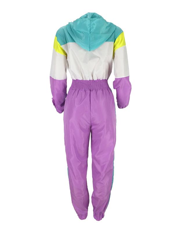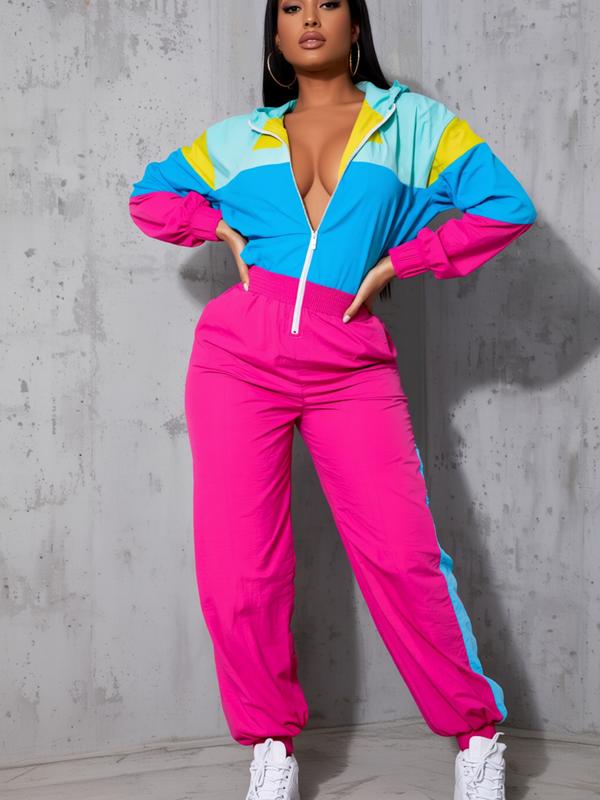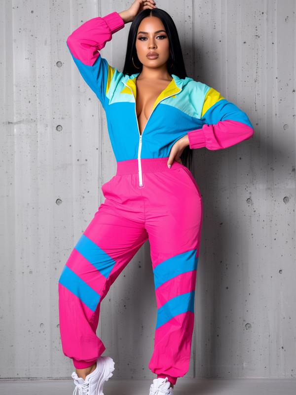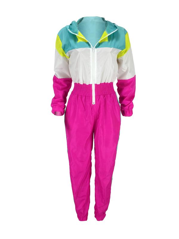 Women's Colorblock Hooded Jumpsuit with Zipper Pockets, Elastic Waist Casual Fitted Overall, Lightweight Windbreaker Jumpsuit, S-Xxl Sizes Available #tracksuit #joggerset #thermaljumpsuit #sweatsuitset #womenssweatshirtset #tracksuits #plussizejacket #colorfuljackets #fashionablewomensclothing #hollisterjacket