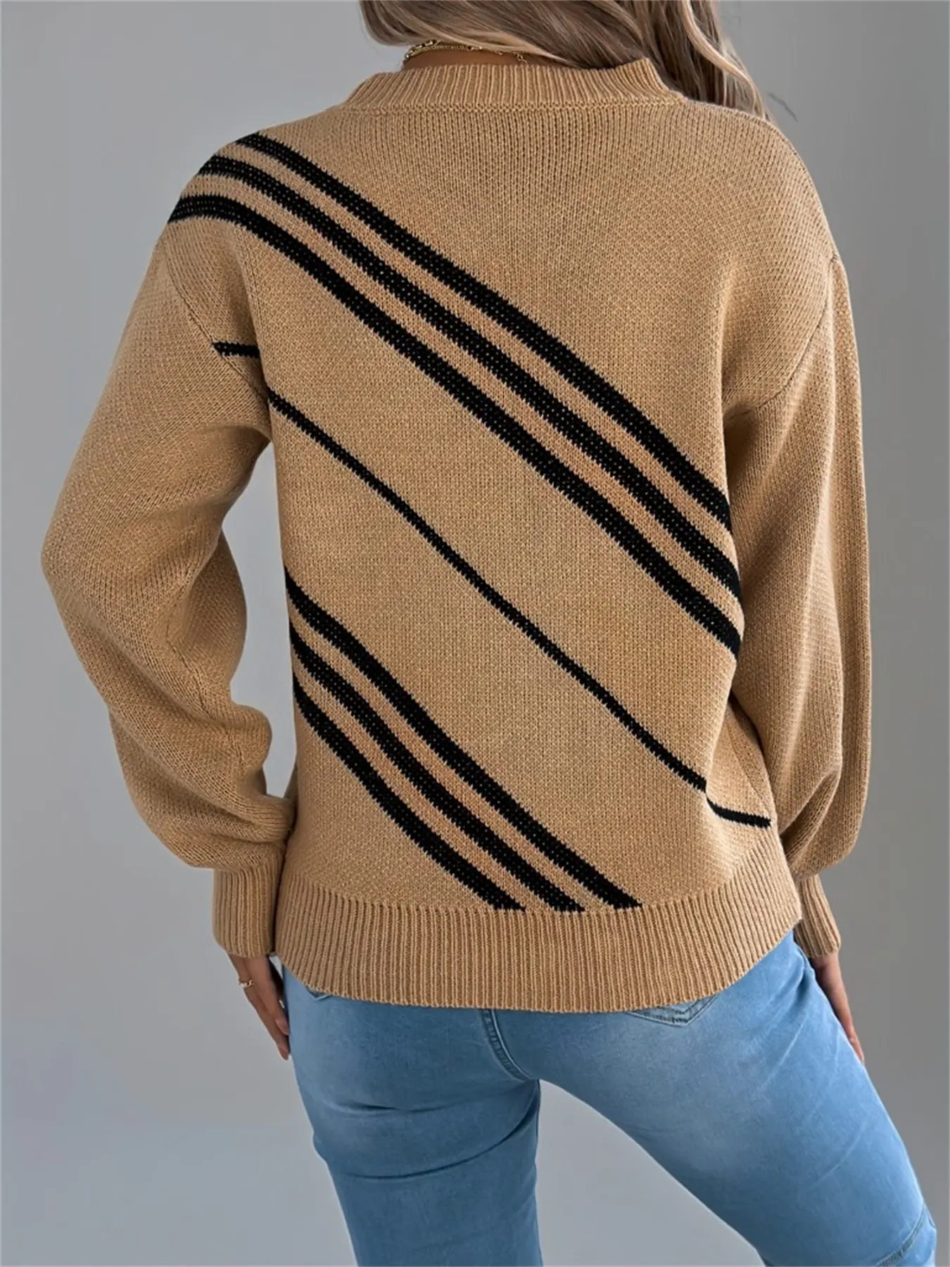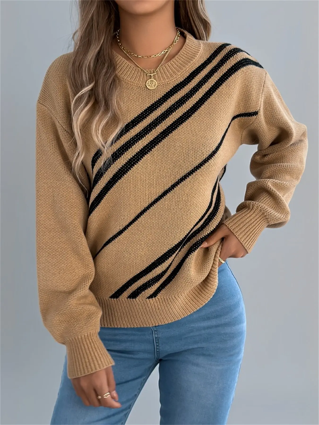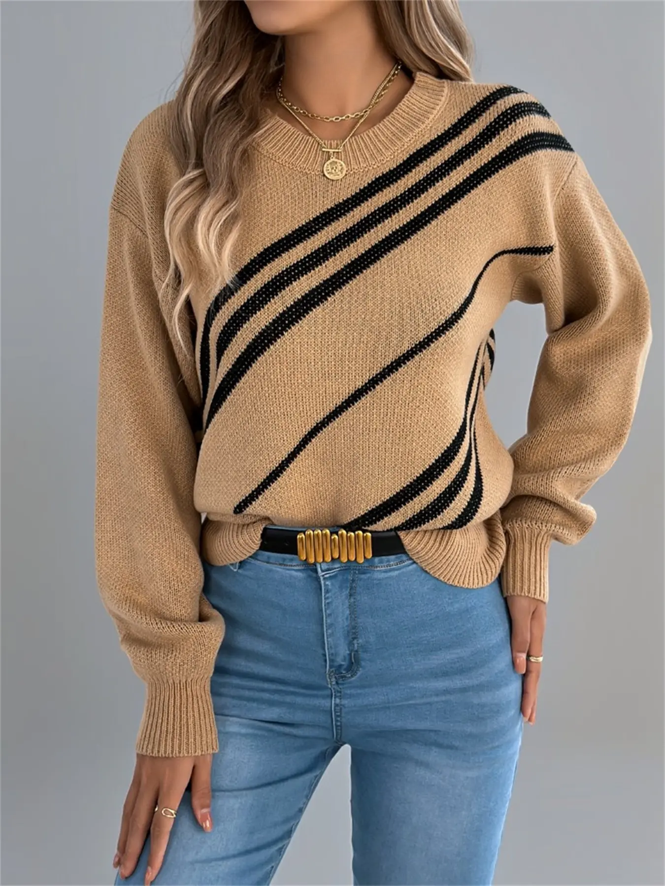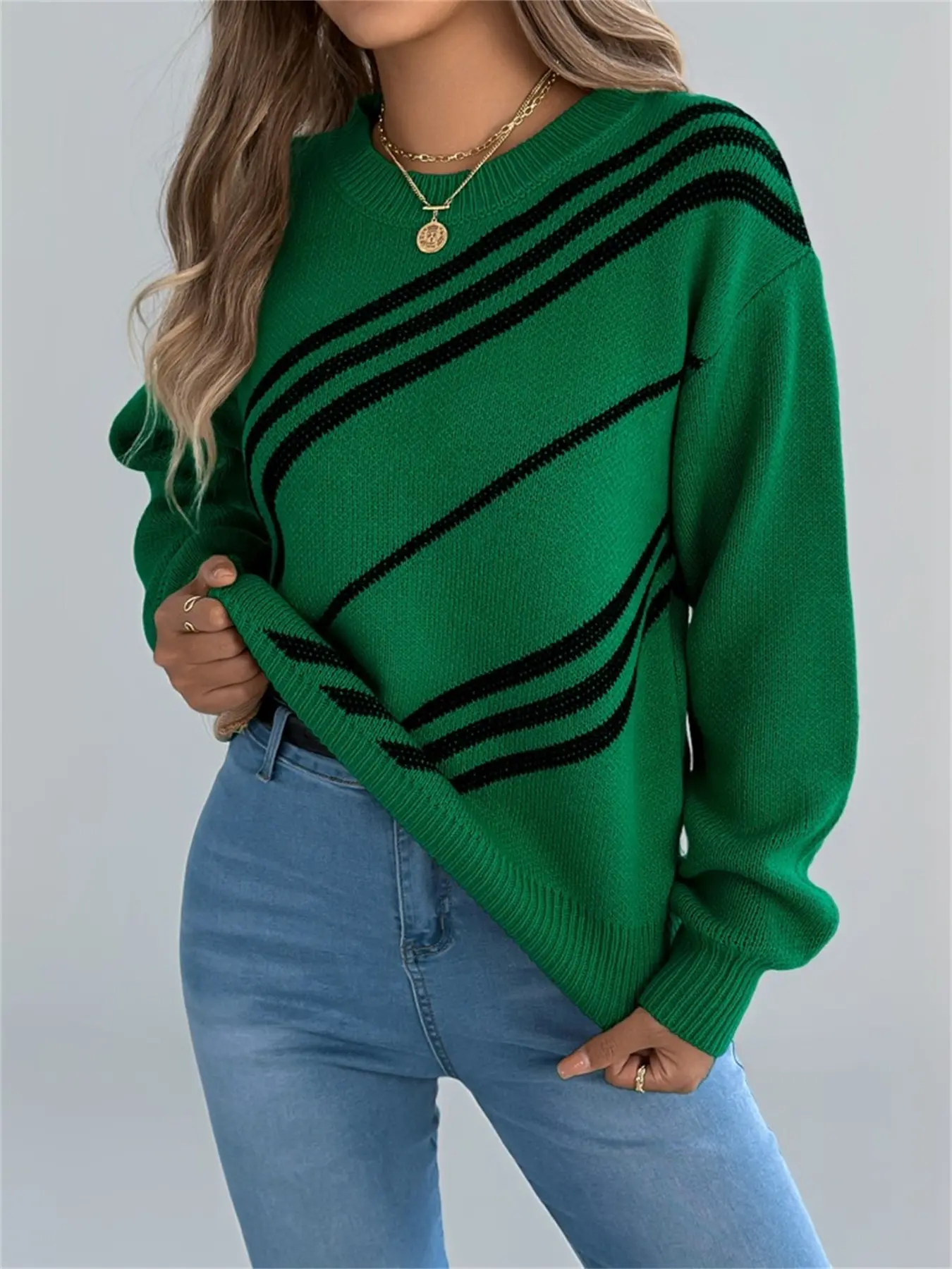 Women's Colorblock Drop Shoulder Fitted Sweater Tops, Casual Long Sleeve Round Neck Jumper for Fall & Winter, Fashion Ladies' Knitwear for Daily Wear
