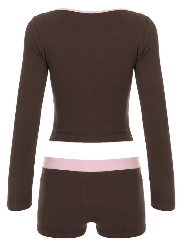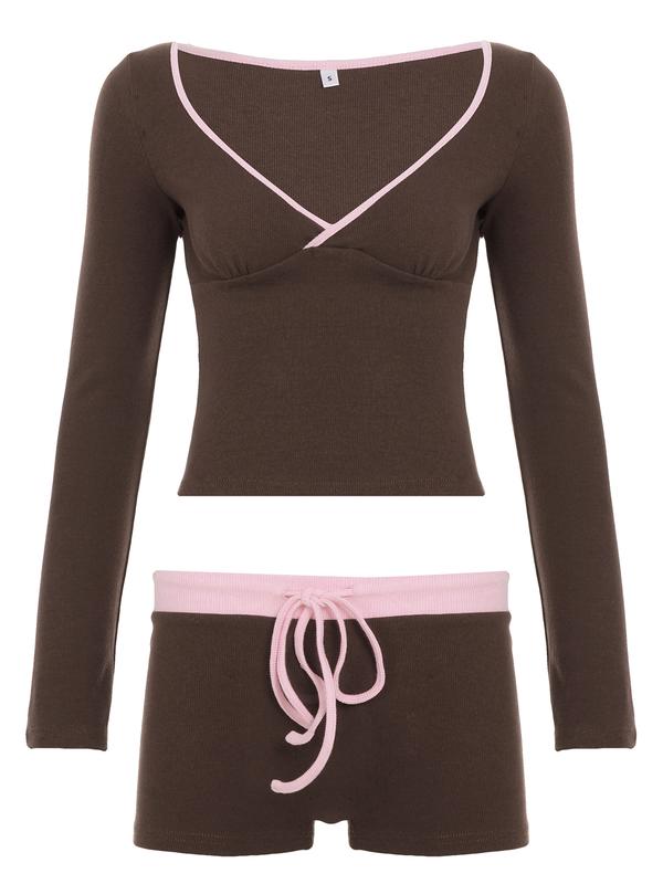 5. Women's Colorblock V Neck Long Sleeve T-Shirt & Shorts Set, Casual Home Wear, Comfortable Two-Piece for Daily Use