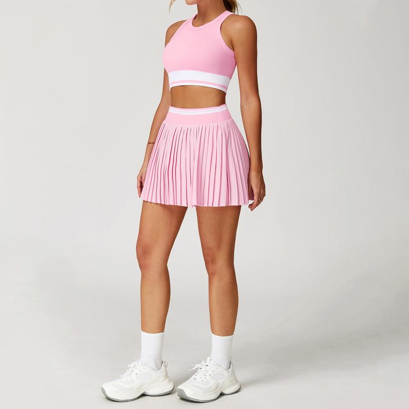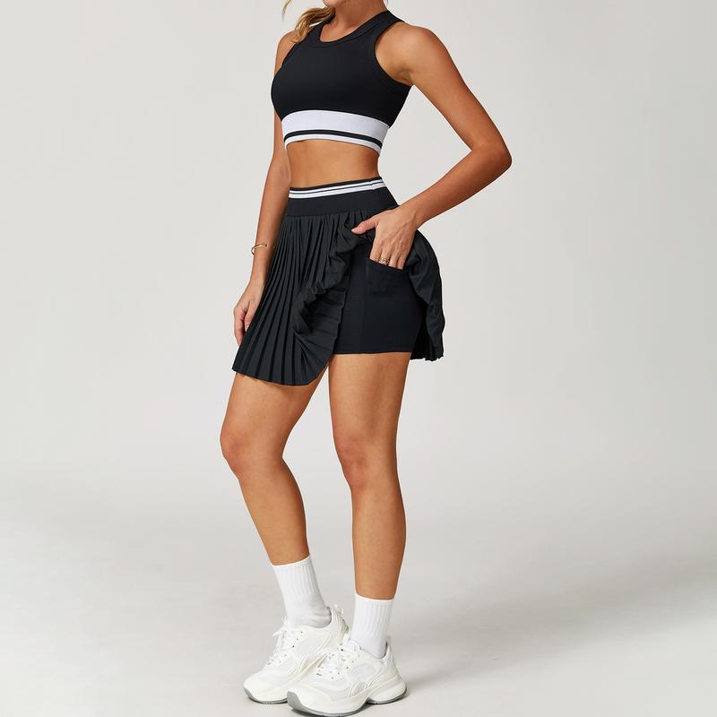 Level up your look and performance with this stylish, athletic tennis set. Includes a pleated skirt, high-waisted ruffle skirt, athletic skirt, and running shorts with pockets — perfect for fitness, tennis, or running.
