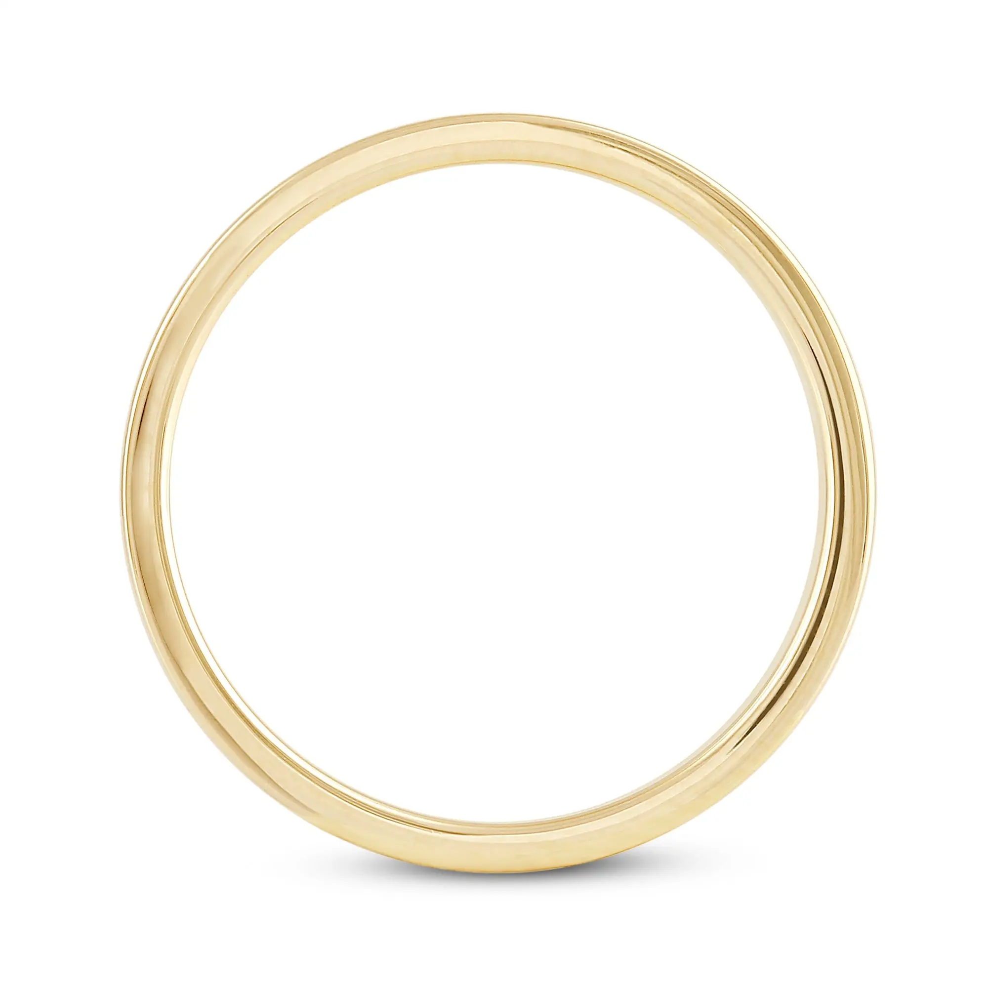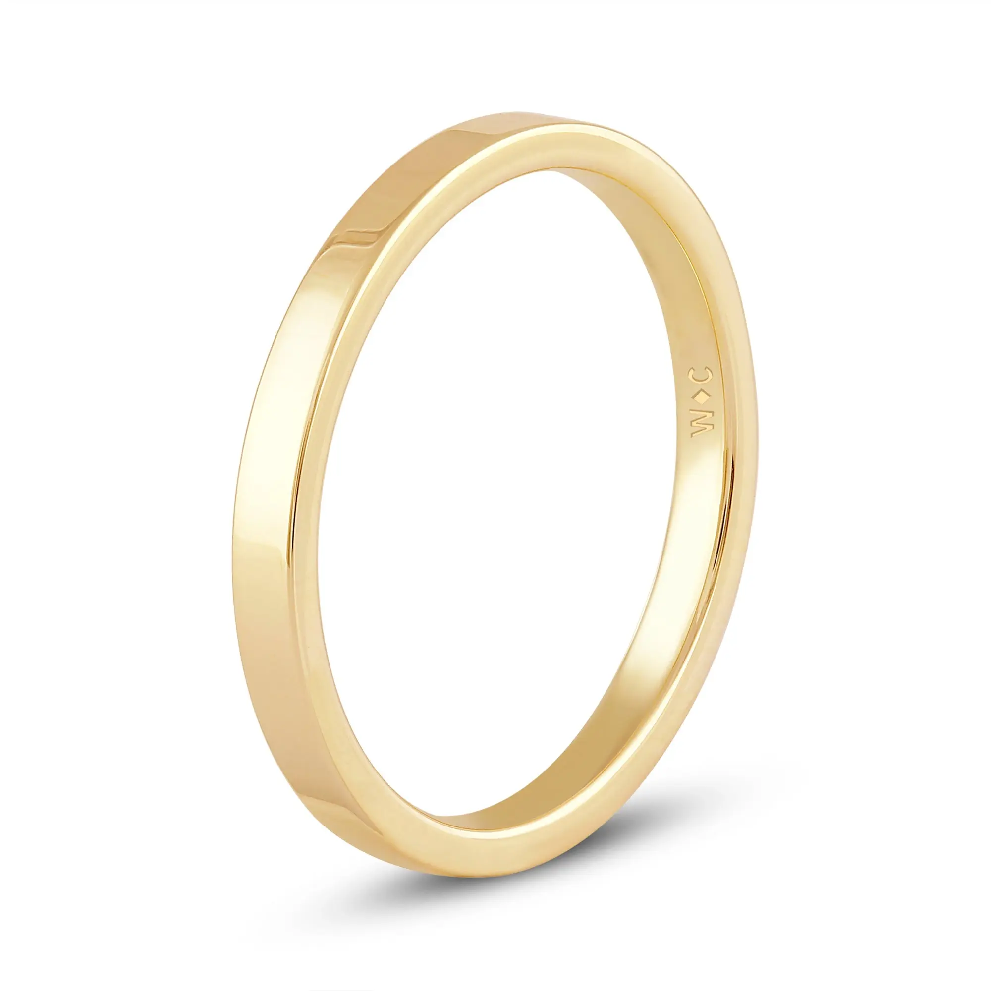Your no-frills wedding band that will never go out of style. This flat wedding ring for women is fashioned from 14K yellow gold and has a 2mm band thickness. The outer surface of the ring is polished and flat-profiled for that restrained edginess. The inner wall of the band is slightly curved to follow the natural curve of the finger and make the ring more comfortable for daily wear.