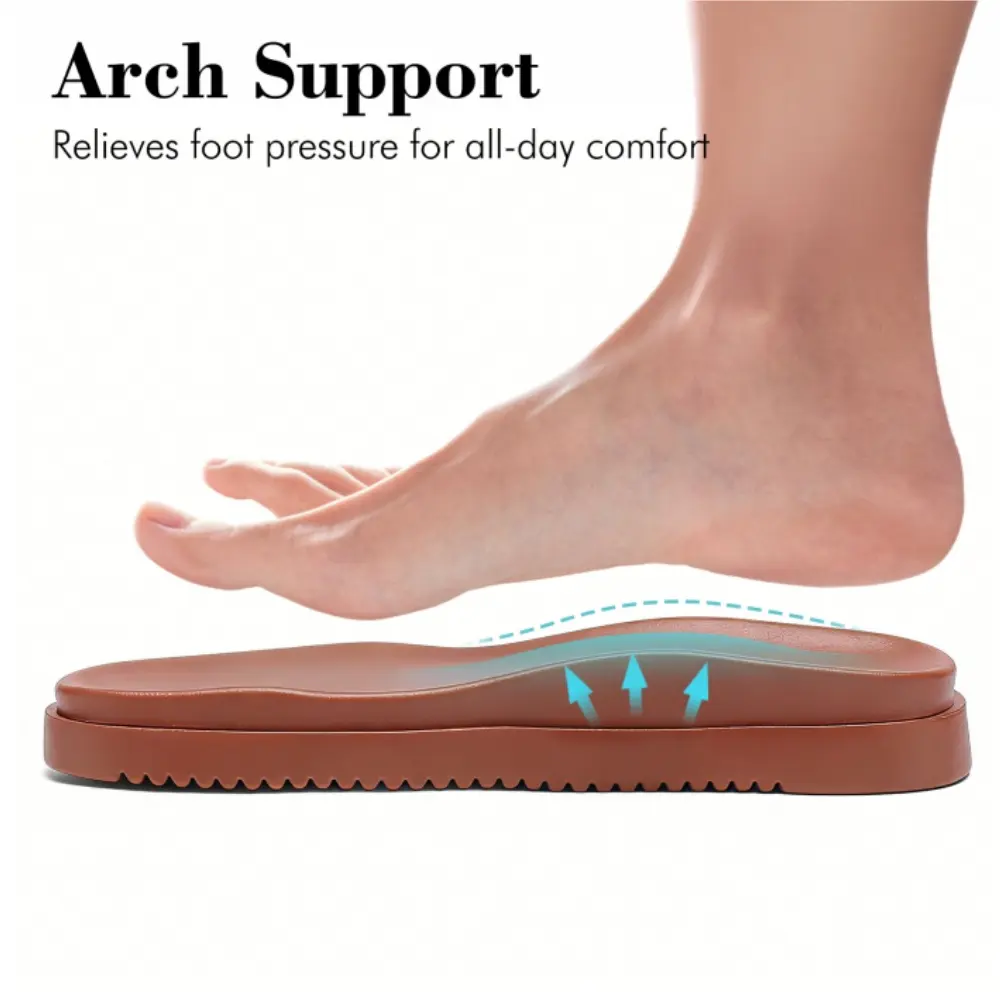 Arch Support Technology: Anatomically contoured footbed with built-in arch support evenly distributes pressure, reducing foot fatigue during extended wear – ideal for walking, standing, or travel.