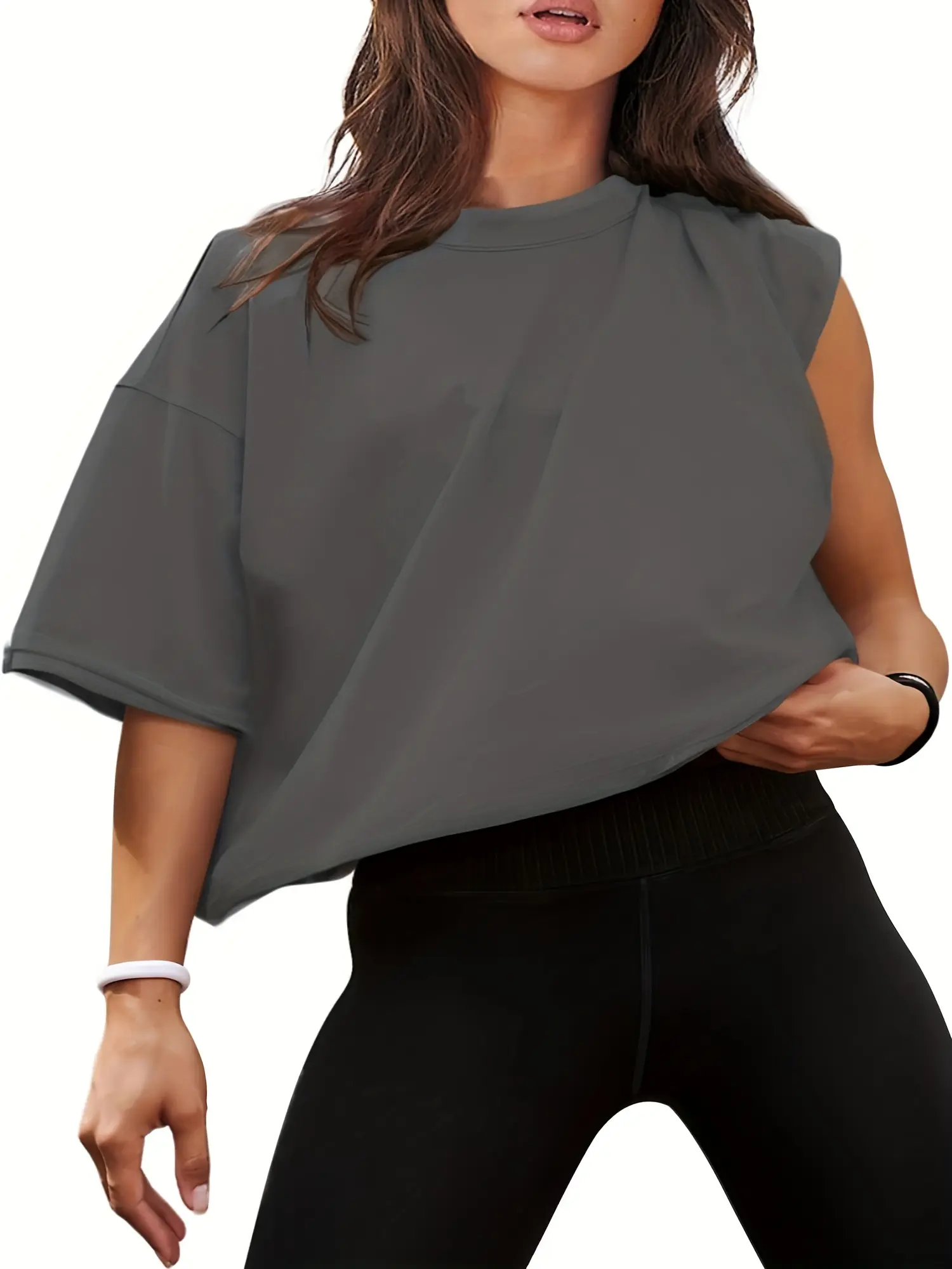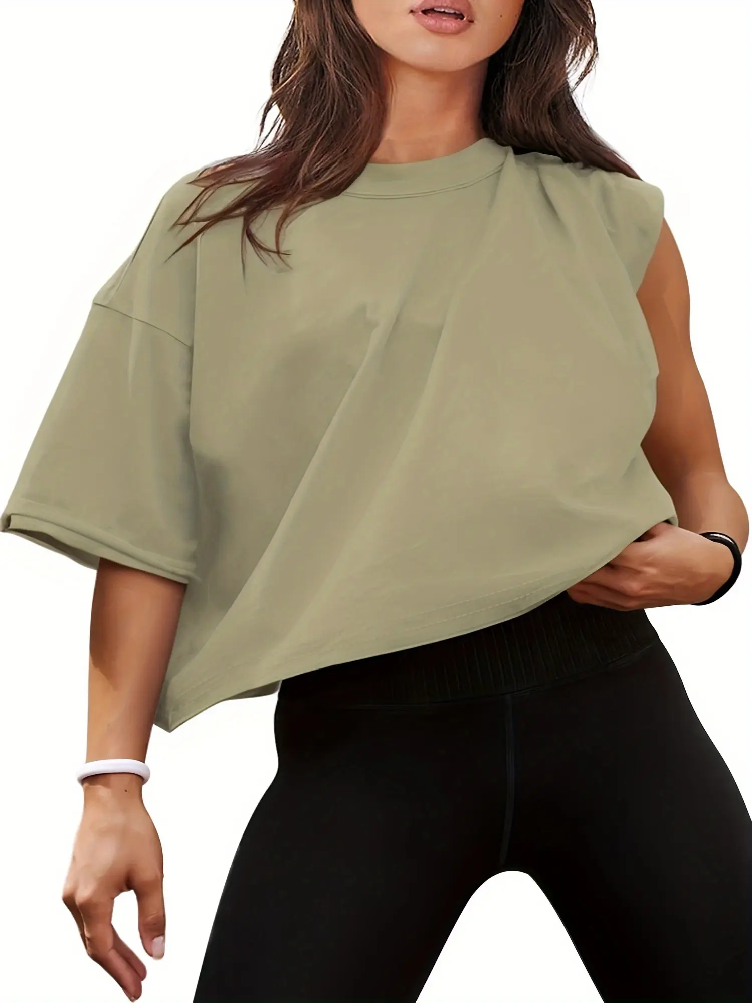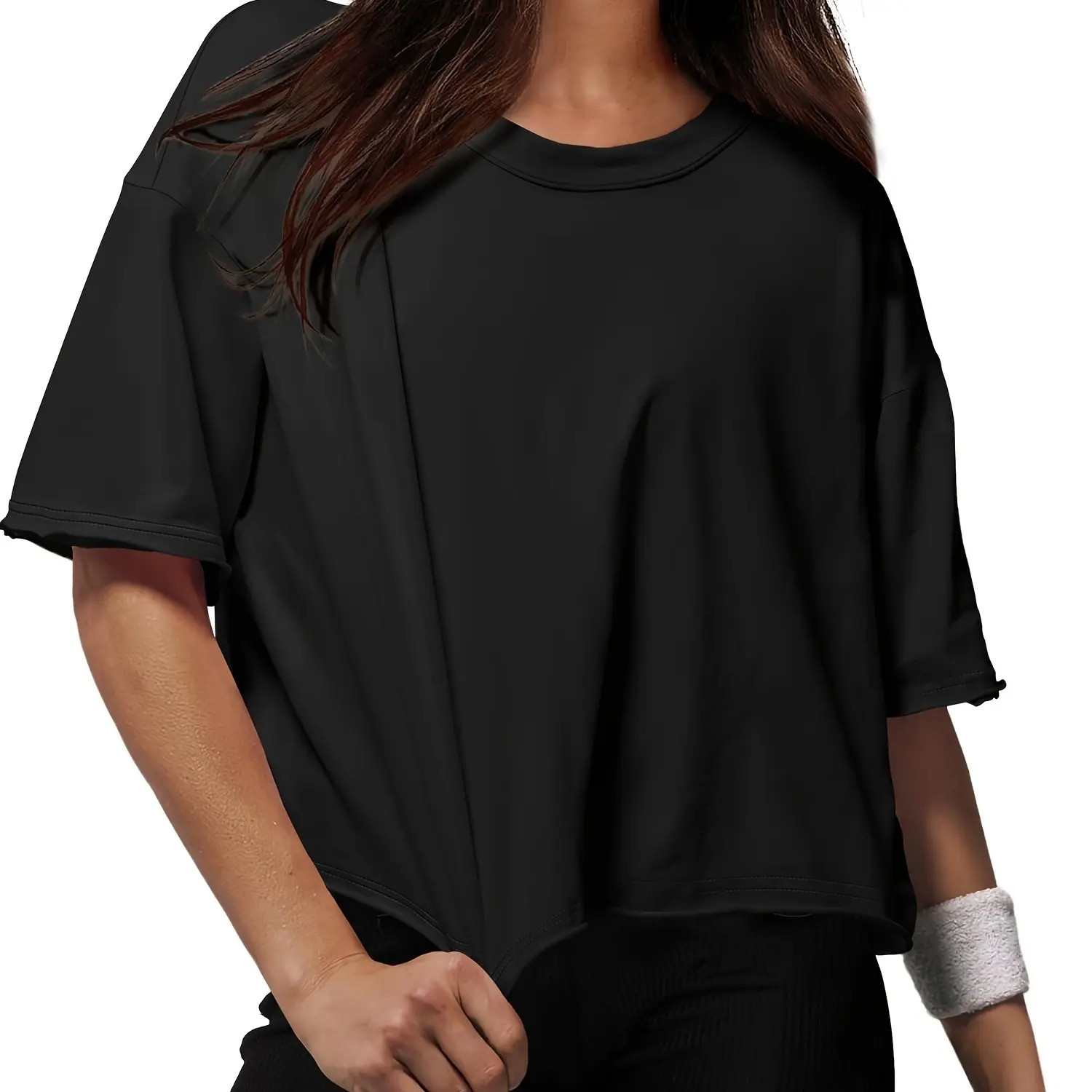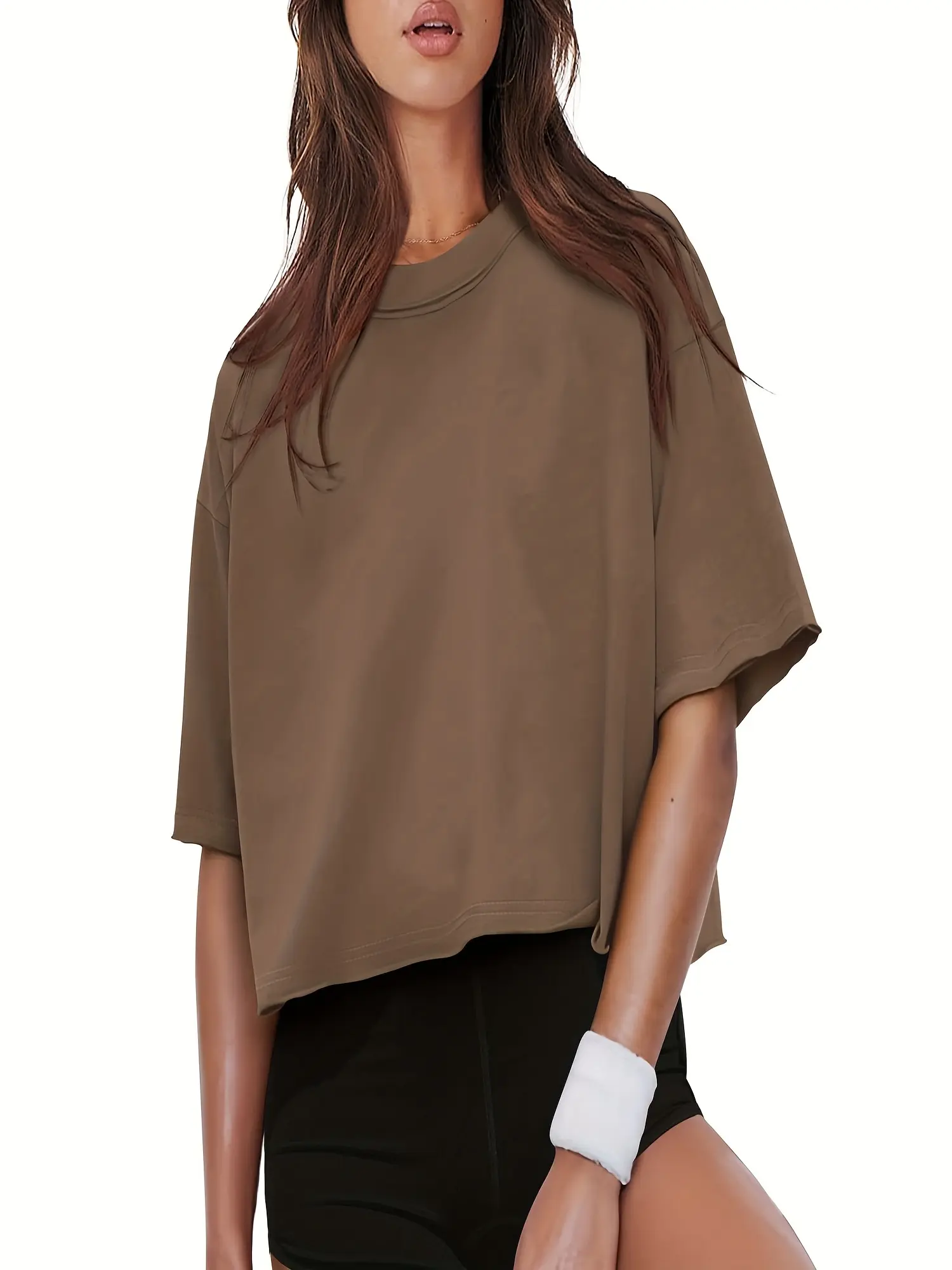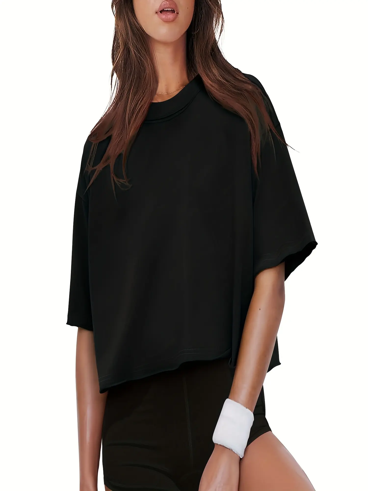 ·Round Neck, Short Sleeves, Drop Shoulder, Oversized Boxy Fit, Cropped Length, Raw-edge Seaming, Basic, Boyfriend Style, Plain Tee Shirt, Soft and Stretchy.