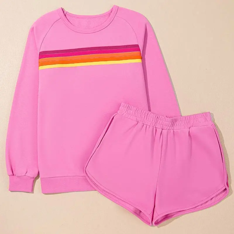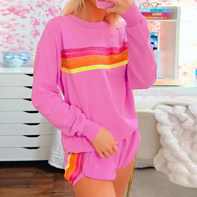Women's Comfy Striped Accent Pullover and Shorts Two Piece Casual Set Pajamas Set Family Pajama Set Cotton Fabric Loungewear • Blue Long Sleeve