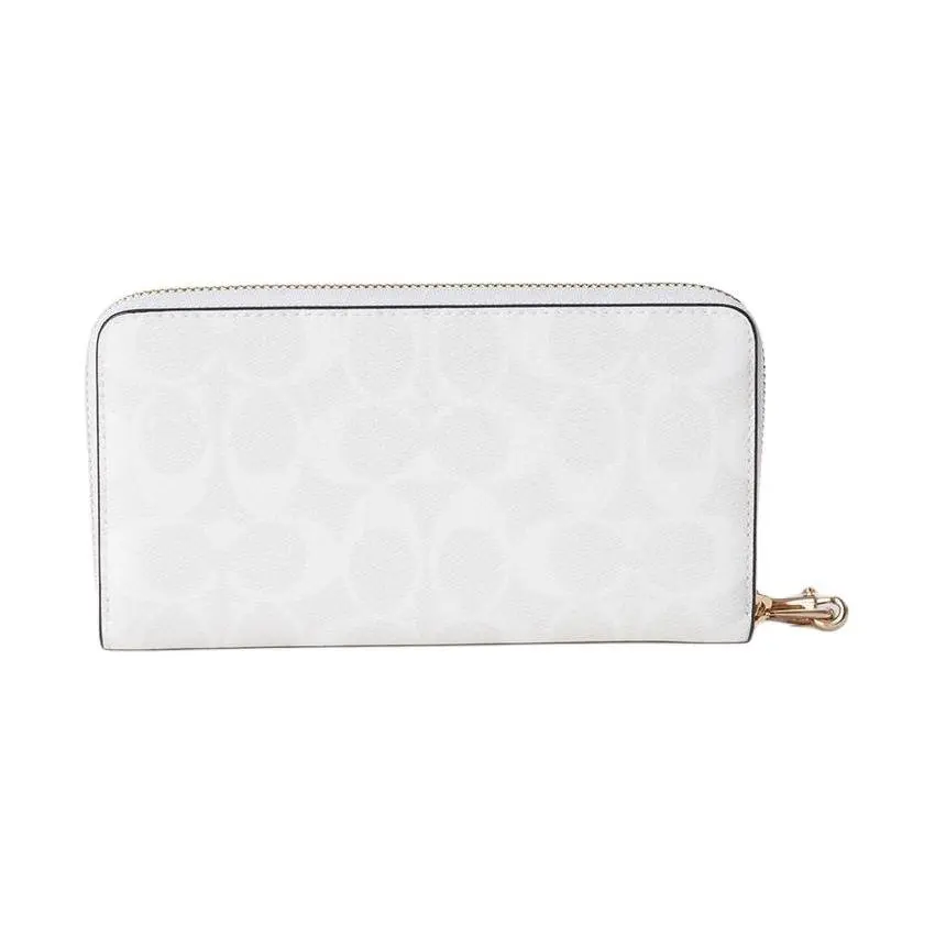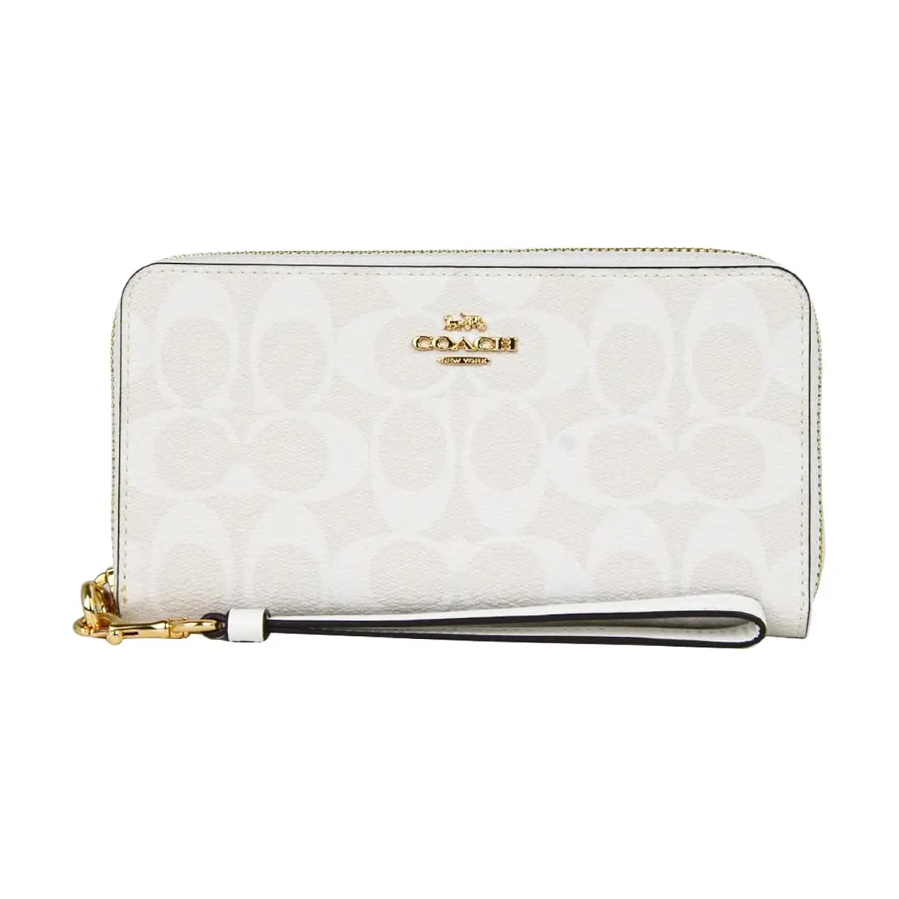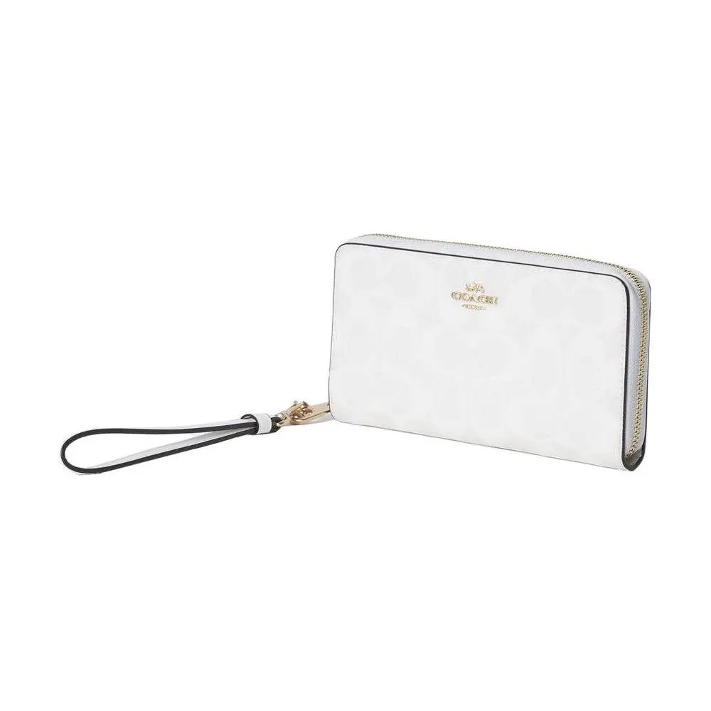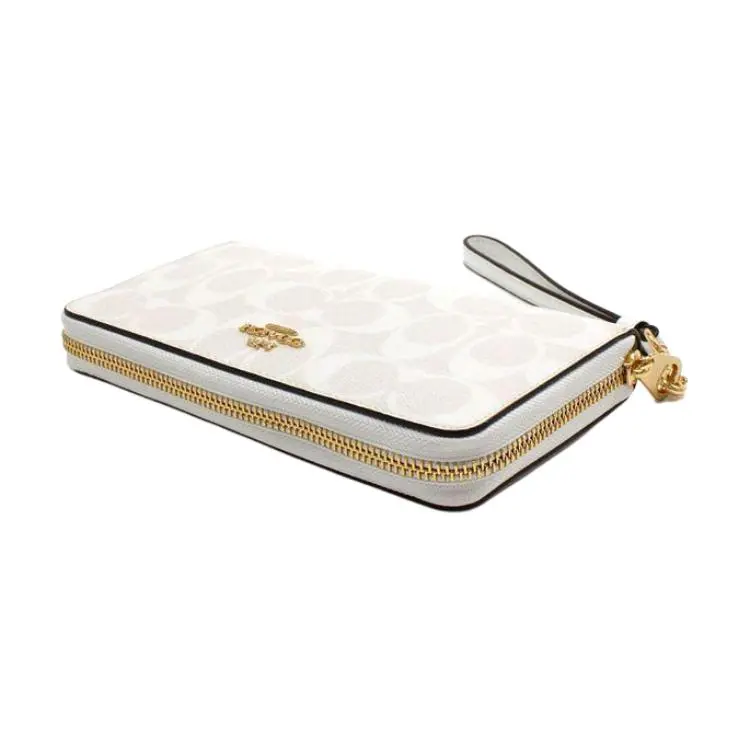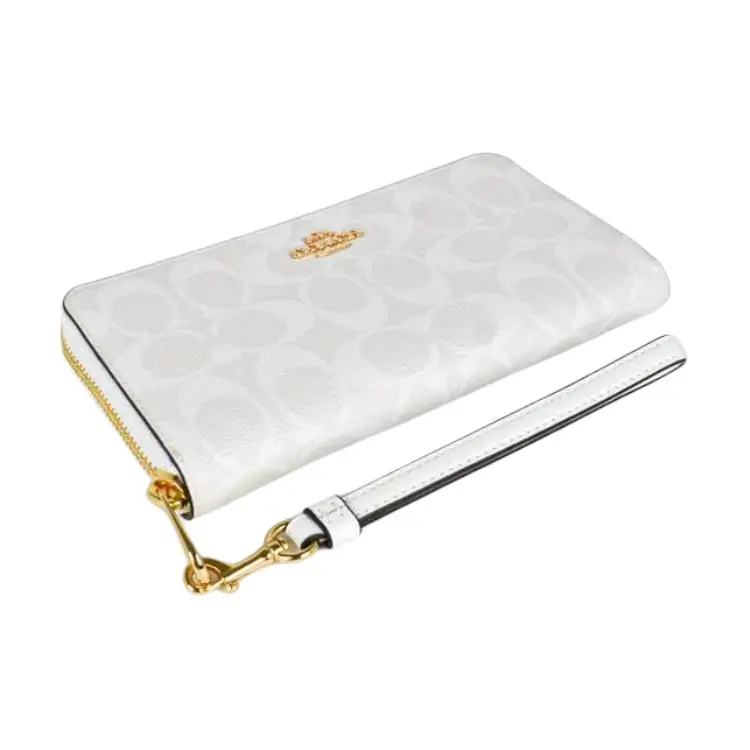 Design Concept: Designed for versatility and elegance, this wristlet combines a sleek zip-around closure with a wrist strap for easy carrying. Its small size makes it ideal as a wallet or mini bag, featuring the iconic COACH monogram pattern in a subtle glacier white colorway. The design emphasizes functionality with multiple card slots and compartments, while maintaining a chic, feminine aesthetic suitable for everyday use or special occasions.
