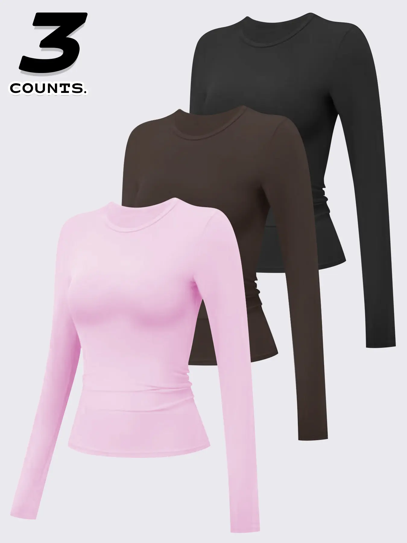 3 pcs Women's Compression Training Long Sleeve Shirts, Fitted Round Neck Yoga Tops, Moisture-Wicking Sportswear for All Seasons, Compression Activewear