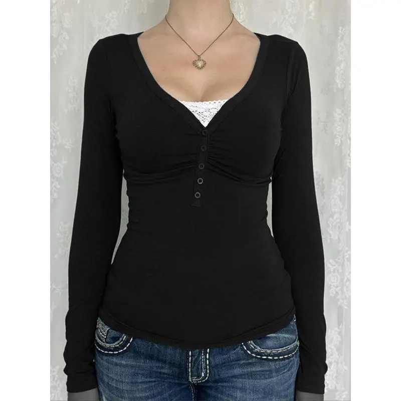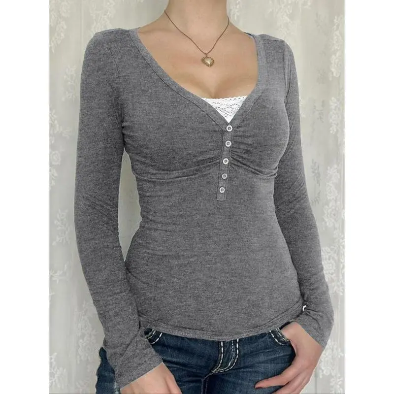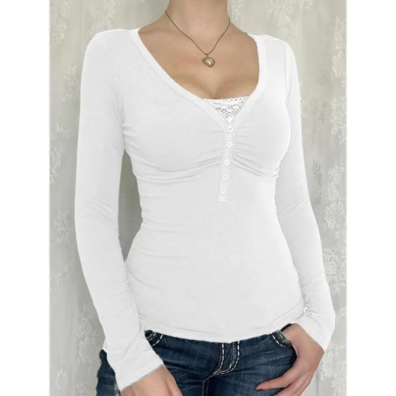 Women's Contrast Lace Button V Neck Tee ? Elevate your casual wardrobe with this Women's Contrast Lace Button V Neck Tee. Perfect for Spring & Fall, this t-shirt is designed for daily wear. The casual long sleeve style adds a touch of elegance to your outfit. ?? This t-shirt is a must-have for women looking to add a stylish yet comfortable piece to their wardrobe. Perfect for casual outings and everyday wear. ??