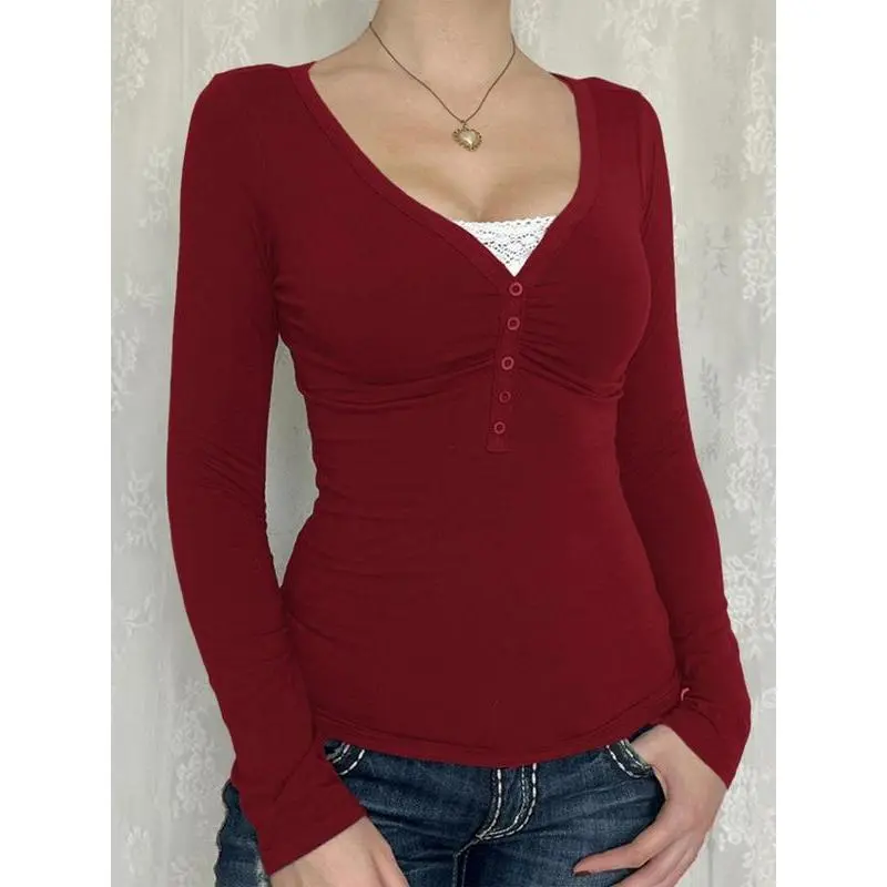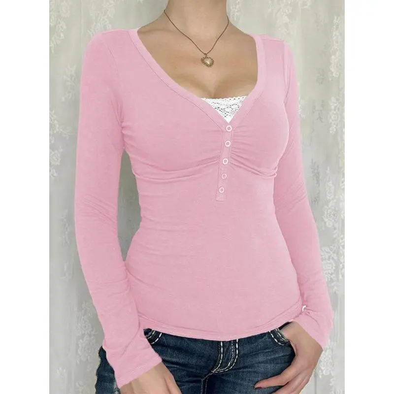 5. Women's Contrast Lace Button V Neck Tee, Casual Long Sleeve T-shirt for Spring & Fall, Women's Top for Daily WearGift