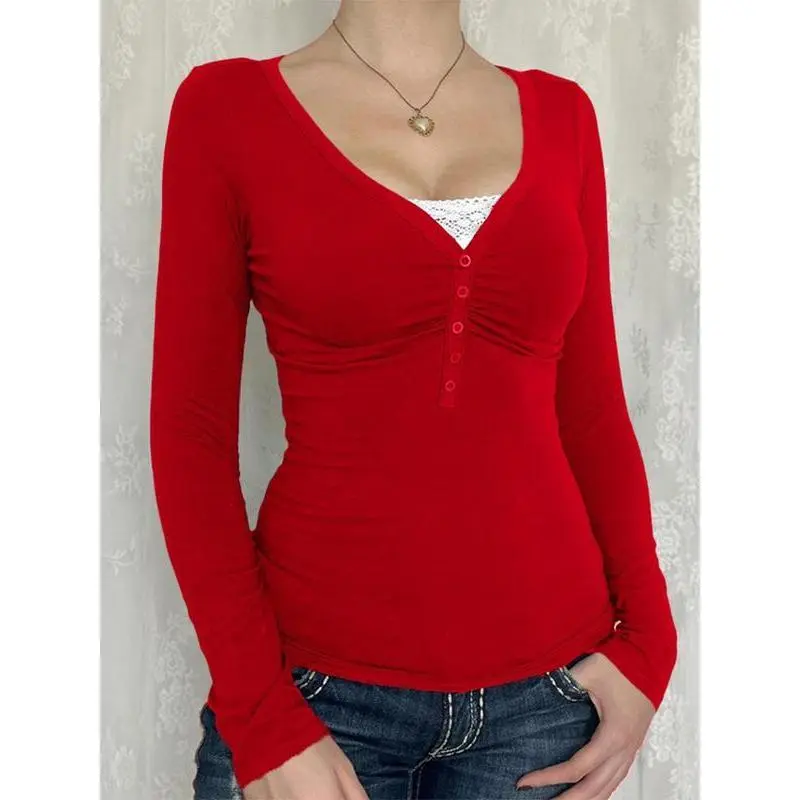 Women's Contrast Lace Button V Neck Tee, Casual Long Sleeve T-shirt for Spring & Fall, Women's Top for Daily WearGift