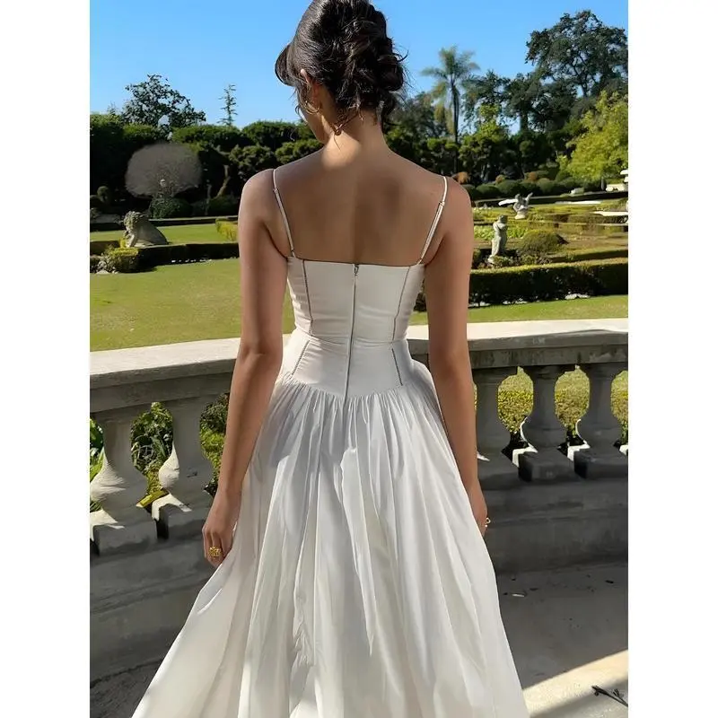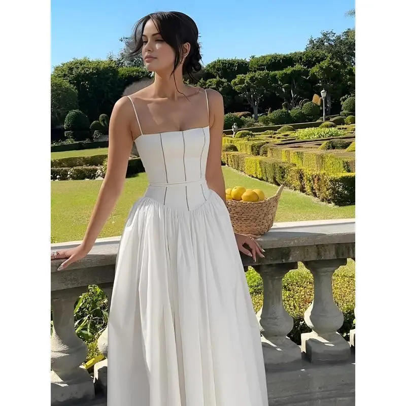 Womens Corset Detail Spaghetti Straps Knotted Maxi Dress Women French Flowy Dress White Women Dress Summer Beach Dress Bohemian Sundresses Womenswear Sleeveless Formal Boho Print