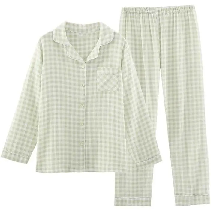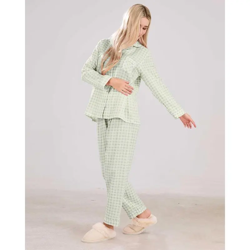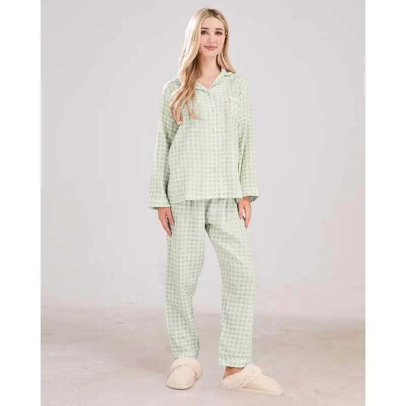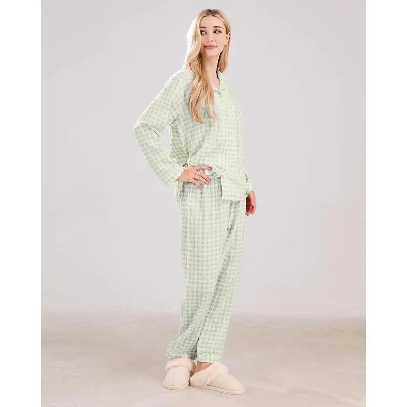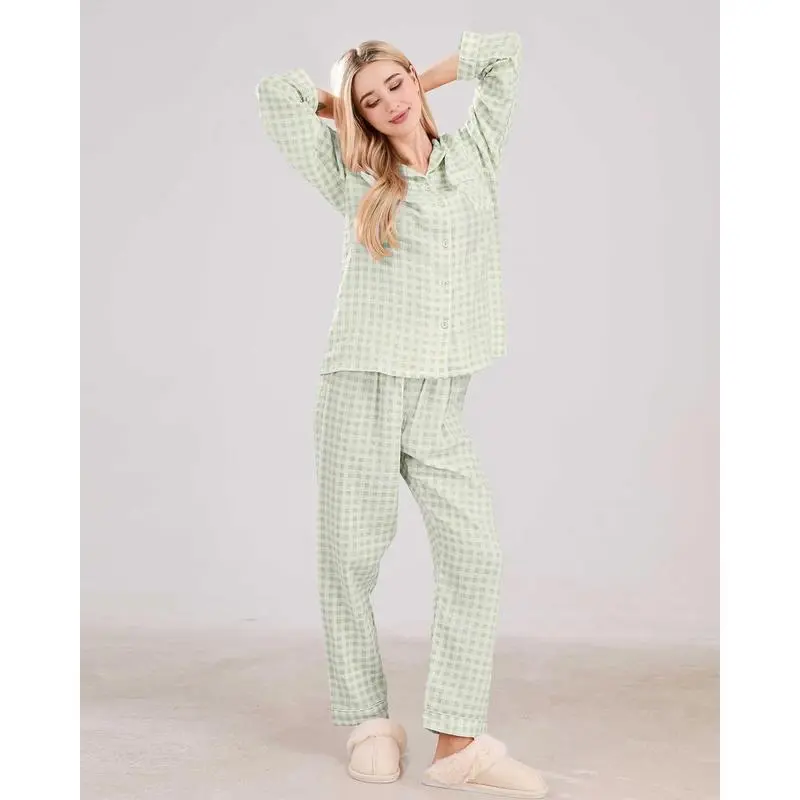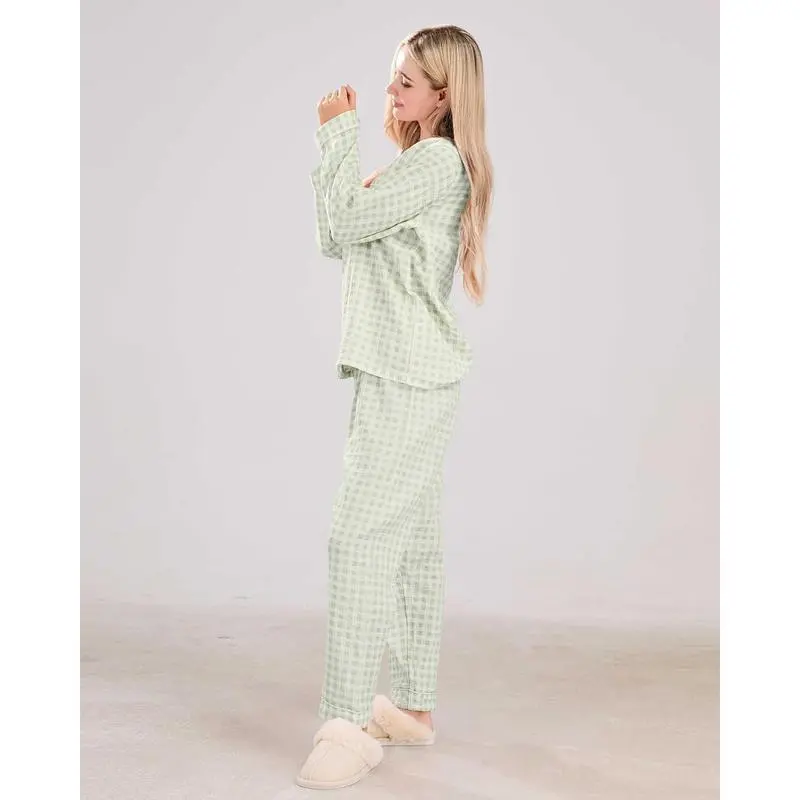 WomensCottonPajamaSetsLongSleeveButtonDownShirtandPantsSleepwear2PieceGinghamPjSet Loungewear Womenswear