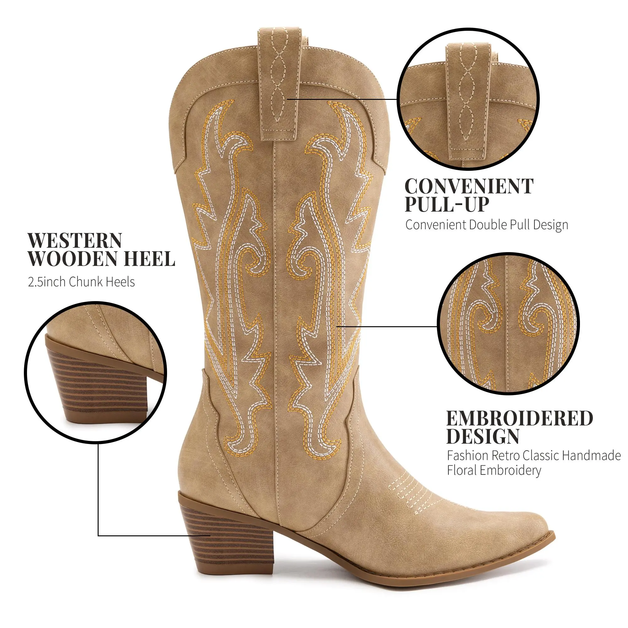 ·Design: These western cowboy boots are designed with classic embroidered, pull-on style, and almond-shaped pointed toe, showcasing a classic but elegant western style.