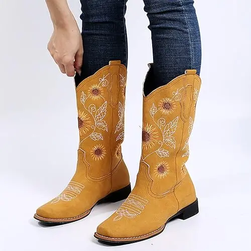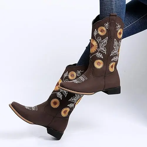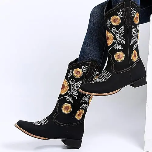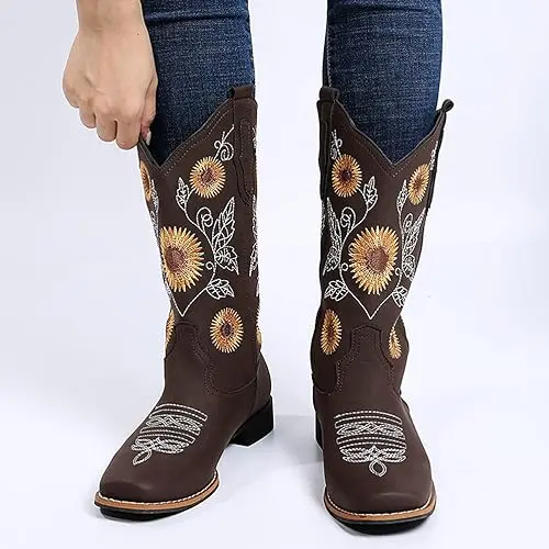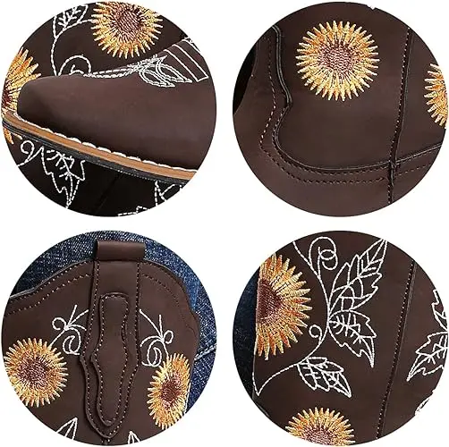 ·【UNIQUE STYLE】These cowboy boots for women features a stitch sunflower embroidery design and a retro western style, which is fashionable and versatile. The hand-stitched flowers are very delicate and beautiful, giving western boots a unique style.