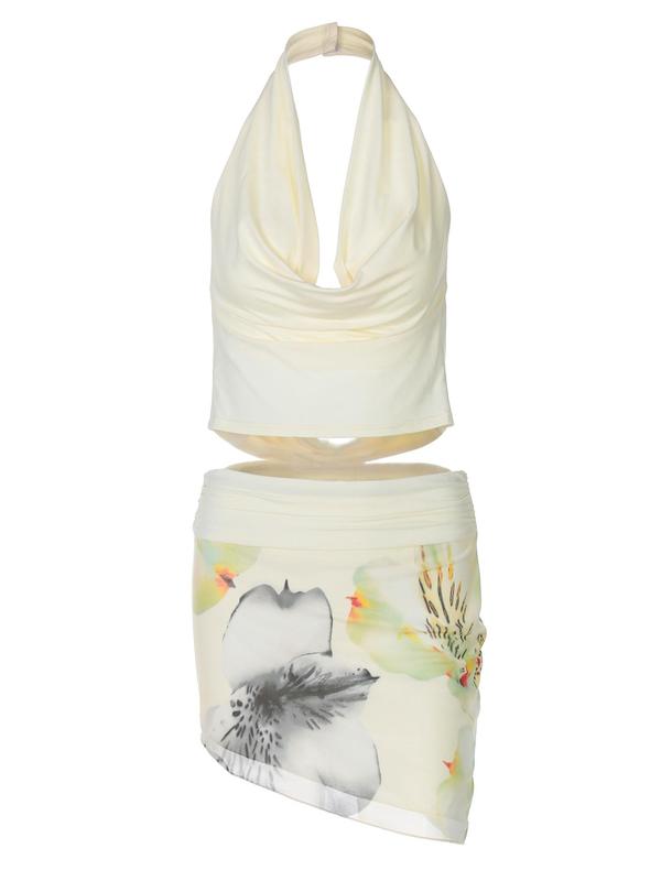 Two-piece Set Women's Mesh Spliced Cowl Neck Sleeveless Halter Tank Top & Floral Print Skirt, Backless Tie Back Tank Top Irregular Hem Mini Short Skirts, Party Club Holiday Casual Outfits Summer Clothes, Fashion Style Sets