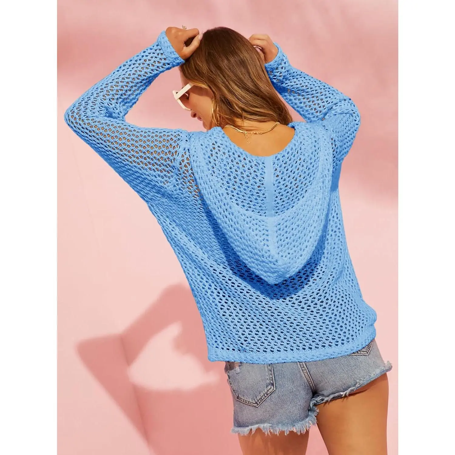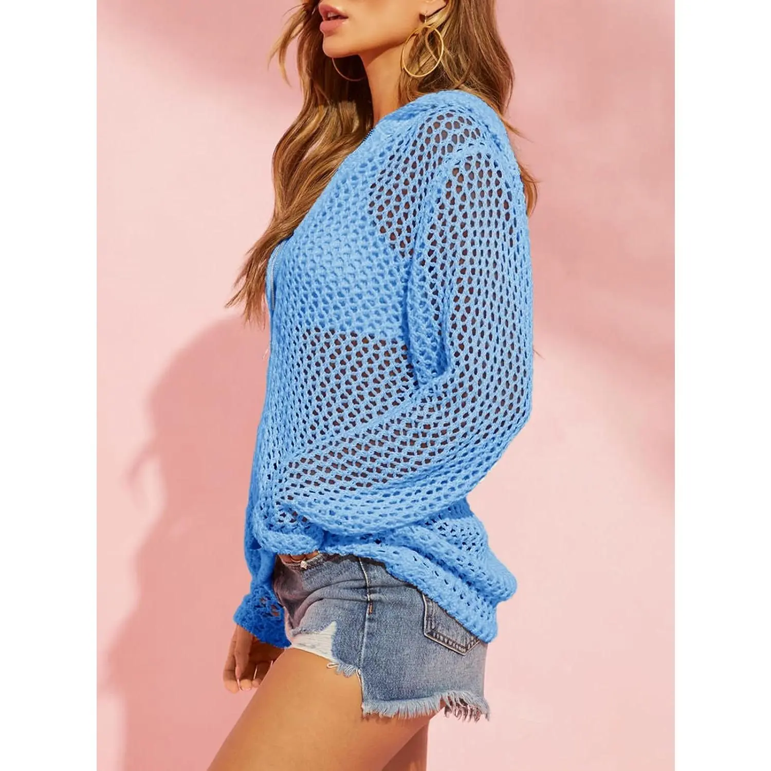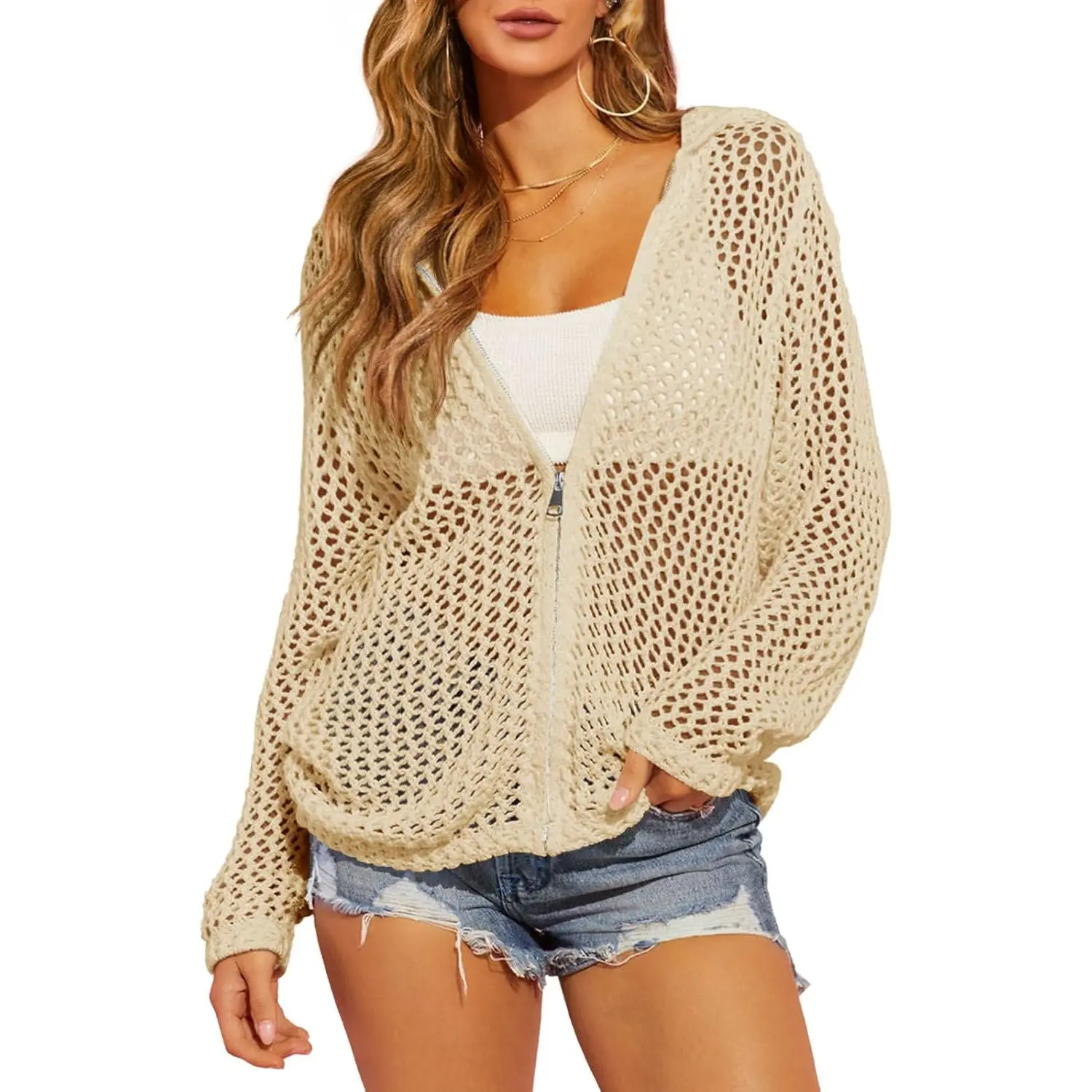 ·Features: Zip-up hooded, long sleeve, open front, solid color, loose fit, fishnetted, and soft knitted. It's a boho sweater, kimono cover-up, and sheer beach coverup. 🧶