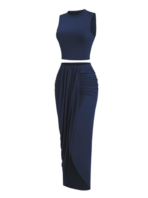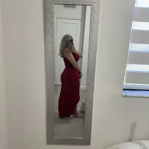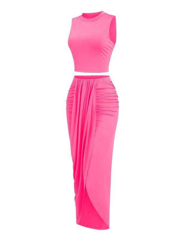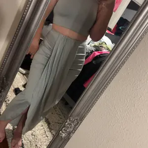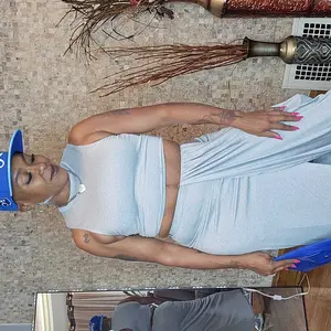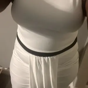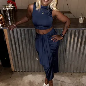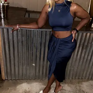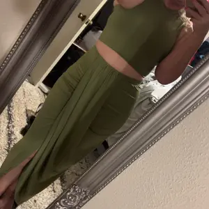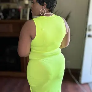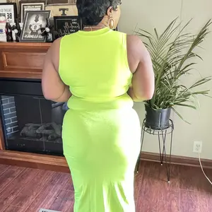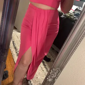 it's a beautiful vibrant 2pc with drape side split very comfortable made of great quality material because it's not see through. I recommend to spice things up in your closet
