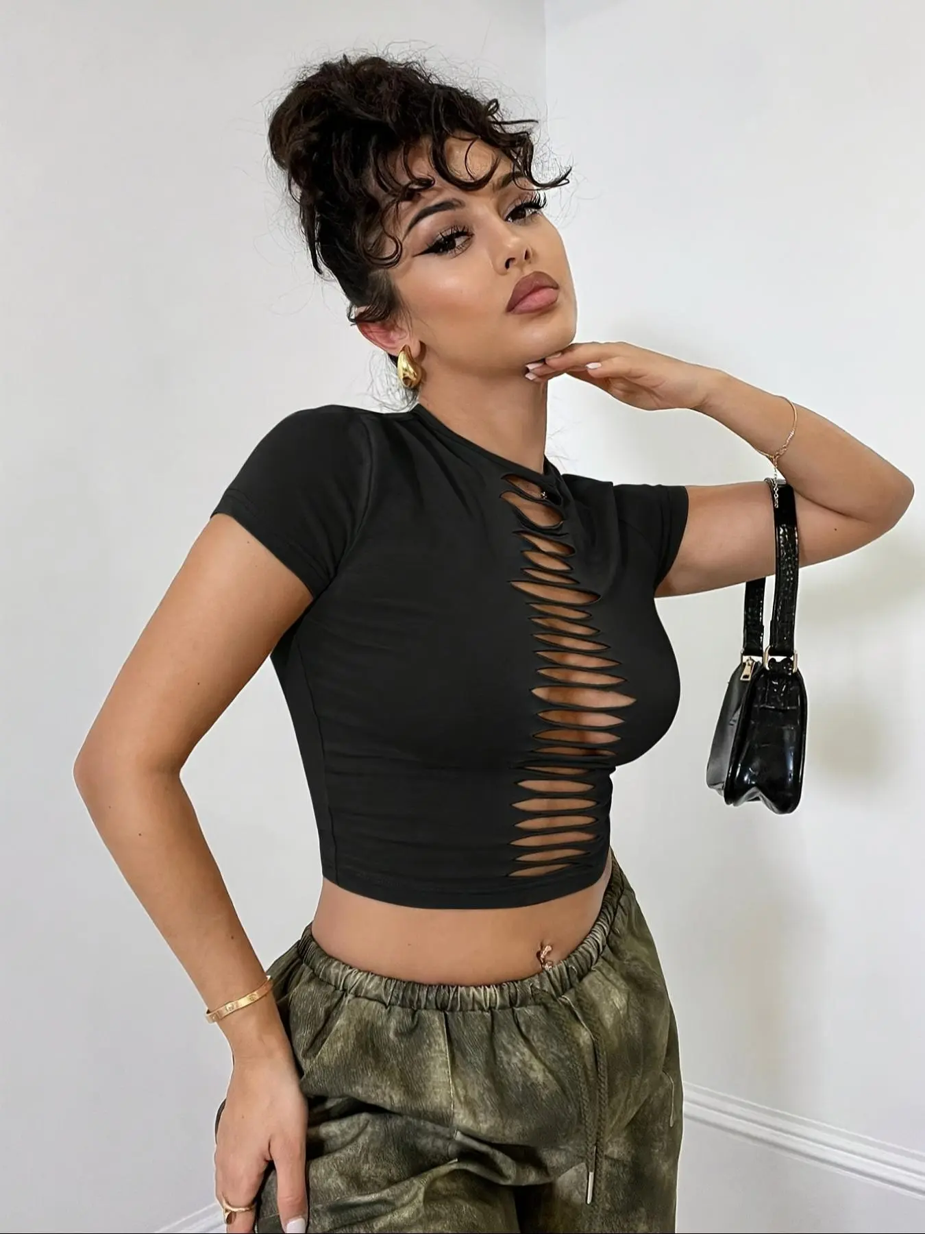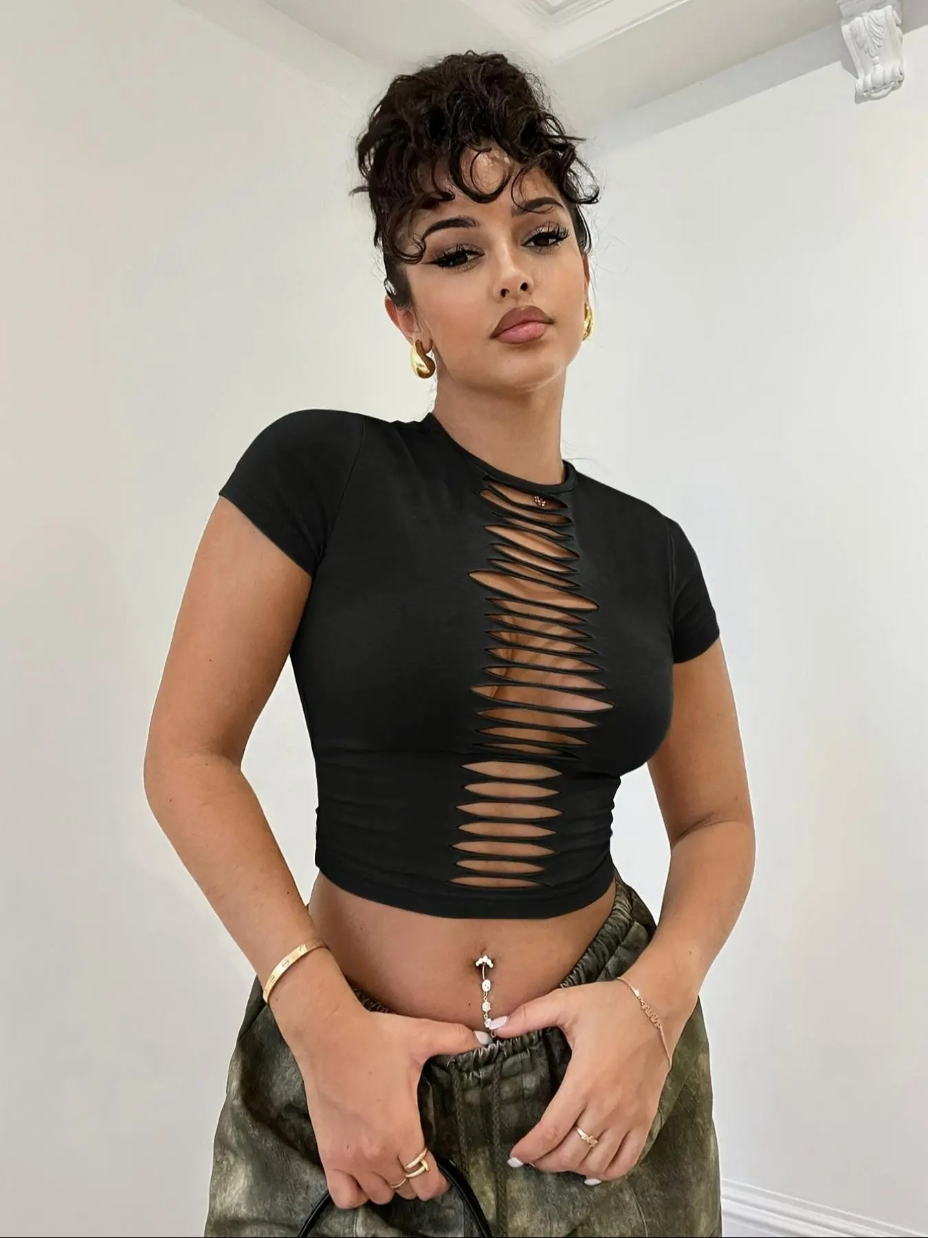 Women's Plain Hollow Out Round Neck Crop Tee, Casual Sexy Short Sleeve Crew Neck T-shirt for Summer, Fashion Women's Top for Daily Wear, Womenswear #Women's #Plain #Hollow #Out #Round #Neck #Crop #Tee, #Casual #Sexy #Short #Sleeve #Crew #T-shirt #for #Summer, #Fashion #Top #Daily #Wear, #Womenswear
